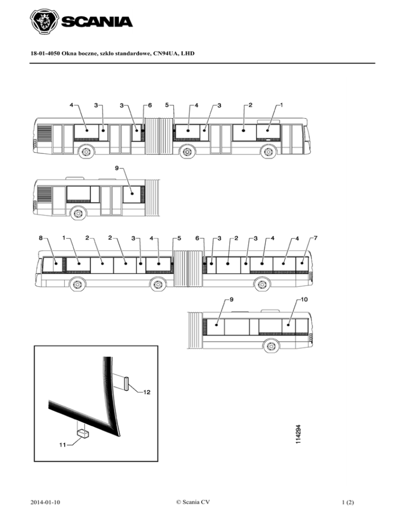 18-01-4050 Okna boczne, szkło standardowe, CN94UA, LHD 2014-01-10 © Scania CV 1 (2) 18-01-4050 Okna boczne, szkło standardowe, CN94UA, LHD Nr serii CH -1839112 SBK CH -1843282 SSS Lp. Nr części Uwagi A Opis 1 483984 rq Okno boczne 485155 Z otworem do uzupełniania paliwa. rq Okno boczne 2 3 4 5 6 7 8 8 483983 483986 483984 484420 484419 483985 474507 1500962 1725045 1725041 1725047 1725043 1725044 1933384 assy assy fr L=4000 mm L=4000, rq=3600 rear 4 6 5 2 2 1 1 1 1 1 1 2 1 4 Okno boczne Okno boczne Okno boczne Okno boczne Okno boczne Okno boczne Szkło Szkło •Szkło •Listwa •Szkło •Śruba •Uchwyt •Listwa prowadząca 9 10 484361 Krótki zwis ramy z tyłu. 484363 Krótki zwis ramy z tyłu. 2 Okno boczne 1 Okno boczne 11 12 467843 467860 L=10000 mm rq Element dystansowy rq Listwa 2014-01-10 © Scania CV 2 (2)