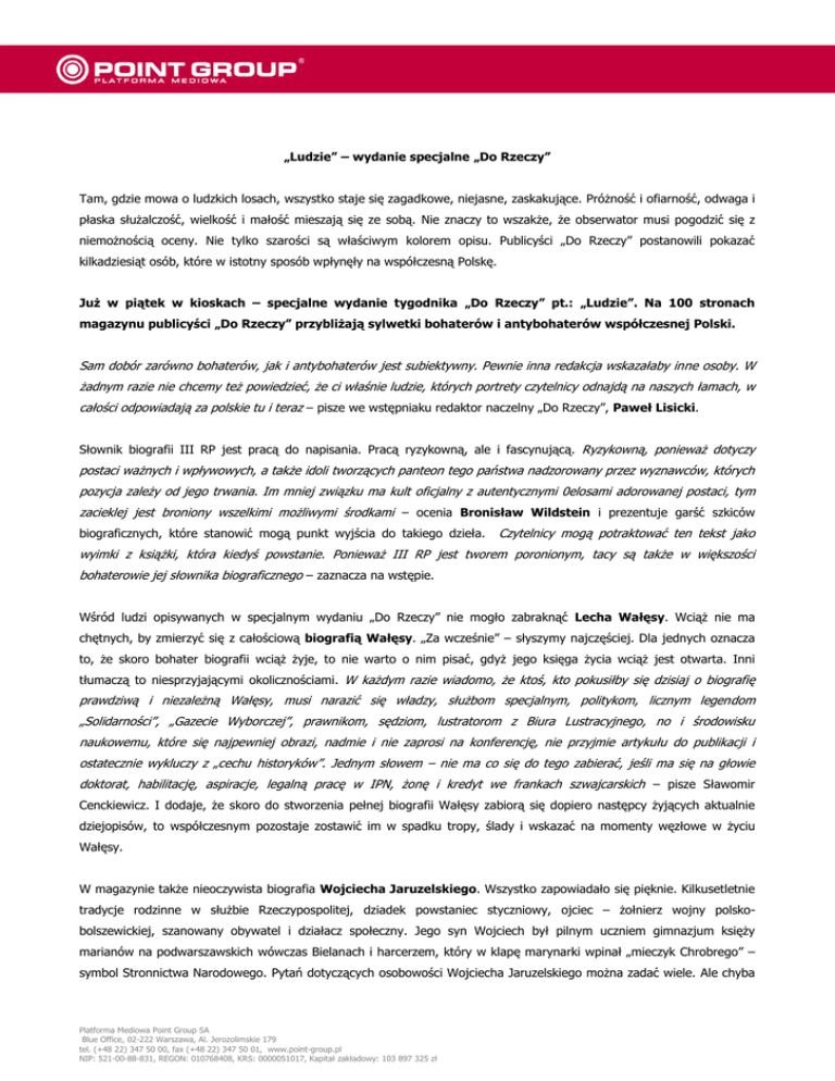 „Ludzie” – wydanie specjalne „Do Rzeczy” Tam, gdzie mowa o ludzkich losach, wszystko staje się zagadkowe, niejasne, zaskakujące. Próżność i ofiarność, odwaga i płaska służalczość, wielkość i małość mieszają się ze sobą. Nie znaczy to wszakże, że obserwator musi pogodzić się z niemożnością oceny. Nie tylko szarości są właściwym kolorem opisu. Publicyści „Do Rzeczy” postanowili pokazać kilkadziesiąt osób, które w istotny sposób wpłynęły na współczesną Polskę. Już w piątek w kioskach – specjalne wydanie tygodnika „Do Rzeczy” pt.: „Ludzie”. Na 100 stronach magazynu publicyści „Do Rzeczy” przybliżają sylwetki bohaterów i antybohaterów współczesnej Polski. Sam dobór zarówno bohaterów, jak i antybohaterów jest subiektywny. Pewnie inna redakcja wskazałaby inne osoby. W żadnym razie nie chcemy też powiedzieć, że ci właśnie ludzie, których portrety czytelnicy odnajdą na naszych łamach, w całości odpowiadają za polskie tu i teraz – pisze we wstępniaku redaktor naczelny „Do Rzeczy”, Paweł Lisicki. Słownik biografii III RP jest pracą do napisania. Pracą ryzykowną, ale i fascynującą. Ryzykowną, ponieważ dotyczy postaci ważnych i wpływowych, a także idoli tworzących panteon tego państwa nadzorowany przez wyznawców, których pozycja zależy od jego trwania. Im mniej związku ma kult oficjalny z autentycznymi 0elosami adorowanej postaci, tym zacieklej jest broniony wszelkimi możliwymi środkami – ocenia Bronisław Wildstein i prezentuje garść szkiców biograficznych, które stanowić mogą punkt wyjścia do takiego dzieła. Czytelnicy mogą potraktować ten tekst jako wyimki z książki, która kiedyś powstanie. Ponieważ III RP jest tworem poronionym, tacy są także w większości bohaterowie jej słownika biograficznego – zaznacza na wstępie. Wśród ludzi opisywanych w specjalnym wydaniu „Do Rzeczy” nie mogło zabraknąć Lecha Wałęsy. Wciąż nie ma chętnych, by zmierzyć się z całościową biografią Wałęsy. „Za wcześnie” – słyszymy najczęściej. Dla jednych oznacza to, że skoro bohater biografii wciąż żyje, to nie warto o nim pisać, gdyż jego księga życia wciąż jest otwarta. Inni tłumaczą to niesprzyjającymi okolicznościami. W każdym razie wiadomo, że ktoś, kto pokusiłby się dzisiaj o biografię prawdziwą i niezależną Wałęsy, musi narazić się władzy, służbom specjalnym, politykom, licznym legendom „Solidarności”, „Gazecie Wyborczej”, prawnikom, sędziom, lustratorom z Biura Lustracyjnego, no i środowisku naukowemu, które się najpewniej obrazi, nadmie i nie zaprosi na konferencję, nie przyjmie artykułu do publikacji i ostatecznie wykluczy z „cechu historyków”. Jednym słowem – nie ma co się do tego zabierać, jeśli ma się na głowie doktorat, habilitację, aspiracje, legalną pracę w IPN, żonę i kredyt we frankach szwajcarskich – pisze Sławomir Cenckiewicz. I dodaje, że skoro do stworzenia pełnej biografii Wałęsy zabiorą się dopiero następcy żyjących aktualnie dziejopisów, to współczesnym pozostaje zostawić im w spadku tropy, ślady i wskazać na momenty węzłowe w życiu Wałęsy. W magazynie także nieoczywista biografia Wojciecha Jaruzelskiego. Wszystko zapowiadało się pięknie. Kilkusetletnie tradycje rodzinne w służbie Rzeczypospolitej, dziadek powstaniec styczniowy, ojciec – żołnierz wojny polskobolszewickiej, szanowany obywatel i działacz społeczny. Jego syn Wojciech był pilnym uczniem gimnazjum księży marianów na podwarszawskich wówczas Bielanach i harcerzem, który w klapę marynarki wpinał „mieczyk Chrobrego” – symbol Stronnictwa Narodowego. Pytań dotyczących osobowości Wojciecha Jaruzelskiego można zadać wiele. Ale chyba Platforma Mediowa Point Group SA Blue Office, 02-222 Warszawa, Al. Jerozolimskie 179 tel. (+48 22) 347 50 00, fax (+48 22) 347 50 01, www.point-group.pl NIP: 521-00-88-831, REGON: 010768408, KRS: 0000051017, Kapitał zakładowy: 103 897 325 zł najważniejsze dotyczy kwestii, jak to było możliwe, że człowiek urodzony w „genetycznie” patriotycznej rodzinie zszedł na drogę narodowego zaprzaństwa – pyta i próbuje odpowiedzieć Piotr Gontarczyk. A Piotr Semka twierdzi, że Platforma ma problem. W udany sposób co prawda wypchnęła lidera PiS z polityki, ale z popularnością Jarosława Kaczyńskiego nie da się walczyć tak jak z innymi politykami. U władzy stricte politycznej przez 23 lata istnienia III RP Kaczyński był tylko rok i cztery miesiące. Ale z perspektywy tych dwóch dekad to on stworzył świat wyobrażeń i mitologii wyborców polskiej prawicy. Czyli statystycznie rzecz biorąc, po 1989 r. Jarosław Kaczyński dłużej odgrywa rolę Króla-Ducha niż skutecznego polityka. Być może dlatego lider PiS jest ostro zwalczany i niecierpiany. Zarówno przez ideologów lewicy, jak i rywali z partii konserwatywnych, którzy oburzają się, że „żoliborski lewak ukradł Polsce prawicę”. Z jakichś powodów jednak zwykły patriotyczno-katolicki elektorat w kolejnych wyborach od ponad dekady premiuje właśnie jego. Dlaczego? Próba odpowiedzi w specjalnym wydaniu „Do Rzeczy”. Alfabet III RP byłby niepełny bez sylwetki obecnego szefa rządu . Donald Tusk być może byłby niezłym premierem w spokojnych czasach w ustabilizowanym państwie. Ale Polska nie jest takim krajem, a czasy nie są dobre. Mamy pecha: rządzi nami człowiek o kwalifikacjach na dobrego akwizytora, ale nie męża stanu – pisze Piotr Gursztyn. Jego zdaniem, rządzi nami polityk bezwzględny, czasem okrutny, zręczny i przebiegły, któremu obca jest jednak powaga miejsca, w którym się znalazł. Jest inteligentniejszy i bardziej chytry od większości polskich polityków. Cała jednak reszta – mówimy tu o gronie liderów politycznych – to ludzie, u których w momentach krytycznych cynizm i karierowiczostwo ustępowały