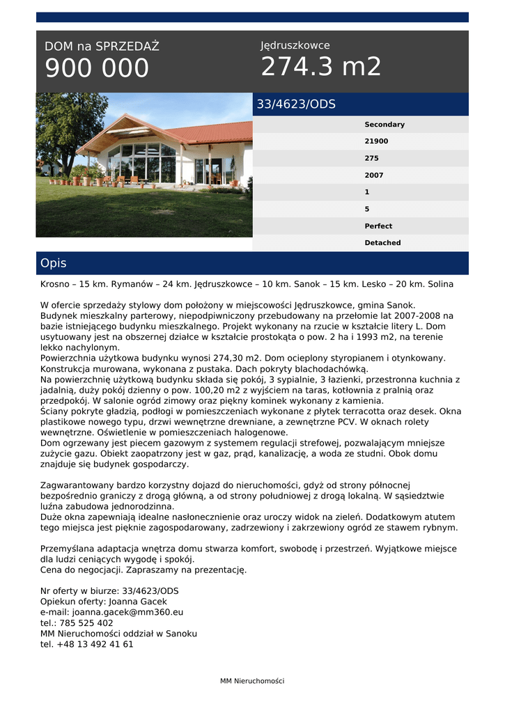 DOM na SPRZEDAŻ 900 000 Jędruszkowce 274.3 m2 33/4623/ODS Secondary 21900 275 2007 1 5 Perfect Detached Opis Krosno – 15 km. Rymanów – 24 km. Jędruszkowce – 10 km. Sanok – 15 km. Lesko – 20 km. Solina W ofercie sprzedaży stylowy dom położony w miejscowości Jędruszkowce, gmina Sanok. Budynek mieszkalny parterowy, niepodpiwniczony przebudowany na przełomie lat 2007-2008 na bazie istniejącego budynku mieszkalnego. Projekt wykonany na rzucie w kształcie litery L. Dom usytuowany jest na obszernej działce w kształcie prostokąta o pow. 2 ha i 1993 m2, na terenie lekko nachylonym. Powierzchnia użytkowa budynku wynosi 274,30 m2. Dom ocieplony styropianem i otynkowany. Konstrukcja murowana, wykonana z pustaka. Dach pokryty blachodachówką. Na powierzchnię użytkową budynku składa się pokój, 3 sypialnie, 3 łazienki, przestronna kuchnia z jadalnią, duży pokój dzienny o pow. 100,20 m2 z wyjściem na taras, kotłownia z pralnią oraz przedpokój. W salonie ogród zimowy oraz piękny kominek wykonany z kamienia. Ściany pokryte gładzią, podłogi w pomieszczeniach wykonane z płytek terracotta oraz desek. Okna plastikowe nowego typu, drzwi wewnętrzne drewniane, a zewnętrzne PCV. W oknach rolety wewnętrzne. Oświetlenie w pomieszczeniach halogenowe. Dom ogrzewany jest piecem gazowym z systemem regulacji strefowej, pozwalającym mniejsze zużycie gazu. Obiekt zaopatrzony jest w gaz, prąd, kanalizację, a woda ze studni. Obok domu znajduje się budynek gospodarczy. Zagwarantowany bardzo korzystny dojazd do nieruchomości, gdyż od strony północnej bezpośrednio graniczy z drogą główną, a od strony południowej z drogą lokalną. W sąsiedztwie luźna zabudowa jednorodzinna. Duże okna zapewniają idealne nasłonecznienie oraz uroczy widok na zieleń. Dodatkowym atutem tego miejsca jest pięknie zagospodarowany, zadrzewiony i zakrzewiony ogród ze stawem rybnym. Przemyślana adaptacja wnętrza domu stwarza komfort, swobodę i przestrzeń. Wyjątkowe miejsce dla ludzi ceniących wygodę i spokój. Cena do negocjacji. Zapraszamy na prezentację. Nr oferty w biurze: 33/4623/ODS Opiekun oferty: Joanna Gacek e-mail: [email protected] tel.: 785 525 402 MM Nieruchomości oddział w Sanoku tel. +48 13 492 41 61 MM Nieruchomości +48 881-799-704 ZAPŁACISZ TYLKO WTEDY, KIEDY OKAŻEMY SIĘ SKUTECZNI! MM 360 tel. +48 881 799 704; +48 13 492 41 61 email: [email protected] MM Nieruchomości Powered by TCPDF (www.tcpdf.org)