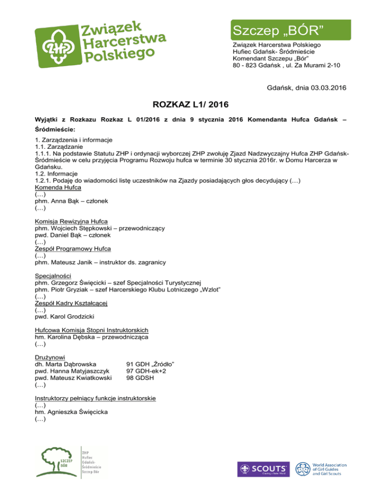 Szczep „BÓR” Związek Harcerstwa Polskiego Hufiec Gdańsk- Śródmieście Komendant Szczepu „Bór” 80 - 823 Gdańsk , ul. Za Murami 2-10 Gdańsk, dnia 03.03.2016 ROZKAZ L1/ 2016 Wyjątki z Rozkazu Rozkaz L 01/2016 z dnia 9 stycznia 2016 Komendanta Hufca Gdańsk – Śródmieście: 1. Zarządzenia i informacje 1.1. Zarządzanie 1.1.1. Na podstawie Statutu ZHP i ordynacji wyborczej ZHP zwołuję Zjazd Nadzwyczajny Hufca ZHP GdańskŚródmieście w celu przyjęcia Programu Rozwoju hufca w terminie 30 stycznia 2016r. w Domu Harcerza w Gdańsku. 1.2. Informacje 1.2.1. Podaję do wiadomości listę uczestników na Zjazdy posiadających głos decydujący (…) Komenda Hufca (…) phm. Anna Bąk – członek (…) Komisja Rewizyjna Hufca phm. Wojciech Stępkowski – przewodniczący pwd. Daniel Bąk – członek (…) Zespół Programowy Hufca (…) phm. Mateusz Janik – instruktor ds. zagranicy Specjalności phm. Grzegorz Święcicki – szef Specjalności Turystycznej phm. Piotr Gryziak – szef Harcerskiego Klubu Lotniczego „Wzlot” (…) Zespół Kadry Kształcącej (…) pwd. Karol Grodzicki Hufcowa Komisja Stopni Instruktorskich hm. Karolina Dębska – przewodnicząca (…) Drużynowi dh. Marta Dąbrowska pwd. Hanna Matyjaszczyk pwd. Mateusz Kwiatkowski (…) 91 GDH „Źródło” 97 GDH-ek+2 98 GDSH Instruktorzy pełniący funkcje instruktorskie (…) hm. Agnieszka Święcicka (…) Wyjątki z Rozkazu Rozkaz L 02/2016 z dnia 29 stycznia 2016 Komendanta Hufca Gdańsk – Śródmieście: 1. Zarządzenia i informacje 1.2. Informacje 1.2.1. Podaję do wiadomości listę uzupełniającą uczestników na Zjazd Nadzwyczajny posiadających głos decydujący Drużynowi dh. Julia Stencel 9 GGZ Zuchy Lasu pwd. Monika Gołębiowska 91 GGZ Smerfna Kraina sam. Angelika Kalbarczyk 92 GDH Czarne Klony im. Józefa Grzesiaka „Czarnego” (…) 2. SZCZEP 2.2 Mianowania w Szczepie 2.2.1 Mianuję na funkcję zastępcy komendanta Szczepu pwd. Karola Grodzickiego HO 2.2.2 Mianuję na funkcję zastępcy komendanta Szczepu phm. Piotra Gryziaka HO 2.2.3 Mianuję na funkcję zastępcy komendanta Szczepu phm. Mateusza Janika HO Z dniem 20.02.2016 powołuję komendę Szczepu Bór w składzie phm. Grzegorz Święcicki HR – komendant Szczepu pwd. Karol Grodzicki HO – zastępca komendanta Szczepu phm. Piotr Gryziak HO – zastępca komendanta Szczepu phm. Mateusz Janik HO – zastępca komendanta Szczepu 4. PRZYZNANIE STOPNI, SPRAWNOŚCI, ZNAKÓW SŁUŻB, UPRAWNIEŃ, ODZNAK, ZALICZENIE ZADAŃ I PROJEKTÓW. 4.1 Otwarcie prób na stopnie. 4.1.1 Na wniosek Kapituły Stopni Szczepu Bór z dnia 03.03.2016 otwieram próbę na stopień Harcerza Orlego dh. Dawidowi Lachowi – opiekun phm. Piotr Gryziak HO 4.2 Zamknięcie prób i przyznanie stopni. 4.2.1 Na wniosek Kapituły Stopni Szczepu Bór z dnia 06.01.2016 zamykam próbę wędrowniczą z wynikiem pozytywnym i nadaję naramiennik wędrowniczy: dh. Jolancie Reszczyńskiej – opiekun sam. Marta Dąbrowska, dh. Mateuszowi Pogorzelskiemu – opiekun sam. Marta Dąbrowska. 4.2.2 Na wniosek Kapituły Stopni Szczepu Bór z dnia 06.01.2016 zamykam próbę i przyznaję stopień Harcerki Orlej: sam. Angelice Kalbarczyk – opiekun phm. Jacek Grzebielucha HO. 4.2.3 Na wniosek Kapituły Stopni Szczepu Bór z dnia 03.03.2016 zamykam próbę wędrowniczą z wynikiem pozytywnym i nadaję naramiennik wędrowniczy : dh. Markowi Matyjaszczykowi - opiekun phm. Mateusz Janik HO. Z harcerskim pozdrowieniem CZUWAJ! z upoważnienia phm. Piotr Gryziak HO za-ca Komendanta Szczepu „Bór”