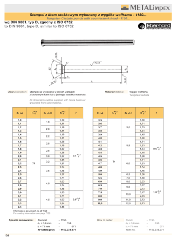 Stempel z łbem stożkowym wykonany z węglika wolframu - 1150... Tungsten Carbide punch with countersunk head - 1150... wg DIN 9861, typ D, zgodny z ISO 6752 to DIN 9861, type D, similar to ISO 6752 Opis/Description: Materiał/Material: Stemple są wykonane w dwóch wersjach z lutowanym łbem lub z jednego kawałka materiału. Węglik wolframu Tungsten Carbide All dimensions will be supplied with braze heads or grounded from solid material. d1 h6 +0,5 0 l1 1,0 ±0,05 1,8 1,1 1,2 2,0 1,3 1,4 2,2 1,5 1,6 2,5 1,7 1,8 2,8 1,9 2,0 3,0 2,1 2,2 d2 71 3,2 2,3 2,4 +0,2 0 h r d1 h6 1,19 3,5 1,11 3,6 1,19 3,7 +0,5 0 l1 d2 ±0,1 +0,2 0 h 1,80 1,71 5,0 1,63 1,11 3,8 1,54 1,19 3,9 1,45 1,11 4,0 1,80 1,28 4,1 1,19 4,2 1,37 4,3 1,54 4,4 1,45 4,5 1,80 1,28 1,37 0,4 +0,3 0 1,45 4,6 1,37 4,7 1,54 4,8 1,71 5,5 71 1,63 4,9 5,0 6,5 1,80 2,6 1,71 5,5 7,0 1,80 2,7 1,63 6,0 8,0 2,23 1,54 6,5 2,9 1,45 7,0 3,0 1,80 7,5 3,1 3,2 1,71 4,5 1,63 3,3 1,54 3,4 1,45 +0,4 0 0,6 8,0 1,0 +0,5 0 1,54 1,37 4,0 +0,4 0 1,63 1,45 2,8 0,6 1,71 6,0 2,5 3,5 r 1,45 9,0 10,0 3,17 2,73 3,17 2,73 9,0 11,0 2,73 10,0 12,0 2,73 How to order: Punch d1 = 3,8 mm l1 = 71 mm Item no. Informacje o powłokach na str F/28 For coating information see page F/28 Sposób zamawiania: E/8 Stempel d1 = 3,8 mm l1 = 71 mm Nr katalogowy - 1150. 038. 071 - 1150.038.071 - 1150. 038. 071 - 1150.038.071