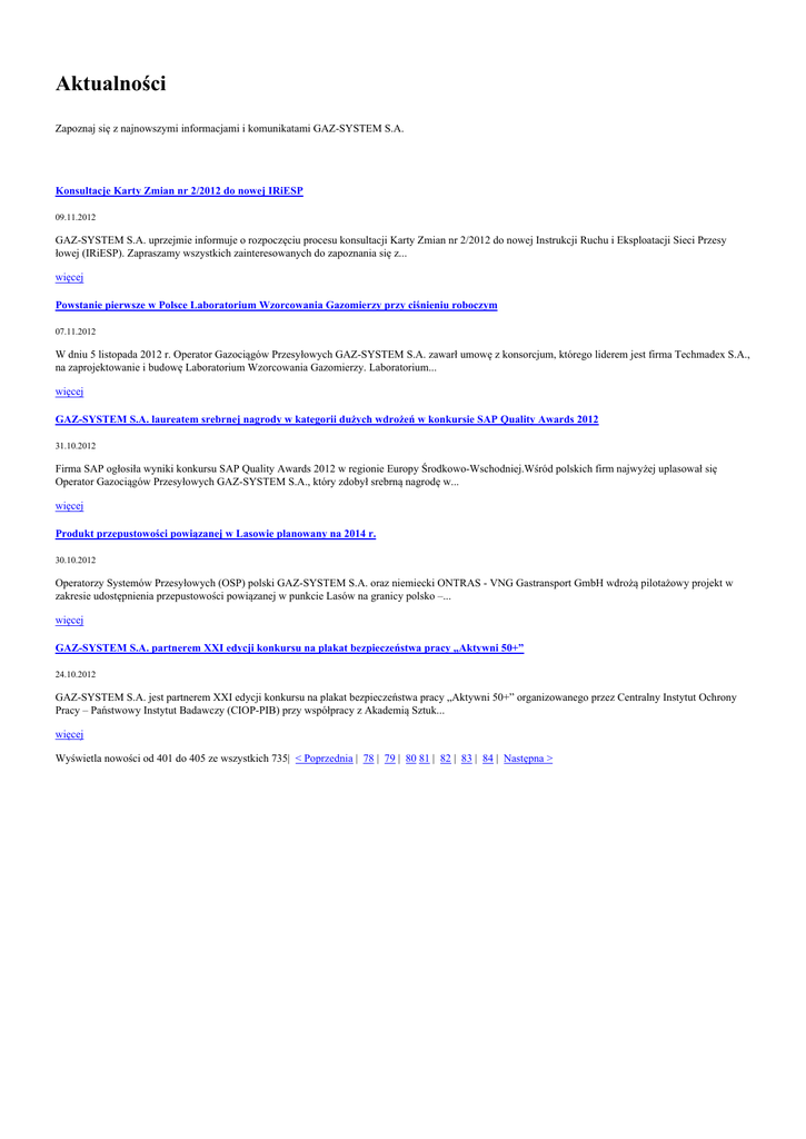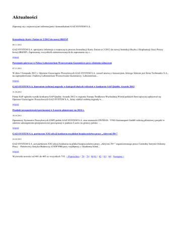 Aktualności Zapoznaj się z najnowszymi informacjami i komunikatami GAZ-SYSTEM S.A. Konsultacje Karty Zmian nr 2/2012 do nowej IRiESP 09.11.2012 GAZ-SYSTEM S.A. uprzejmie informuje o rozpoczęciu procesu konsultacji Karty Zmian nr 2/2012 do nowej Instrukcji Ruchu i Eksploatacji Sieci Przesy łowej (IRiESP). Zapraszamy wszystkich zainteresowanych do zapoznania się z... więcej Powstanie pierwsze w Polsce Laboratorium Wzorcowania Gazomierzy przy ciśnieniu roboczym 07.11.2012 W dniu 5 listopada 2012 r. Operator Gazociągów Przesyłowych GAZ-SYSTEM S.A. zawarł umowę z konsorcjum, którego liderem jest firma Techmadex S.A., na zaprojektowanie i budowę Laboratorium Wzorcowania Gazomierzy. Laboratorium... więcej GAZ-SYSTEM S.A. laureatem srebrnej nagrody w kategorii dużych wdrożeń w konkursie SAP Quality Awards 2012 31.10.2012 Firma SAP ogłosiła wyniki konkursu SAP Quality Awards 2012 w regionie Europy Środkowo-Wschodniej.Wśród polskich firm najwyżej uplasował się Operator Gazociągów Przesyłowych GAZ-SYSTEM S.A., który zdobył srebrną nagrodę w... więcej Produkt przepustowości powiązanej w Lasowie planowany na 2014 r. 30.10.2012 Operatorzy Systemów Przesyłowych (OSP) polski GAZ-SYSTEM S.A. oraz niemiecki ONTRAS - VNG Gastransport GmbH wdrożą pilotażowy projekt w zakresie udostępnienia przepustowości powiązanej w punkcie Lasów na granicy polsko –... więcej GAZ-SYSTEM S.A. partnerem XXI edycji konkursu na plakat bezpieczeństwa pracy „Aktywni 50+” 24.10.2012 GAZ-SYSTEM S.A. jest partnerem XXI edycji konkursu na plakat bezpieczeństwa pracy „Aktywni 50+” organizowanego przez Centralny Instytut Ochrony Pracy – Państwowy Instytut Badawczy (CIOP-PIB) przy współpracy z Akademią Sztuk... więcej Wyświetla nowości od 401 do 405 ze wszystkich 735| < Poprzednia | 78 | 79 | 80 81 | 82 | 83 | 84 | Następna >