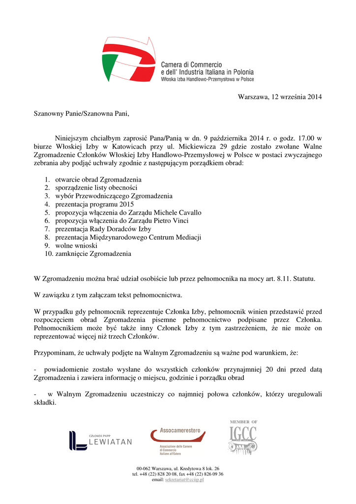 Warszawa, 12 września 2014 Szanowny Panie/Szanowna Pani, Niniejszym chciałbym zaprosić Pana/Panią w dn. 9 października 2014 r. o godz. 17.00 w biurze Włoskiej Izby w Katowicach przy ul. Mickiewicza 29 gdzie zostało zwołane Walne Zgromadzenie Członków Włoskiej Izby Handlowo-Przemysłowej w Polsce w postaci zwyczajnego zebrania aby podjąć uchwały zgodnie z następującym porządkiem obrad: 1. otwarcie obrad Zgromadzenia 2. sporządzenie listy obecności 3. wybór Przewodniczącego Zgromadzenia 4. prezentacja programu 2015 5. propozycja włączenia do Zarządu Michele Cavallo 6. propozycja włączenia do Zarządu Pietro Vinci 7. prezentacja Rady Doradców Izby 8. prezentacja Międzynarodowego Centrum Mediacji 9. wolne wnioski 10. zamknięcie Zgromadzenia W Zgromadzeniu można brać udział osobiście lub przez pełnomocnika na mocy art. 8.11. Statutu. W zawiązku z tym załączam tekst pełnomocnictwa. W przypadku gdy pełnomocnik reprezentuje Członka Izby, pełnomocnik winien przedstawić przed rozpoczęciem obrad Zgromadzenia pisemne pełnomocnictwo podpisane przez Członka. Pełnomocnikiem może być także inny Członek Izby z tym zastrzeżeniem, że nie może on reprezentować więcej niż trzech Członków. Przypominam, że uchwały podjęte na Walnym Zgromadzeniu są ważne pod warunkiem, że: - powiadomienie zostało wysłane do wszystkich członków przynajmniej 20 dni przed datą Zgromadzenia i zawiera informację o miejscu, godzinie i porządku obrad w Walnym Zgromadzeniu uczestniczy co najmniej połowa członków, którzy uregulowali składki. MEMBER OF 00-062 Warszawa, ul. Kredytowa 8 lok. 26 tel. +48 (22) 828 20 08, fax +48 (22) 826 09 36 email: [email protected] W przypadku nie spełnienia tych warunków, Zgromadzenie zostaje zwołane ponownie stosownie do postanowienia z art. 8.7.b Statutu, na ten sam dzień na godz. 17:30 (drugie zwołanie wyżej wspomniane) w tym samym miejscu. Dla ważności uchwał drugiego zwołania wystarczy obecność 1/10 wszystkich członków. Z powodów organizacyjnych, prosimy o Pana/Panią o pisemne potwierdzenie obecności (email lub fax) do dn. 2 października 2014 r. Pragniemy przypomnieć, że wszystkie firmy członkowskie mogą uczestniczyć w Zgromadzeniu tylko jeśli uregulowały składki członkowskie. W oczekiwaniu na Pana/Pani odpowiedź, przesyłam serdeczne pozdrowienia. Piero Cannas Przewodniczący MEMBER OF 00-062 Warszawa, ul. Kredytowa 8 lok. 26 tel. +48 (22) 828 20 08, fax +48 (22) 826 09 36 email: [email protected]