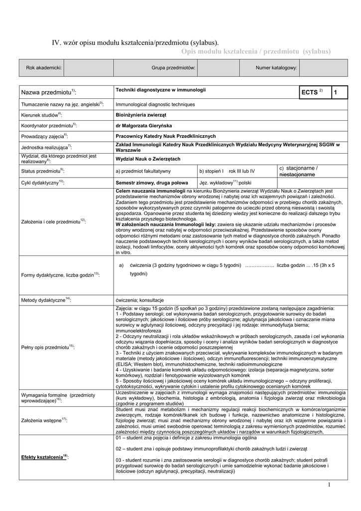 IV. wzór opisu modułu kształcenia/przedmiotu (sylabus). Opis modułu kształcenia / przedmiotu (sylabus) Grupa przedmiotów: Rok akademicki: Numer katalogowy: Nazwa przedmiotu1): Techniki diagnostyczne w immunologii Tłumaczenie nazwy na jęz. angielski3): Immunological diagnostic techniques Kierunek studiów4): Bioinżynieria zwierząt 5) ECTS 2) 1 dr Małgorzata Gieryńska Koordynator przedmiotu : 6) Prowadzący zajęcia : Pracownicy Katedry Nauk Przedklinicznych Jednostka realizująca7): Zakład Immunologii Katedry Nauk Przedklinicznych Wydziału Medycyny Weterynaryjnej SGGW w Warszawie Wydział, dla którego przedmiot jest realizowany8): Wydział Nauk o Zwierzętach Status przedmiotu9): a) przedmiot fakultatywny 10) b) stopień I rok III lub IV c) stacjonarne / niestacjonarne 11) Cykl dydaktyczny : Semestr zimowy, druga połowa Założenia i cele przedmiotu12): Celem nauczania immunologii na kierunku Bionżynieria zwierząt Wydziału Nauk o Zwierzętach jest przedstawienie mechanizmów obrony wrodzonej i nabytej oraz ich wzajemnych powiązań i zależności. Zadaniem tego przedmiotu jest przedstawienie mechanizmów odporności w przebiegu chorób zakaźnych, sposobów wykorzystywanych przez czynniki patogenne do ucieczki przed obroną nieswoistą i swoistą gospodarza. Opanowanie przez studenta tej dziedziny wiedzy jest konieczne do realizacji dalszego trybu kształcenia przyszłego biotechnologa. W założeniach nauczania Immunologii leży: zawiera się ukazanie udziału mechanizmów i procesów obrony wrodzonej oraz nabytej w odporności przeciwzakaźnej. Przedstawienie sposobów oceny odporności różnymi metodami oraz zastosowanie tych metod w diagnostyce chorób zakaźnych. Ponadto nauczenie podstawowych technik serologicznych i oceny wyników badań serologicznych, a także metod izolacji, hodowli limfocytów, oceny aktywności tych komórek oraz sposobów oceny odporności komórkowej in vitro. a) 13) Formy dydaktyczne, liczba godzin : Metody dydaktyczne14): Pełny opis przedmiotu15): Wymagania formalne (przedmioty wprowadzające)16): Założenia wstępne17): Jęz. wykładowy :polski ćwiczenia (3 godziny tygodniowo w ciągu 5 tygodni) ……………… liczba godzin ... .15 (3h x 5 tygodni) ćwiczenia; konsultacje Zajęcia: w ciągu 15 godzin (5 spotkań po 3 godziny) przedstawione zostaną następujące zagadnienia: 1 - Podstawy serologii; cel wykonywania badań serologicznych, przygotowanie surowicy do badań serologicznych; jakościowe i ilościowe próby serologiczne; aglutynacja jakościowa i oznaczanie miana surowicy w aglutynacji ilościowej, odczyny precypitacji i jej rodzaje: immunodyfuzja bierna; immunoelektroforeza 2 - Odczyny neutralizacji i rola układów wskaźnikowych w próbach serologicznych, zasada i cel wykonania odczynu wiązania dopełniacza, sposoby i oceny i analiza wyników badań serologicznych w diagnostyce chorób zakaźnych i ocenie odporności poszczepiennej 3 - Techniki z użyciem znakowanych przeciwciał, wykrywanie kompleksów immunologicznych w badanym materiale (metody jakościowe i ilościowe), odczyn immunofluorescencji; techniki immunoenzymatyczne (ELISA; Western blot), immunohistochemiczne, techniki radioimmunologiczne 4 - Uzyskiwanie i badanie komórek układu odpornościowego: izolacja (separacja magnetyczna, sorter komórkowy), rozdział i fenotypowanie wyizolowanych komórek 5 - Sposoby ilościowej i jakościowej oceny komórek układu immunologicznego – odczyny proliferacji, cytotoksyczności, wykrywanie cytokin i ustalenie profilu cytokinowego ocenianych komórek Uczestniczenie w zajęciach z immunologii wymaga znajomości następujących przedmiotów: immunologia (kurs wykładowy), biochemia, histologia z embriologią, anatomia i fizjologia zwierząt oraz mikrobiologia (zgodnie z programem studiów) Student musi znać metabolizm i mechanizmy regulacji reakcji biochemicznych w komórce/organizmie zwierzęcym, rodzaje komórek/tkanek ich budowę i funkcje, nazewnictwo anatomiczne i histologiczne, fizjologię zwierząt; musi znać mechanizmy obrony wrodzonej i nabytej oraz ich wzajemne powiązania i zależności, musi umieć swobodnie operować terminologią z zakresu wymienionych przedmiotów, rozumieć zależności między czynnością poszczególnych układów i narządów w warunkach fizjologicznych, 01 – student zna pojęcia i definicje z zakresu immunologia ogólna 02 – student zna i opisuje podstawy immunoprofilaktyki chorób zakaźnych ludzi i zwierząt 18) Efekty kształcenia : 03 - student rozumie i zna zastosowanie serologii w diagnostyce chorób zakaźnych; student potrafi przygotować surowicę do badań serologicznych i umie samodzielnie wykonać badanie jakościowe i ilościowe (odczyn aglutynacji, precypitacji, neutralizacji) 1 04 - student zna i rozumie zastosowanie przeciwciał monoklonalnych w diagnostyce chorób zakaźnych (odczyny immunofluorescencji, immunoenzymatyczne i radioimmunologiczne) –wykrywanie przeciwciał w surowicy pacjenta, lub identyfikacja czynnika zakaźnego 05 – student rozumie cel i zasady izolacji komórek immunokompetentnych, zna zasadę fenotypowania komórek, umie ocenić ich aktywność w warunkach in vitro 06 – student potrafi wykonać prostą próbę serologiczną i interpretować wyniki Sposób weryfikacji efektów kształcenia19): Efekty 01-06 egzamin pisemny opisowy Forma dokumentacji osiągniętych efektów kształcenia 20): Elementy i wagi mające wpływ na ocenę końcową21): Praca egzaminacyjna wraz z oceną przechowywana i udostępniana w miarę potrzeby, imienne karty oceny studenta Do egzaminu końcowego mogą przystąpić tylko ci studenci, którzy uczestniczyli w zajęciach Ocena końcowa przedmiotu Immunologia to ocena z egzaminu pisemnego o charakterze opisowym Miejsce realizacji zajęć22): Przedmiot jest realizowany w salach dydaktycznych Katedry Nauk Przedklinicznych Literatura podstawowa i uzupełniająca23): Literatura podstawowa23): 1. Immunologia pod