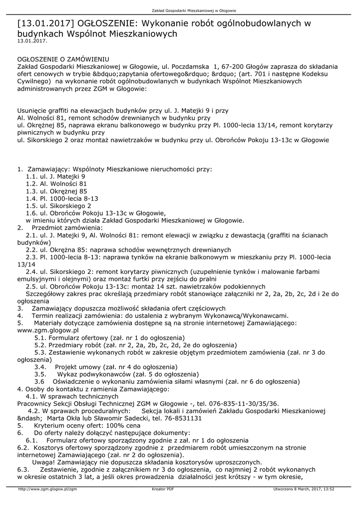 Zakład Gospodarki Mieszkaniowej w Głogowie [13.01.2017] OGŁOSZENIE: Wykonanie robót ogólnobudowlanych w budynkach Wspólnot Mieszkaniowych 13.01.2017. OGŁOSZENIE O ZAMÓWIENIU Zakład Gospodarki Mieszkaniowej w Głogowie, ul. Poczdamska 1, 67-200 Głogów zaprasza do składania ofert cenowych w trybie „zapytania ofertowego” ” (art. 701 i następne Kodeksu Cywilnego) na wykonanie robót ogólnobudowlanych w budynkach Wspólnot Mieszkaniowych administrowanych przez ZGM w Głogowie: Usunięcie graffiti na elewacjach budynków przy ul. J. Matejki 9 i przy Al. Wolności 81, remont schodów drewnianych w budynku przy ul. Okrężnej 85, naprawa ekranu balkonowego w budynku przy Pl. 1000-lecia 13/14, remont korytarzy piwnicznych w budynku przy ul. Sikorskiego 2 oraz montaż nawietrzaków w budynku przy ul. Obrońców Pokoju 13-13c w Głogowie 1. Zamawiający: Wspólnoty Mieszkaniowe nieruchomości przy: 1.1. ul. J. Matejki 9 1.2. Al. Wolności 81 1.3. ul. Okrężnej 85 1.4. Pl. 1000-lecia 8-13 1.5. ul. Sikorskiego 2 1.6. ul. Obrońców Pokoju 13-13c w Głogowie, w imieniu których działa Zakład Gospodarki Mieszkaniowej w Głogowie. 2. Przedmiot zamówienia: 2.1. ul. J. Matejki 9, Al. Wolności 81: remont elewacji w związku z dewastacją (graffiti na ścianach budynków) 2.2. ul. Okrężna 85: naprawa schodów wewnętrznych drewnianych 2.3. Pl. 1000-lecia 8-13: naprawa tynków na ekranie balkonowym w mieszkaniu przy Pl. 1000-lecia 13/14 2.4. ul. Sikorskiego 2: remont korytarzy piwnicznych (uzupełnienie tynków i malowanie farbami emulsyjnymi i olejnymi) oraz montaż furtki przy zejściu do pralni 2.5. ul. Obrońców Pokoju 13-13c: montaż 14 szt. nawietrzaków podokiennych Szczegółowy zakres prac określają przedmiary robót stanowiące załączniki nr 2, 2a, 2b, 2c, 2d i 2e do ogłoszenia 3. Zamawiający dopuszcza możliwość składania ofert częściowych 4. Termin realizacji zamówienia: do ustalenia z wybranym Wykonawcą/Wykonawcami. 5. Materiały dotyczące zamówienia dostępne są na stronie internetowej Zamawiającego: www.zgm.glogow.pl 5.1. Formularz ofertowy (zał. nr 1 do ogłoszenia) 5.2. Przedmiary robót (zał. nr 2, 2a, 2b, 2c, 2d, 2e do ogłoszenia) 5.3. Zestawienie wykonanych robót w zakresie objętym przedmiotem zamówienia (zał. nr 3 do ogłoszenia) 3.4. Projekt umowy (zał. nr 4 do ogłoszenia) 3.5. Wykaz podwykonawców (zał. 5 do ogłoszenia) 3.6 Oświadczenie o wykonaniu zamówienia siłami własnymi (zał. nr 6 do ogłoszenia) 4. Osoby do kontaktu z ramienia Zamawiającego: 4.1. W sprawach technicznych Pracownicy Sekcji Obsługi Technicznej ZGM w Głogowie -, tel. 076-835-11-30/35/36. 4.2. W sprawach proceduralnych: Sekcja lokali i zamówień Zakładu Gospodarki Mieszkaniowej – Marta Okła lub Sławomir Sadecki, tel. 76-8531131 5. Kryterium oceny ofert: 100% cena 6. Do oferty należy dołączyć następujące dokumenty: 6.1. Formularz ofertowy sporządzony zgodnie z zał. nr 1 do ogłoszenia 6.2. Kosztorys ofertowy sporządzony zgodnie z przedmiarem robót umieszczonym na stronie internetowej Zamawiającego (zał. nr 2 do ogłoszenia). Uwaga! Zamawiający nie dopuszcza składania kosztorysów uproszczonych. 6.3. Zestawienie, zgodnie z załącznikiem nr 3 do ogłoszenia, co najmniej 2 robót wykonanych w okresie ostatnich 3 lat, a jeśli okres prowadzenia działalności jest krótszy - w tym okresie, http://www.zgm.glogow.pl/zgm Kreator PDF Utworzono 8 March, 2017, 13:52 Zakład Gospodarki Mieszkaniowej w Głogowie odpowiadających swym rodzajem robotom stanowiącym przedmiot zamówienia, tj. wykaz wykonanych robót ogólnobudowlanych budynków mieszkalnych lub usługowych. Do wykazu należy dołączyć dokumenty potwierdzające, że roboty zostały wykonane należycie (referencje, protokoły odbioru robót etc.) 6.4 Podpisany i zaparafowany przez Wykonawcę projekt umowy zgodnie z zał. nr 4 do ogłoszenia 6.5. Wykaz podwykonawców oraz (lub) oświadczenie o wykonaniu zamówienia siłami własnymi zgodnie z zał. nr 5 i 6 do ogłoszenia 6.6 Oświadczenie o dokonaniu wizji lokalnej na terenie prowadzenia przyszłych robót przy udziale upoważnionej osoby z ramienia Zamawiającego zał. nr 7 do Ogłoszenia 6.7. Aktualny wypis/odpis z właściwego rejestru albo zaświadczenie o wpisie do ewidencji działalności gospodarczej, wydany lub urzędowo potwierdzony przez organ wydający nie wcześniej niż 6 miesięcy przed dniem otwarcia ofert. 6.8. Opłaconą polisę od odpowiedzialności cywilnej w zakresie prowadzonej działalności 7. Termin związania ofertą: 30 dni 8. Opisaną i oznaczoną pieczątką firmową Wykonawcy ofertę należy złożyć do dnia 25.01.2017 r. do godz. 9.00 w Sekretariacie Zakładu Gospodarki Mieszkaniowej w Głogowie przy ul. Poczdamskiej 1 w Głogowie – II piętro, pok. nr 210. Uwaga! Złożenie oferty po wyznaczonym terminie będzie skutkowało odesłaniem oferty do Wykonawcy bez jej otwierania. 9. Otwarcie ofert odbędzie się w dniu 25.01.2017 r. o godz. 9.10. w Sali Konferencyjnej Zakładu Gospodarki Mieszkaniowej przy ul. Poczdamskiej 1 w Głogowie – II piętro, pok. nr 214. 10. Wyniki postępowania zostaną opublikowane na podanej w pkt. 2 stronie internetowej Zamawiającego. PLIKI DO POBRANIA TUTAJ http://www.zgm.glogow.pl/zgm Kreator PDF Utworzono 8 March, 2017, 13:52