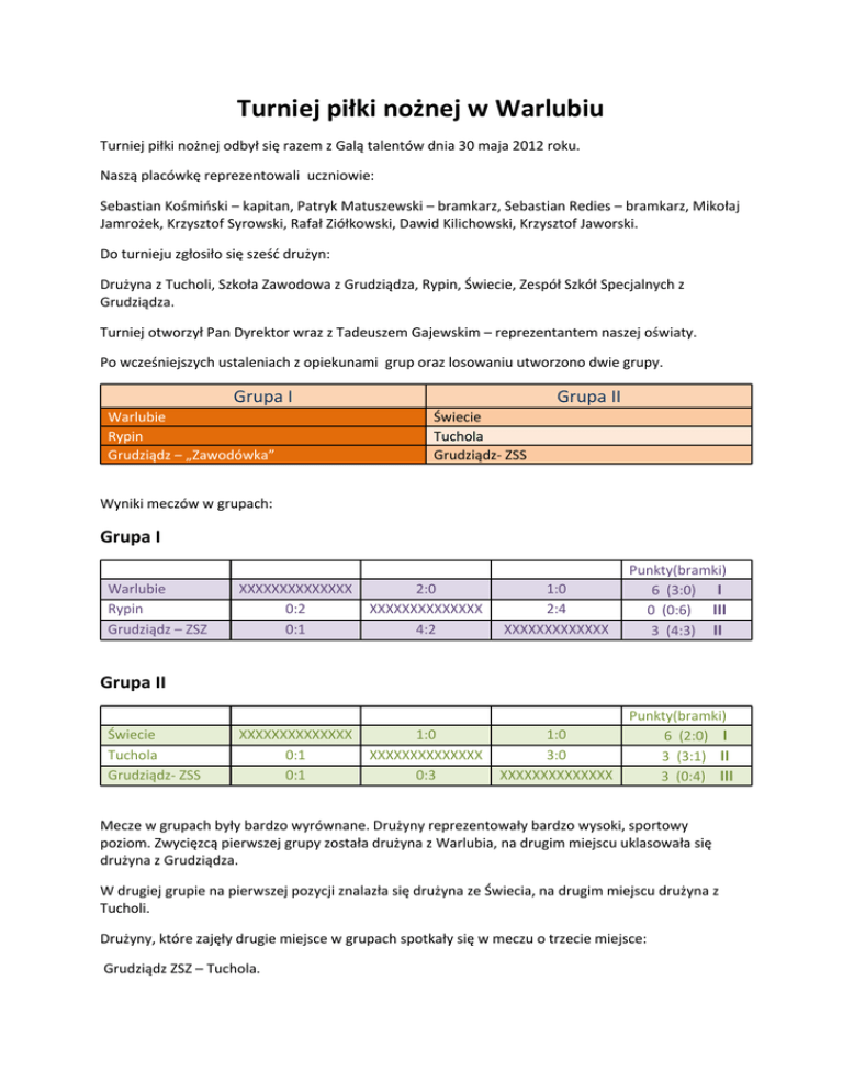 Turniej piłki nożnej w Warlubiu Turniej piłki nożnej odbył się razem z Galą talentów dnia 30 maja 2012 roku. Naszą placówkę reprezentowali uczniowie: Sebastian Kośmiński – kapitan, Patryk Matuszewski – bramkarz, Sebastian Redies – bramkarz, Mikołaj Jamrożek, Krzysztof Syrowski, Rafał Ziółkowski, Dawid Kilichowski, Krzysztof Jaworski. Do turnieju zgłosiło się sześć drużyn: Drużyna z Tucholi, Szkoła Zawodowa z Grudziądza, Rypin, Świecie, Zespół Szkół Specjalnych z Grudziądza. Turniej otworzył Pan Dyrektor wraz z Tadeuszem Gajewskim – reprezentantem naszej oświaty. Po wcześniejszych ustaleniach z opiekunami grup oraz losowaniu utworzono dwie grupy. Grupa I Warlubie Rypin Grudziądz – „Zawodówka” Grupa II Świecie Tuchola Grudziądz- ZSS Wyniki meczów w grupach: Grupa I Warlubie Rypin Grudziądz – ZSZ XXXXXXXXXXXXXX 0:2 0:1 2:0 XXXXXXXXXXXXXX 4:2 1:0 2:4 XXXXXXXXXXXXX Punkty(bramki) 6 (3:0) I 0 (0:6) III 3 (4:3) II 1:0 3:0 XXXXXXXXXXXXXX Punkty(bramki) 6 (2:0) I 3 (3:1) II 3 (0:4) III Grupa II Świecie Tuchola Grudziądz- ZSS XXXXXXXXXXXXXX 0:1 0:1 1:0 XXXXXXXXXXXXXX 0:3 Mecze w grupach były bardzo wyrównane. Drużyny reprezentowały bardzo wysoki, sportowy poziom. Zwycięzcą pierwszej grupy została drużyna z Warlubia, na drugim miejscu uklasowała się drużyna z Grudziądza. W drugiej grupie na pierwszej pozycji znalazła się drużyna ze Świecia, na drugim miejscu drużyna z Tucholi. Drużyny, które zajęły drugie miejsce w grupach spotkały się w meczu o trzecie miejsce: Grudziądz ZSZ – Tuchola. Po pięknym meczu i festiwalu bramek, lepsza okazała się drużyna z Grudziądza wygrywając mecz 4:2 Drużyny, które wyszły z grup na pierwszym miejscu spotkały się w finale - meczu o pierwsze miejsce: Warlubie –Świecie. Mecz zaczął się dla nas niekorzystnie. W drugiej minucie zawodnik ze Świecia umieścił piłkę w siatce naszej bramki. W przerwie meczu nasi zawodnicy odpowiednio zmotywowali się do dalszej sportowej walki, co przełożyło się w grze drugiej połowy. Na początku drugiej połowy zawodnik ze Świecia sfaulował naszego Dawida Kilichowskiego w polu karnym i sędzia podyktował rzut karny. Takiej okazji nie zmarnował nasz kapitan Sebastian Kośmiński. Mamy remis 1:1. Ten fakt jeszcze bardziej zachęcił naszych do większego wysiłku i ataku bramki przeciwników. Przyniosło to dla nas kolejne dwie bramki, które strzelił Dawid Kilichowski i Sebastian Kośmiński. Tak więc mecz zakończył się wynikiem 3:1. Gratulujemy naszej drużynie. Udało nam się ograć „zawodówki”. Bravo chłopaki!