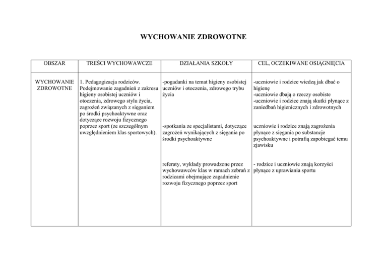 WYCHOWANIE ZDROWOTNE OBSZAR TREŚCI WYCHOWAWCZE WYCHOWANIE ZDROWOTNE 1. Pedagogizacja rodziców. Podejmowanie zagadnień z zakresu higieny osobistej uczniów i otoczenia, zdrowego stylu życia, zagrożeń związanych z sięganiem po środki psychoaktywne oraz dotyczące rozwoju fizycznego poprzez sport (ze szczególnym uwzględnieniem klas sportowych). DZIAŁANIA SZKOŁY CEL, OCZEKIWANE OSIĄGNIĘCIA -pogadanki na temat higieny osobistej uczniów i otoczenia, zdrowego trybu życia -uczniowie i rodzice wiedzą jak dbać o higienę -uczniowie dbają o rzeczy osobiste -uczniowie i rodzice znają skutki płynące z zaniedbań higienicznych i zdrowotnych -spotkania ze specjalistami, dotyczące zagrożeń wynikających z sięgania po środki psychoaktywne uczniowie i rodzice znają zagrożenia płynące z sięgania po substancje psychoaktywne i potrafią zapobiegać temu zjawisku referaty, wykłady prowadzone przez - rodzice i uczniowie znają korzyści wychowawców klas w ramach zebrań z płynące z uprawiania sportu rodzicami obejmujące zagadnienie rozwoju fizycznego poprzez sport 2. Zajęcia z zakresu profilaktyki uzależnień – sposoby rozpoznawania oraz unikania sytuacji niebezpiecznych dla zdrowia i życia; sposoby rozpoznawania oraz unikania sytuacji niebezpiecznych dla zdrowia, życia i mienia. Uświadamianie własnej odpowiedzialności za ochronę swojego zdrowia. -programy profilaktyczne: III Elementarz - grant - godziny wychowawcze - lekcje przedmiotowe -filmy -konkursy, np. Olimpiada wiedzy o środkach psychoaktywnych -spotkania z policją -spotkania z pielęgniarką szkolną -organizowanie akcji prozdrowotnych, np. Dzień bez papierosa -uczniowie wiedzą, co może zagrażać ich zdrowiu i życiu -uczniowie potrafią przewidywać zagrożenia, unikają ich, a w przypadku zaistnienia sytuacji zagrażających zdrowiu, życiu i mieniu potrafią radzić sobie z sytuacją trudną -uczeń zna substancje uzależniające i ich szkodliwość -uczeń wie jak unikać środków uzależniających -uczeń wie, że jest odpowiedzialny za ochronę swojego zdrowia i podejmuje działania na rzecz ochrony własnego zdrowia 3. Kształtowanie umiejętności radzenia sobie ze stresem. -zajęcia warsztatowe -godziny wychowawcze -lekcje przedmiotowe -plakaty -filmy -uczeń umie odpowiednio reagować w sytuacji stresowej, zna techniki relaksacyjne 4. Propagowanie zdrowego stylu życia poprzez właściwe odżywianie. -godziny wychowawcze -lekcje przedmiotowe -spotkania z pielęgniarką szkolną -uczeń zna i stosuje zasady prawidłowego żywienia 5. Kształtowanie umiejętności konstruktywnego spędzania wolnego czasu. Uświadamianie znaczenia podejmowania aktywności zarówno ruchowej, jak i umysłowej dla ogólnego rozwoju psychofizycznego młodzieży. -zajęcia warsztatowe -godziny wychowawcze -lekcje przedmiotowe -plakty -filmy -konkursy -zajęcia pozalekcyjne -koła zainteresowań -wycieczki -imprezy sportowe -akcje typu: Biała Szkoła, Zielona Szkoła -dyskoteki -uczeń potrafi zagospodarować czas wolny -uczeń wie jak prawidłowo i pożytecznie spędzać czas wolny -uczeń zna korzyści płynące z podejmowania wszechstronnej aktywności 6. Dbanie o środowisko naturalne. Kształtowanie przekonania, że czyste i przyjazne otoczenie sprzyja zdrowiu człowieka. -godziny wychowawcze -lekcje przedmiotowe -organizowanie akcji ekologicznych, np. Dni Ziemi, Sprzątanie Świata, -współpraca z PGKiM: zbiórka makulatury, zbiórka puszek, segregacja odpadów, -sadzenie drzew i krzewów -filmy -uczeń rozumie podstawowe zależności zachodzące w środowisku naturalnym -uczeń dostrzega zanieczyszczenia środowiska -uczeń dba o przyrodę; prezentuje postawy szacunku dla przyrody i otoczenia -dba o otoczenie pracy uczniów zarówno w szkole, jak i w domu 7. Perspektywy wynikające z prowadzenia zdrowego stylu życia i drogi do osiągnięcia satysfakcji osobistej bez substancji uzależniających. -godziny wychowawcze -lekcje przedmiotowe -filmy -konkursy -uczeń potrafi wskazać sposoby osiągania satysfakcji osobistej bez zażywania środków odurzających -uczeń potrafi kierować własnym życiem i realizować cele życiowe bez wspomagania się środkami uzależniającymi 8. Stwarzanie warunków do rozwoju osobistego i pomoc w poznawaniu samego siebie. Uświadamianie współzależności między wymiarami zdrowia, np. fizycznym, psychicznym i duchowym. -zajęcia warsztatowe -pogadanki -koła zainteresowań -organizowanie akcji takich jak: Dzień Sportu, Turniej szermierczy o Puchar Dyrektora Gimnazjum nr 6, Miasto Milowego Słupa -uczeń lepiej zna samego siebie -uczeń dba o swoje zdrowie psychiczne i fizyczne np. poprzez zdrowe odżywianie się, uprawianie sportu, rozwijanie zainteresowań -uczeń dąży do wszechstronnego rozwoju 9. Zapoznawanie uczniów z zasadami bezpieczeństwa obowiązującymi w szkole, w domu i miejscach publicznych oraz sposobami udzielania pierwszej pomocy. -godziny wychowawcze -lekcje przedmiotowe -konkursy -karta rowerowa i motorowerowa -kursy BHP -uczniowie znają i stosują przepisy BHP -uczniowie wiedzą jak zareagować w przypadkach konieczności udzielenia pierwszej pomocy, zagrożenia życia, wezwania pomocy w nagłych wypadkach -uczniowie znają drogę ewakuacji oraz zasady postępowania w sytuacjach katastrof