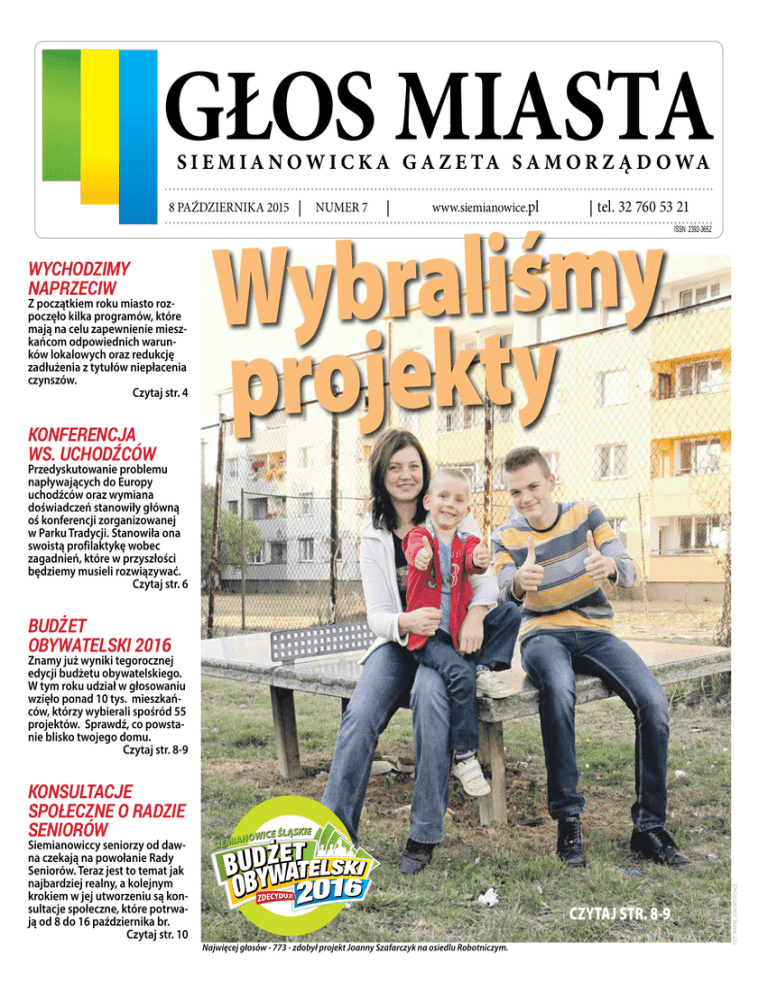 y m ś i l a r b y W projekty 8 PAŹDZIERNIKA 2015 WYCHODZIMY NAPRZECIW Z początkiem roku miasto rozpoczęło kilka programów, które mają na celu zapewnienie mieszkańcom odpowiednich warunków lokalowych oraz redukcję zadłużenia z tytułów niepłacenia czynszów. Czytaj str. 4 KONFERENCJA WS. UCHODŹCÓW NUMER 7 www.siemianowice.pl tel. 32 760 53 21 ISSN 2392-3652 Przedyskutowanie problemu napływających do Europy uchodźców oraz wymiana doświadczeń stanowiły główną oś konferencji zorganizowanej w Parku Tradycji. Stanowiła ona swoistą profilaktykę wobec zagadnień, które w przyszłości będziemy musieli rozwiązywać. Czytaj str. 6 BUDŻET OBYWATELSKI 2016 Znamy już wyniki tegorocznej edycji budżetu obywatelskiego. W tym roku udział w głosowaniu wzięło ponad 10 tys. mieszkańców, którzy wybierali spośród 55 projektów. Sprawdź, co powstanie blisko twojego domu. Czytaj str. 8-9 Siemianowiccy seniorzy od dawna czekają na powołanie Rady Seniorów. Teraz jest to temat jak najbardziej realny, a kolejnym krokiem w jej utworzeniu są konsultacje społeczne, które potrwają od 8 do 16 października br. Czytaj str. 10 CZYTAJ STR. 8-9 Najwięcej głosów - 773 - zdobył projekt Joanny Szafarczyk na osiedlu Robotniczym. FOT: RAFAŁ JAKOKTOCHCE KONSULTACJE SPOŁECZNE O RADZIE SENIORÓW Zaplanuj z nami swój czas! 10 października (sobota) godz. 18:00, SCK Park Tradycji, XV Dzień Papieski „Jan Paweł II – Patron Rodziny” - spektakl słowno-muzyczny „Tryptyk rzymski”. Wstęp wolny. Muzeum Miejskie, spotkanie artystów uczestniczących w wystawie „Derby Artystyczne – Śląsk-Małopolska 2015” z mieszkańcami miasta – Raut Artystyczny. Wystawę zrealizowano w ramach Projektu „Integracja Sztuki” - prezentującej prace artystów z województwa śląskiego i małopolskiego oraz województw ościennych 12 października (poniedziałek) godz. 18:00, SCK Willa Fitznera, Kobiece Siemianowice – moda, uroda, zdrowie. Wstęp wolny Siemianowice-Kyksowi Od połowy września w galerii artystycznej na katowickim Placu Grunwaldzkim stoi rzeźba poświęcona Janowi Kyksowi Skrzekowi. Siemianowice Śląskie, rodzinne miasto artysty – reprezentowane podczas uroczystości odsłonięcia monumentu, też uczci jego pamięć. Pięknie – żywą muzyką. Ukochanym przez niego bluesem. 7 listopada w Parku Tradycji odbędzie się bowiem druga edycja Michałkowickiego Bluesowania, poświęcona w całości Kyksowi. Ale nie tylko ten jeden raz nad imprezą unosił się będzie duch siemianowickiego bluesmana, bowiem organizatorzy postanowili nadać jej imię Jana Skrzeka. Ta właśnie uroczystość zainauguruje koncert gwiazd. Wcześniej jednak przewidziano wernisaż wystawy fotograficznej i prezentację pamiątek związanych z Jankiem Skrzekiem oraz prezentację projektów koncepcyjnych rzeźby, która stanie w Michałkowicach. Ich autorem jest Jacek Kiciński-artysta, który jest też twórcą rzeźby z Placu Grunwaldzkiego. Inicjatorami uhonorowania Kyksa rzeźbą są państwo Michalscy-michałkowiczanie, zamieszkali obecnie w Niemczech. To właśnie oni zwrócili się do mnie z prośbą o poparcie idei - mówi radny Jan Wieczorek. Pomysł podjęło Stowarzyszenie Mieszkańców Siemianowic, które zamierza zorganizować zbiórkę pieniędzy na sfinansowanie dzieła. To, że Jan Skrzek był postacią, która przysporzyła Siemianowicom Śląskim chwały, która na ich mapie kulturalnej stanowiła jedną z jaśniejszych gwiazd, nie pozostało bez echa w środowisku radnych. W ich kręgu także toczą się rozmowy nad sposobem, w jaki zaakcentowany zostanie wkład zmarłego artysty w rozwój siemianowickiej kultury. (ERW) Pomóżcie geodetom… 13, 20, 27 października (wtorki) godz. 20:00 i 21:00, Basen Kompleksu Sportowego “Michał”, Ćwiczenia w wodzie W najbliższym czasie do Waszego domu, mieszkania, lokalu użytkowego lub innego budynku, może zawitać geodeta prosząc o udzielenie informacji dotyczącej właśnie budynku, położonego w granicach administracyjnych Siemianowic Śląskich. Informacje są zbierane w ramach prac modernizujących ewidencję budynkową. Zadanie to wykonuje na zlecenie Urzędu Miasta firma geodezyjna Biuro Usług Geodezyjnych Jerzy Niestrój z Siemianowic Śląskich. Pracownicy Biura będą pytać o dane dotyczące budynku, których zakres wskazany jest w rozporządzeniu o ewidencji gruntów i budynków. Prosimy o życzliwy i rzetelny kontakt z geodetami, ponieważ po zakończeniu akcji modernizacyjnej wszelkie informacje w zakresie ewidencji budynkowej będą przyjmowane przez urząd na wnioski właścicieli nieruchomości, którzy zgodnie z zapisem w prawie geodezyjnym i kartograficznym, zgłaszają Prezydentowi Miasta zmiany danych objętych ewidencją gruntów i budynków, w terminie 30 dni, licząc od daty powstania tych zmian. Dziękujemy za pomoc. 16, 30 października (piątki) godz. 15:00, MBP Filia nr 8 (ul. Zgrzebnioka 43a), Poczytaj mi mamo 17 października (sobota) od godz. 11:00, MOSiR „Pszczelnik”, Bieg Jesieni + Nordic Walking 19 października (poniedziałek) w godz. 10:00-12:00, MBP Oddział dla dzieci (Al. Sportowców 3), Światowy Dzień Urodzin Kubusia Puchatka – impreza biblioteczna dla przedszkolaków i nie tylko 22 października (czwartek) godz. 17: 00, SCK Jarzębina, Teatr Baju Baj - „Bajka na drutach” – przedstawienie dla dzieci. Bilety – 5 zł (dzieci), 7 zł (dorośli) 24 października (sobota) godz. 9:00, Boisko MOSiR „Pszczelnik”, Piłka nożna - Klasa A MKS „Siemianowiczanka”– KS Unia Kosztowy 25 października (niedziela) w godz. 7:00-21:00, Wybory Parlamentarne 26 października (poniedziałek) godz. 19:00, SCK Bytków, „Randka w ciemno na dwie pary” – spektakl teatralny. Wystąpią: Michał Milowicz, Krzysztof Ibisz, Małgorzata Potocka, Olga Borys. Bilety – 50 zł 27 października (wtorek) godz. 16:00, SCK Bytków, Bytkowski Dancing i spotkanie z kabaretem. Goście spe