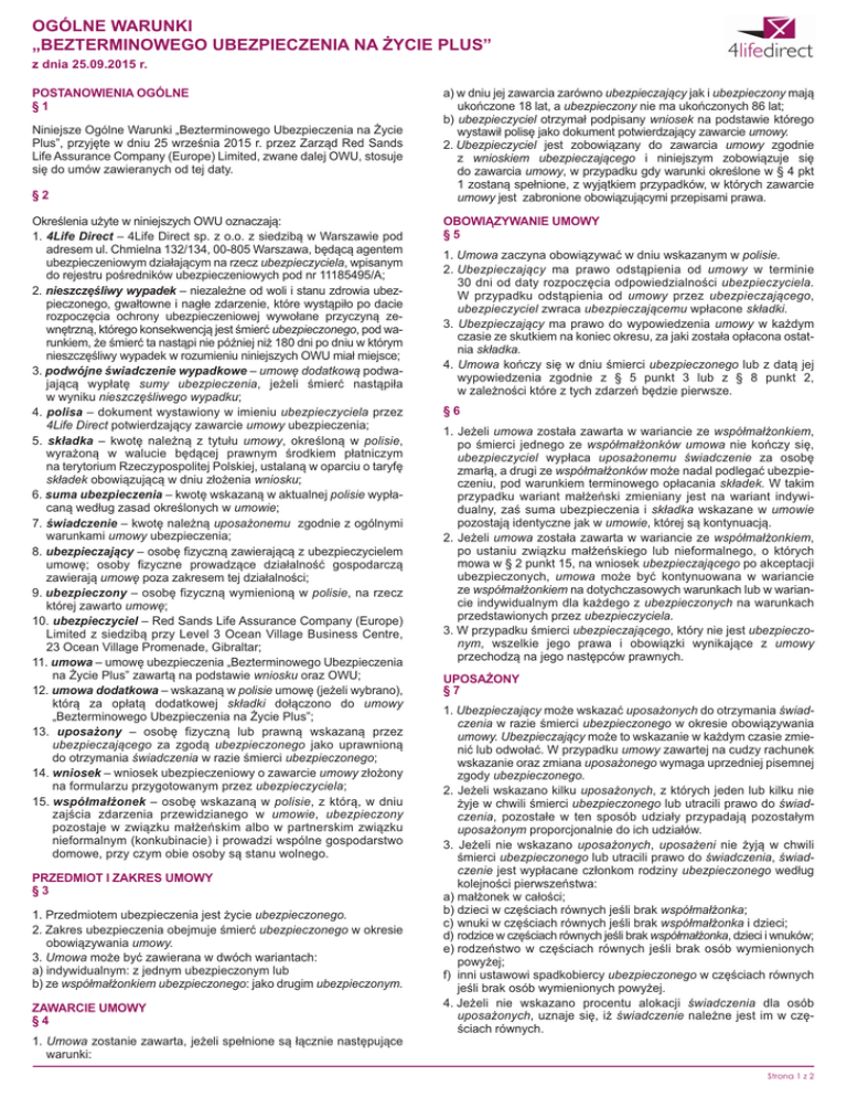 OGÓLNE WARUNKI „BEZTERMINOWEGO UBEZPIECZENIA NA ŻYCIE PLUS” z dnia 25.09.2015 r. POSTANOWIENIA OGÓLNE §1 Niniejsze Ogólne Warunki „Bezterminowego Ubezpieczenia na Życie Plus”, przyjęte w dniu 25 września 2015 r. przez Zarząd Red Sands Life Assurance Company (Europe) Limited, zwane dalej OWU, stosuje się do umów zawieranych od tej daty. §2 Określenia użyte w niniejszych OWU oznaczają: 1. 4Life Direct – 4Life Direct sp. z o.o. z siedzibą w Warszawie pod adresem ul. Chmielna 132/134, 00-805 Warszawa, będącą agentem ubezpieczeniowym działającym na rzecz ubezpieczyciela, wpisanym do rejestru pośredników ubezpieczeniowych pod nr 11185495/A; 2. nieszczęśliwy wypadek – niezależne od woli i stanu zdrowia ubezpieczonego, gwałtowne i nagłe zdarzenie, które wystąpiło po dacie rozpoczęcia ochrony ubezpieczeniowej wywołane przyczyną zewnętrzną, którego konsekwencją jest śmierć ubezpieczonego, pod warunkiem, że śmierć ta nastąpi nie później niż 180 dni po dniu w którym nieszczęśliwy wypadek w rozumieniu niniejszych OWU miał miejsce; 3. podwójne świadczenie wypadkowe – umowę dodatkową podwajającą wypłatę sumy ubezpieczenia, jeżeli śmierć nastąpiła w wyniku nieszczęśliwego wypadku; 4. polisa – dokument wystawiony w imieniu ubezpieczyciela przez 4Life Direct potwierdzający zawarcie umowy ubezpieczenia; 5. składka – kwotę należną z tytułu umowy, określoną w polisie, wyrażoną w walucie będącej prawnym środkiem płatniczym na terytorium Rzeczypospolitej Polskiej, ustalaną w oparciu o taryfę składek obowiązującą w dniu złożenia wniosku; 6. suma ubezpieczenia – kwotę wskazaną w aktualnej polisie wypłacaną według zasad określonych w umowie; 7. świadczenie – kwotę należną uposażonemu zgodnie z ogólnymi warunkami umowy ubezpieczenia; 8. ubezpieczający – osobę fizyczną zawierającą z ubezpieczycielem umowę; osoby fizyczne prowadzące działalność gospodarczą zawierają umowę poza zakresem tej działalności; 9. ubezpieczony – osobę fizyczną wymienioną w polisie, na rzecz której zawarto umowę; 10. ubezpieczyciel – Red Sands Life Assurance Company (Europe) Limited z siedzibą przy Level 3 Ocean Village Business Centre, 23 Ocean Village Promenade, Gibraltar; 11. umowa – umowę ubezpieczenia „Bezterminowego Ubezpieczenia na Życie Plus” zawartą na podstawie wniosku oraz OWU; 12. umowa dodatkowa – wskazaną w polisie umowę (jeżeli wybrano), którą za opłatą dodatkowej składki dołączono do umowy „Bezterminowego Ubezpieczenia na Życie Plus”; 13. uposażony – osobę fizyczną lub prawną wskazaną przez ubezpieczającego za zgodą ubezpieczonego jako uprawnioną do otrzymania świadczenia w razie śmierci ubezpieczonego; 14. wniosek – wniosek ubezpieczeniowy o zawarcie umowy złożony na formularzu przygotowanym przez ubezpieczyciela; 15. współmałżonek – osobę wskazaną w polisie, z którą, w dniu zajścia zdarzenia przewidzianego w umowie, ubezpieczony pozostaje w związku małżeńskim albo w partnerskim związku nieformalnym (konkubinacie) i prowadzi wspólne gospodarstwo domowe, przy czym obie osoby są stanu wolnego. PRZEDMIOT I ZAKRES UMOWY §3 1. Przedmiotem ubezpieczenia jest życie ubezpieczonego. 2. Zakres ubezpieczenia obejmuje śmierć ubezpieczonego w okresie obowiązywania umowy. 3. Umowa może być zawierana w dwóch wariantach: a) indywidualnym: z jednym ubezpieczonym lub b) ze współmałżonkiem ubezpieczonego: jako drugim ubezpieczonym. ZAWARCIE UMOWY §4 a) w dniu jej zawarcia zarówno ubezpieczający jak i ubezpieczony mają ukończone 18 lat, a ubezpieczony nie ma ukończonych 86 lat; b) ubezpieczyciel otrzymał podpisany wniosek na podstawie którego wystawił polisę jako dokument potwierdzający zawarcie umowy. 2. Ubezpieczyciel jest zobowiązany do zawarcia umowy zgodnie z wnioskiem ubezpieczającego i niniejszym zobowiązuje się do zawarcia umowy, w przypadku gdy warunki określone w § 4 pkt 1 zostaną spełnione, z wyjątkiem przypadków, w których zawarcie umowy jest zabronione obowiązującymi przepisami prawa. OBOWIĄZYWANIE UMOWY §5 1. Umowa zaczyna obowiązywać w dniu wskazanym w polisie. 2. Ubezpieczający ma prawo odstąpienia od umowy w terminie 30 dni od daty rozpoczęcia odpowiedzialności ubezpieczyciela. W przypadku odstąpienia od umowy przez ubezpieczającego, ubezpieczyciel zwraca ubezpieczającemu wpłacone składki. 3. Ubezpieczający ma prawo do wypowiedzenia umowy w każdym czasie ze skutkiem na koniec okresu, za jaki została opłacona ostatnia składka. 4. Umowa kończy się w dniu śmierci ubezpieczonego lub z datą jej wypowiedzenia zgodnie z § 5 punkt 3 lub z § 8 punkt 2, w zależności które z tych zdarzeń będzie pierwsze. §6 1. Jeżeli umowa została zawarta w wariancie ze współmałżonkiem, po śmierci jednego ze współmałżonków umowa nie kończy się, ubezpieczyciel wypłaca uposażonemu świadczenie za osobę zmarłą, a drugi ze współmałżonków może nadal podlegać ubezpieczeniu, pod warunkiem terminowego opłacania składek. W takim przypadku wariant małżeński zmieniany jest na wariant indywidualny, zaś suma ubezpieczenia i składka wskazane w umowie pozostają identyczne jak w umowie, której są kontynuacją. 2. Jeżeli umowa została zawarta w wariancie ze współmałżonkiem, po ustaniu związku małżeńskiego lub nieformalnego, o których mowa w § 2 punkt 15, na wniosek ubezpieczającego po akceptacji ubezpieczonych, umowa może być kontynuowana w wariancie ze współmałżonkiem na dotychczasowych warunkach lub w wariancie indywidualnym dla każdego z ubezpieczonych na warunkach przedstawionych przez ubezpieczyciela. 3. W przypadku śmierci ubezpieczającego, który nie jest ubezpieczonym, wszelkie jego prawa i obowiązki wynikające z umowy przechodzą na jego następców prawnych. UPOSAŻONY §7 1. Ubezpieczający może wskazać uposażonych do otrzymania 