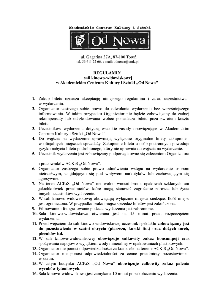 Akademickie Centrum Kultury i Sztuki ul. Gagarina 37A, 87-100 Toruń tel. 56 611 22 66, e-mail: [email protected] REGULAMIN sali kinowo-widowiskowej w Akademickim Centrum Kultury i Sztuki „Od Nowa” 1. Zakup biletu oznacza akceptację niniejszego regulaminu i zasad uczestnictwa w wydarzeniu. 2. Organizator zastrzega sobie prawo do odwołania wydarzenia bez wcześniejszego informowania. W takim przypadku Organizator nie będzie zobowiązany do żadnej rekompensaty lub odszkodowania wobec posiadacza biletu poza zwrotem kosztu biletu. 3. Uczestników wydarzenia dotyczą wszelkie zasady obowiązujące w Akademickim Centrum Kultury i Sztuki „Od Nowa”. 4. Do wejścia na wydarzenie uprawniają wyłącznie oryginalne bilety zakupione w oficjalnych miejscach sprzedaży. Zakupienie biletu u osób postronnych powoduje ryzyko nabycia biletu podrobionego, który nie uprawnia do wejścia na wydarzenie. 5. Uczestnik wydarzenia jest zobowiązany podporządkować się zaleceniom Organizatora i pracowników ACKiS „Od Nowa”. 6. Organizator zastrzega sobie prawo odmówienia wstępu na wydarzenie osobom nietrzeźwym, znajdującym się pod wpływem narkotyków lub zachowującym się agresywnie. 7. Na teren ACKiS „Od Nowa” nie wolno wnosić broni, opakowań szklanych ani jakichkolwiek przedmiotów, które mogą stanowić zagrożenie zdrowia lub życia innych uczestników wydarzenie. 8. W sali kinowo-widowiskowej obowiązują wyłącznie miejsca siedzące. Ilość miejsc jest ograniczona. W przypadku braku miejsc sprzedaż biletów jest zakończona. 9. Filmowanie i fotografowanie podczas wydarzenia jest zabronione. 10. Sala kinowo-widowiskowa otwierana jest na 15 minut przed rozpoczęciem wydarzenia. 11. Przed wejściem do sali kinowo-widowiskowej uczestnik spektaklu zobowiązany jest do pozostawienia w szatni okrycia (płaszcza, kurtki itd.) oraz dużych toreb, plecaków itd. 12. W sali kinowo-widowiskowej obowiązuje całkowity zakaz konsumpcji oraz spożywania napojów z wyjątkiem wody mineralnej w opakowaniach plastikowych. 13. Organizator nie ponosi odpowiedzialności za kradzieże na terenie ACKiS „Od Nowa”. 14. Organizator nie ponosi odpowiedzialności za cenne przedmioty pozostawione w szatni. 15. W całym budynku ACKiS „Od Nowa” obowiązuje całkowity zakaz palenia wyrobów tytoniowych. 16. Sala kinowo-widowiskowa jest zamykana 10 minut po zakończeniu wydarzenia.