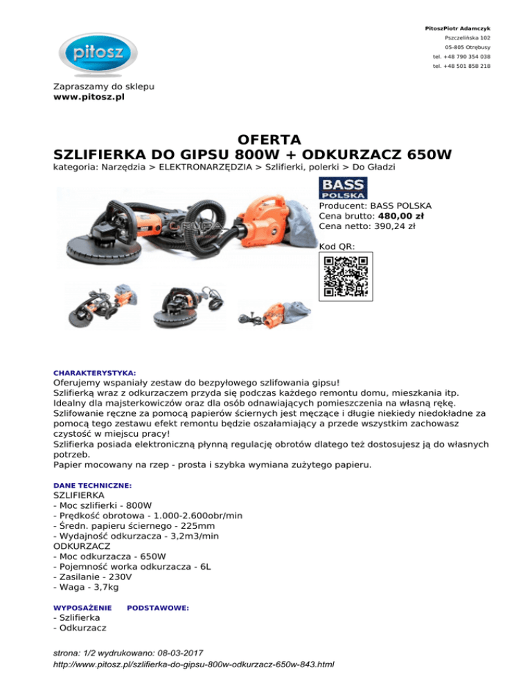PitoszPiotr Adamczyk Pszczelińska 102 05-805 Otrębusy tel. +48 790 354 038 tel. +48 501 858 218 Zapraszamy do sklepu www.pitosz.pl OFERTA SZLIFIERKA DO GIPSU 800W + ODKURZACZ 650W kategoria: Narzędzia > ELEKTRONARZĘDZIA > Szlifierki, polerki > Do Gładzi Producent: BASS POLSKA Cena brutto: 480,00 zł Cena netto: 390,24 zł Kod QR: CHARAKTERYSTYKA: Oferujemy wspaniały zestaw do bezpyłowego szlifowania gipsu! Szlifierką wraz z odkurzaczem przyda się podczas każdego remontu domu, mieszkania itp. Idealny dla majsterkowiczów oraz dla osób odnawiających pomieszczenia na własną rękę. Szlifowanie ręczne za pomocą papierów ściernych jest męczące i długie niekiedy niedokładne za pomocą tego zestawu efekt remontu będzie oszałamiający a przede wszystkim zachowasz czystość w miejscu pracy! Szlifierka posiada elektroniczną płynną regulację obrotów dlatego też dostosujesz ją do własnych potrzeb. Papier mocowany na rzep - prosta i szybka wymiana zużytego papieru. DANE TECHNICZNE: SZLIFIERKA - Moc szlifierki - 800W - Prędkość obrotowa - 1.000-2.600obr/min - Średn. papieru ściernego - 225mm - Wydajność odkurzacza - 3,2m3/min ODKURZACZ - Moc odkurzacza - 650W - Pojemność worka odkurzacza - 6L - Zasilanie - 230V - Waga - 3,7kg WYPOSAŻENIE PODSTAWOWE: - Szlifierka - Odkurzacz strona: 1/2 wydrukowano: 08-03-2017 http://www.pitosz.pl/szlifierka-do-gipsu-800w-odkurzacz-650w-843.html - 6 papierów ściernych o gradacji 80/100/120/150/180/240 wąż ssący 1.5m, worki do odkurzacza 3szt., instrukcja obsługi strona: 2/2 wydrukowano: 08-03-2017 http://www.pitosz.pl/szlifierka-do-gipsu-800w-odkurzacz-650w-843.html