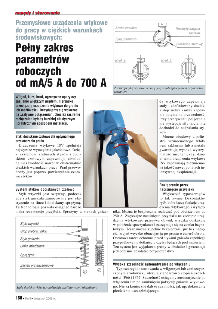 Przemysłowe urządzenia wtykowe do pracy w ciężkich warunkach środowiskowych: Pełny zakres parametrów roboczych od mA/5 A do 700 A Wilgoć, kurz, brud, agresywne opary czy zasilanie większym prądem, nierzadko przeciążają urządzenia wtykowe do granic ich możliwości. Decydujemy się wówczas na „sztywne połączenia”, chociaż zasilanie rozłączalne byłoby bardziej elastycznym i praktycznym sposobem instalacji. Styki dociskane czołowo dla optymalnego przewodzenia prądu Urządzenia wtykowe ISV spełniają najwyższe wymagania jakościowe. Dzięki systemowi srebrnych styków z dociskiem czołowym zapewniają absolutną niezawodność nawet w ekstremalnie ciężkich warunkach pracy. Prąd przewodzony jest poprzez powierzchnie czołowe styków. System styków dociskanych czołowo Styk wtyczki jest sztywny, podczas gdy styk gniazda zamocowany jest elastycznie na lince i dociskany sprężyną. Ta technologia pozwala osiągnąć bardzo niską rezystancję przejścia. Sprężyny w stykach gniaz- Stały docisk styków jest dokładnie zdefiniowany i niezmienny 160 NR 9 WRZESIEŃ 2008 R. Zaciski przyłączeniowe Ze sprężystym zabezpieczeniem przed poluzowaniem da wtykowego zapewniają stały i zdefiniowany docisk, a stop srebra i niklu zapewnia optymalną przewodność. Przy przerywaniu połączenia nie występują siły tarcia, nie dochodzi do nadpalania styków. Mocne obudowy z poliestru wzmocnionego włóknem szklanym lub z metalu gwarantują wysoką wytrzymałość mechaniczną, dzięki temu urządzenia wtykowe ISV zapewniają niezmienioną jakość nawet po latach intensywnej eksploatacji. Rozłączanie przez naciśnięcie przycisku Większość typoszeregów to tak zwane Dekontaktory®, które łączą funkcje urządzenia wtykowego i wyłącznika. Można je bezpiecznie rozłączać pod obciążeniem do 250 A. Zwyczajne naciśnięcie przycisku na zaczepie urządzenia wtykowego przerywa obwód, wtyczka odskakuje w położenie spoczynkowe i zatrzymuje się na zamku bagnetowym. Teraz można zupełnie bezpiecznie, już bez napięcia, wyjąć wtyczkę obracając ją po prostu o ćwierć obrotu. Obrotowa tarcza ochronna przed stykami gniazda zapobiega przypadkowemu dotknięciu części będących pod napięciem. Ten system jest wyjątkowo prosty w obsłudze i gwarantuje jednocześnie absolutne bezpieczeństwo. Wysoka szczelność automatycznie po włączeniu Typoszeregi do stosowania w wilgotnym lub zanieczyszczonym środowisku oferują standartowo stopień szczelności IP66 i IP67. Szczelność osiągamy automatycznie po włączeniu lub po zamknięciu pokrywy gniazda wtykowego. Nie są konieczne dalsze czynności, jak np. dokręcanie pierścienia uszczelniającego. reklama Międzynarodowe standardy i normy ISV jest członkiem stowarzyszenia BECMA – Międzynarodowego Związku Producentów Urządzeń Wtykowych z Kontaktami Dociskanymi Czołowo. Urządzenia odpowiadają normie międzynarodowej IEC/EN 60309-1 dla przemysłowych urządzeń wtykowych. Najszerzej stosowane modele posiadają atesty laboratoriów certyfikacyjnych z całego świata (VDE, UL, LCIE, GOST itp.). Przeciwwybuchowe rozłączalne urządzenia wtykowe certyfikowane wg ATEX ISV oferuje również pełny asortyment urządzeń certyfikowanych wg ATEX. Przeciwwybuchowe urządzenia wtykowe ze zintegrowaną funkcją rozłączania pod obciążeniem występują w zakresie od 16 A do 200 A. Również skrzynki przyłączeniowe są oferowane w wykonaniu przeciwwybuchowym. Szeroki zakres zastosowań Urządzenia wtykowe ISV znajdują zastosowanie w takich różnorodnych gałęziach przemysłowych, jak: przemysł spożywczy, chemiczny, oczyszczalnie ścieków, przemysł metalowy, papierniczy, górnictwo podziemne i odkrywkowe, budowa tuneli, przemysł samochodowy, lotniczy, porty morskie, kolejnictwo, energetyka, a także w zastosowaniach wojskowych, pożarniczych i ratownictwie. Międzynarodowe koncerny oraz małe i średnie przedsiębiorstwa na całym świecie korzystają z urządzeń wtykowych ISV. CON-TECH ul. Wspólna 9 45-831 Opole tel./fax: 077-45 74 778 tel./fax: 077-45 75 096 tel./fax: 077-45 75 007 e-mail: [email protected] CON-TECH - Wałbrzych ul. Hetmańska 1 (Podzamcze) 58-314 Wałbrzych tel. 074-84 26 470 fax 074-84 26 470 e-mail: [email protected] CON-TECH - Kielce ul. Krakowska 62 25-701 Kielce tel. 041-362 72 24 fax 041-362 72 24 e-mail: [email protected] NR 9 WRZESIEŃ 2008 R. 161