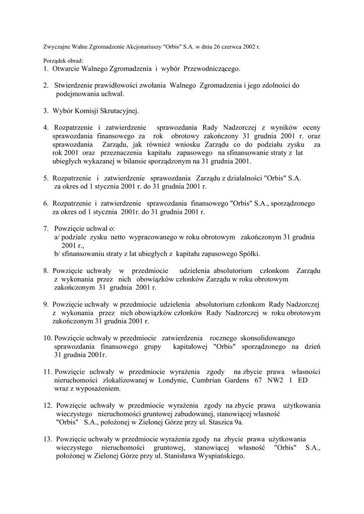 Zwyczajne Walne Zgromadzenie Akcjonariuszy "Orbis" S.A. w dniu 26 czerwca 2002 r. Porządek obrad: 1. Otwarcie Walnego Zgromadzenia i wybór Przewodniczącego. 2. Stwierdzenie prawidłowości zwołania Walnego Zgromadzenia i jego zdolności do podejmowania uchwał. 3. Wybór Komisji Skrutacyjnej. 4. Rozpatrzenie i zatwierdzenie sprawozdania Rady Nadzorczej z wyników oceny sprawozdania finansowego za rok obrotowy zakończony 31 grudnia 2001 r. oraz sprawozdania Zarządu, jak również wniosku Zarządu co do podziału zysku za rok 2001 oraz przeznaczenia kapitału zapasowego na sfinansowanie straty z lat ubiegłych wykazanej w bilansie sporządzonym na 31 grudnia 2001. 5. Rozpatrzenie i zatwierdzenie sprawozdania Zarządu z działalności "Orbis" S.A. za okres od 1 stycznia 2001 r. do 31 grudnia 2001 r. 6. Rozpatrzenie i zatwierdzenie sprawozdania finansowego "Orbis" S.A., sporządzonego za okres od 1 stycznia 2001r. do 31 grudnia 2001 r. 7. Powzięcie uchwał o: a/ podziale zysku netto wypracowanego w roku obrotowym zakończonym 31 grudnia 2001 r., b/ sfinansowaniu straty z lat ubiegłych z kapitału zapasowego Spółki. 8. Powzięcie uchwały w przedmiocie udzielenia absolutorium członkom z wykonania przez nich obowiązków członków Zarządu w roku obrotowym zakończonym 31 grudnia 2001 r. Zarządu 9. Powzięcie uchwały w przedmiocie udzielenia absolutorium członkom Rady Nadzorczej z wykonania przez nich obowiązków członków Rady Nadzorczej w roku obrotowym zakończonym 31 grudnia 2001 r. 10. Powzięcie uchwały w przedmiocie zatwierdzenia rocznego skonsolidowanego sprawozdania finansowego grupy kapitałowej "Orbis" sporządzonego na dzień 31 grudnia 2001r. 11. Powzięcie uchwały w przedmiocie wyrażenia zgody na zbycie prawa własności nieruchomości zlokalizowanej w Londynie, Cumbrian Gardens 67 NW2 1 ED wraz z wyposażeniem. 12. Powzięcie uchwały w przedmiocie wyrażenia zgody na zbycie prawa użytkowania wieczystego nieruchomości gruntowej zabudowanej, stanowiącej własność "Orbis" S.A., położonej w Zielonej Górze przy ul. Staszica 9a. 13. Powzięcie uchwały w przedmiocie wyrażenia zgody na zbycie prawa użytkowania wieczystego nieruchomości gruntowej, stanowiącej własność "Orbis" S.A., położonej w Zielonej Górze przy ul. Stanisława Wyspiańskiego. 14. Powzięcie uchwały w przedmiocie wyrażenia zgody na zbycie prawa wieczystego użytkowania gruntu i prawa własności budynków położonych w Poznaniu przy ul. Św. Wincentego 12. 15. Powzięcie uchwały w przedmiocie wyrażenia zgody na nabycie prawa użytkowania wieczystego działek położonych w Poznaniu przy Al. Niepodległości 36. 16. Powzięcie uchwały w przedmiocie wyrażenia zgody na zbycie w trybie bezprzetargowym firmie "ZASADA" S.A. prawa użytkowania wieczystego gruntu części działki położonej w Sosnowcu przy ul. Kresowej 5. 17. Powzięcie uchwały w przedmiocie powierzenia Radzie Nadzorczej "Orbis" S.A. uprawnienia do ustalania wysokości osobnego wynagrodzenia członków Rady Nadzorczej delegowanych do stałego indywidualnego wykonywania nadzoru. 18. Powzięcie uchwały w przedmiocie zatwierdzenia do realizacji Aneksu nr 1 do Pakietu Socjalnego z dnia 11 lipca 2000 roku zawartego pomiędzy: Accor S.A., FIC Globe LLC i Globe Trade Centre S.A. z jednej strony, a ogólnokrajowymi organizacjami związkowymi tj. Międzyregionalną Komisją Koordynacyjną NSZZ "Solidarność" Pracowników ORBIS z siedzibą w Gdańsku oraz Zarządem Federacji Związków Zawodowych Pracowników ORBIS z siedzibą w Poznaniu, z drugiej strony. 19. Zamknięcie obrad Walnego Zgromadzenia. Uchwała nr 1 w przedmiocie zatwierdzenia sprawozdania Rady Nadzorczej z wyników oceny sprawozdania finansowego za rok obrotowy zakończony 31 grudnia 2001 r. oraz sprawozdania Zarządu, jak również wniosku Zarządu co do podziału zysku za rok 2001 oraz przeznaczenia kapitału zapasowego na sfinansowanie straty z lat ubiegłych wykazanej w bilansie sporządzonym na 31 grudnia 2001. Działając na podstawie art. 382 § 3 Kodeksu spółek handlowych oraz § 20 ust. 2 pkt. 3 Statutu Spółki uchwala się co następuje: §1 Zatwierdza się sprawozdanie Rady Nadzorczej z wyników oceny sprawozdania finansowego za rok obrotowy zakończony 31 grudnia 2001 r. oraz sprawozdania Zarządu, jak również wniosku Zarządu co do podziału zysku za rok 2001 oraz przeznaczenia kapitału zapasowego na sfinansowanie straty z lat ubiegłych wykazanej w bilansie sporządzonym na 31 grudnia 2001. §2 Uchwała wchodzi w życie z dniem podjęcia. Uchwała nr 2 w przedmiocie zatwierdzenia sprawozdania Zarządu z działalności "Orbis" S.A. za okres od 1 stycznia 2001 r. do 31 grudnia 2001 r. Działając na podstawie art. 393 pkt.1 i art. 395 § 2 pkt. 1 Kodeksu spółek handlowych oraz § 29 ust. 1 pkt. 1 Statutu Spółki uchwala się co następuje: §1 Zatwierdza się sprawozdanie Zarządu z działalności Spółki za okres od 1 stycznia 2001 r. do 31 grudnia 2001 r. §2 Uchwała wchodzi w życie z dniem podjęcia. Uchwała nr 3 w przedmiocie zatwierdzenia sprawozdania finansowego "Orbis" S.A. sporządzonego za okres od 1 stycznia 2001 r. do 31 grudnia 2001 r. Działając na podstawie art. 393 pkt. 1 i art. 395 § 2 pkt. 1 Kodeksu spółek handlowych oraz § 29 ust. 1 pkt. 1 Statutu Spółki uchwala się co następuje: §1 Zatwierdza się sprawozdanie finansowe Spółki za rok obrotowy 2001, na które składa się: 1) bilans sporządzony na dzień 31 grudnia 2001 r ., który po stronie aktywów i pasywów wykazuje sumę 1.291.770.534,89 złotych /jeden miliard dwieście dziewięćdziesiąt jeden milionów siedemset siedemdziesiąt tysięcy pięćset trzydzieści cztery złote i osiemdziesiąt dziewięć groszy/ złotych; 2) rachunek zysków i strat za okres od 1 stycznia 2001 r. do 31 grudnia 2001 r. wykazujący zysk netto w kwocie 50.978.020,01 złotych /pięćdziesiąt milionów dziewięćset siedemdziesiąt osiem tysięcy dwadzieścia złot