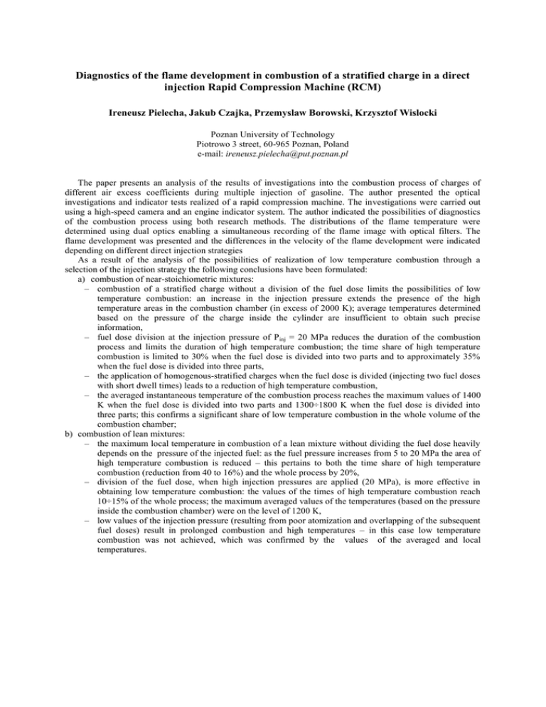 Diagnostics of the flame development in combustion of a stratified charge in a direct injection Rapid Compression Machine (RCM) Ireneusz Pielecha, Jakub Czajka, Przemyslaw Borowski, Krzysztof Wislocki Poznan University of Technology Piotrowo 3 street, 60-965 Poznan, Poland e-mail: [email protected] The paper presents an analysis of the results of investigations into the combustion process of charges of different air excess coefficients during multiple injection of gasoline. The author presented the optical investigations and indicator tests realized of a rapid compression machine. The investigations were carried out using a high-speed camera and an engine indicator system. The author indicated the possibilities of diagnostics of the combustion process using both research methods. The distributions of the flame temperature were determined using dual optics enabling a simultaneous recording of the flame image with optical filters. The flame development was presented and the differences in the velocity of the flame development were indicated depending on different direct injection strategies As a result of the analysis of the possibilities of realization of low temperature combustion through a selection of the injection strategy the following conclusions have been formulated: a) combustion of near-stoichiometric mixtures: – combustion of a stratified charge without a division of the fuel dose limits the possibilities of low temperature combustion: an increase in the injection pressure extends the presence of the high temperature areas in the combustion chamber (in excess of 2000 K); average temperatures determined based on the pressure of the charge inside the cylinder are insufficient to obtain such precise information, – fuel dose division at the injection pressure of P inj = 20 MPa reduces the duration of the combustion process and limits the duration of high temperature combustion; the time share of high temperature combustion is limited to 30% when the fuel dose is divided into two parts and to approximately 35% when the fuel dose is divided into three parts, – the application of homogenous-stratified charges when the fuel dose is divided (injecting two fuel doses with short dwell times) leads to a reduction of high temperature combustion, – the averaged instantaneous temperature of the combustion process reaches the maximum values of 1400 K when the fuel dose is divided into two parts and 1300÷1800 K when the fuel dose is divided into three parts; this confirms a significant share of low temperature combustion in the whole volume of the combustion chamber; b) combustion of lean mixtures: – the maximum local temperature in combustion of a lean mixture without dividing the fuel dose heavily depends on the pressure of the injected fuel: as the fuel pressure increases from 5 to 20 MPa the area of high temperature combustion is reduced – this pertains to both the time share of high temperature combustion (reduction from 40 to 16%) and the whole process by 20%, – division of the fuel dose, when high injection pressures are applied (20 MPa), is more effective in obtaining low temperature combustion: the values of the times of high temperature combustion reach 10÷15% of the whole process; the maximum averaged values of the temperatures (based on the pressure inside the combustion chamber) were on the level of 1200 K, – low values of the injection pressure (resulting from poor atomization and overlapping of the subsequent fuel doses) result in prolonged combustion and high temperatures – in this case low temperature combustion was not achieved, which was confirmed by the values of the averaged and local temperatures. Diagnostyka rozwoju płomienia podczas spalania ładunków uwarstwionych w układzie bezpośredniego wtrysku benzyny w maszynie pojedynczego cyklu (Rapid Compression Machine) The paper presents an analysis of the results of investigations into the combustion process of charges of different air excess coefficients during multiple injection of gasoline. The author presented the optical investigations and indicator tests realized of a rapid compression machine. The investigations were carried out using a high-speed camera and an engine indicator system. The author indicated the possibilities of diagnostics of the combustion process using both research methods. The distributions of the flame temperature were determined using dual optics enabling a simultaneous recording of the flame image with optical filters. The flame development was presented and the differences in the velocity of the flame development were indicated depending on different direct injection strategies W wyniku analizy możliwości realizacji spalania niskotemperaturowego przez sterowanie strategią wtrysku paliwa sformułowano następujące wnioski: a) w zakresie spalania mieszanki okołostechiometrycznej: – spalanie ładunku uwarstwionego bez podziału dawki paliwa ogranicza możliwości uzyskania spalania niskotemperaturowego: zwiększenie ciśnienia wtrysku paliwa zwiększa czas występowania obszarów o wysokiej temperaturze w komorze spalania (powyżej 2000 K); średnie wartości temperatury określone na podstawie ciśnienia ładunku w cylindrze nie pozwalają na uzyskanie tak jednoznacznych informacji, – podział dawki paliwa przy ciśnieniu wtrysku paliwa P wtr = 20 MPa skraca okres spalania i jednocześnie ogranicza czas występowania spalania wysokotemperaturowego; udział czasu wysokotemperaturowego spalania jest ograniczony do 30% przy podziale dawki na dwie części oraz do około 35% czasu spalania przy podziale dawki na trzy części, – stosowanie ładunków homogeniczno-uwarstwionych przy podziale dawki paliwa na części, polegającym na wtrysku dwóch dawek w niewielkich odległościach czasowych, prowadzi do ograniczenia czasu spalania wysokotemperaturowego, – uśredniona chwilowa temperatura procesu spalania podczas podziału dawki paliwa na dwie części uzyskuje maks