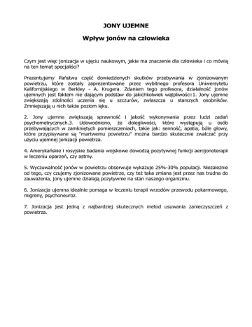 JONY UJEMNE Wpływ jonów na człowieka Czym jest więc jonizacja w ujęciu naukowym, jakie ma znaczenie dla człowieka i co mówią na ten temat specjaliści? Prezentujemy Państwu część dowiedzionych skutków przebywania w zjonizowanym powietrzu, które zostały zaprezentowane przez wybitnego profesora Uniwersytetu Kalifornijskiego w Berkley - A. Krugera. Zdaniem tego profesora, działalność jonów ujemnych jest faktem nie dającym podstaw do jakichkolwiek wątpliwości:1. Jony ujemne zwiększają zdolności uczenia się u szczurów, zwłaszcza u starszych osobników. Zmniejszają u nich także poziom lęku. 2. Jony ujemne zwiększają sprawność i jakość wykonywania przez ludzi zadań psychometrycznych.3. Udowodniono, że dolegliwości, które występują u osób przebywających w zamkniętych pomieszczeniach, takie jak: senność, apatia, bóle głowy, które przypisywane są "martwemu powietrzu" można bardzo skutecznie zwalczać przy użyciu ujemnej jonizacji powietrza. 4. Amerykańskie i rosyjskie badania wojskowe dowodzą pozytywnej funkcji aerojonoterapii w leczeniu oparzeń, czy astmy. 5. Wyczuwalność jonów w powietrzu obserwuje wykazuje 25%-30% populacji. Niezależnie od tego, czy czujemy zjonizowane powietrze, czy też taka zmiana jest przez nas trudna do zauważenia, jony ujemne działają pozytywnie na stan naszego organizmu. 6. Jonizacja ujemna idealnie pomaga w leczeniu terapii wrzodów przewodu pokarmowego, migreny, psychoneuroz. 7. Jonizacja jest jedną z najbardziej skutecznych metod usuwania zanieczyszczeń z powietrza.