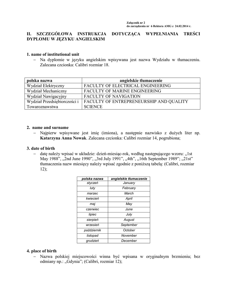 Załącznik nr 2 do zarządzenia nr 6 Rektora AMG z 24.02.2014 r. II. SZCZEGÓŁOWA INSTRUKCJA DYPLOMU W JĘZYKU ANGIELSKIM DOTYCZĄCA WYPEŁNIANIA TREŚCI 1. name of institutional unit Na dyplomie w języku angielskim wpisywana jest nazwa Wydziału w tłumaczeniu. Zalecana czcionka: Calibri rozmiar 18. polska nazwa Wydział Elektryczny Wydział Mechaniczny Wydział Nawigacyjny Wydział Przedsiębiorczości i Towaroznawstwa angielskie tłumaczenie FACULTY OF ELECTRICAL ENGINEERING FACULTY OF MARINE ENGINEERING FACULTY OF NAVIGATION FACULTY OF ENTREPRENEURSHIP AND QUALITY SCIENCE 2. name and surname Najpierw wpisywane jest imię (imiona), a następnie nazwisko z dużych liter np. Katarzyna Anna Nowak. Zalecana czcionka: Calibri rozmiar 14, pogrubiona; 3. date of birth datę należy wpisać w układzie: dzień-miesiąc-rok, według następującego wzoru: „1st May 1988”, „2nd June 1990”, „3rd July 1991”, „4th”, „16th September 1989”; „21st” tłumaczenia nazw miesięcy należy wpisać zgodnie z poniższą tabelą: (Calibri, rozmiar 12); polska nazwa styczeń angielskie tłumaczenie January luty February marzec March kwiecień April maj May czerwiec June lipiec July sierpień August wrzesień September październik October listopad November grudzień December 4. place of birth Nazwa polskiej miejscowości winna być wpisana w oryginalnym brzmieniu; bez odmiany np.: „Gdynia”; (Calibri, rozmiar 12); W przypadku absolwentów urodzonych poza granicami Polski nazwa miejscowości winna być wpisana w oryginalnym brzmieniu lub w tłumaczeniu na język angielski (np. miejsce urodzenia: Wiedeń – dopuszczalne zapisy: Wien lub Vienna); W przypadku gdy miejsce urodzenia wpisane zostało alfabetem innym niż łaciński (np. cyrylicą), należy zastosować jego transliterację. Pomocne w tym zakresie mogą być publikacje Komisji Standaryzacji Nazw Geograficznych poza Granicami Rzeczypospolitej Polskiej, dostępne na stronie internetowej http://ksng.gugik.gov.pl 5. Podpis posiadacza dyplomu (signature of diploma holder) Podpis musi być czytelny; 6. diploma No Numer dyplomu nadawany jest w zespole Prorektora ds. Kształcenia. Numer dyplomu wpisywany na oryginale, na odpisach dyplomu, w suplemencie i księdze dyplomów musi być identyczny. 7. of ………. cycle Należy wpisać odpowiednio (pierwszego stopnia) "first" lub (drugiego stopnia) "second", (Calibri, rozmiar 12); 8. cycle of ………... profile Należy wpisać odpowiednio (ogólnmoakademcki) - "general academic" lub (praktyczny) - "practical" profile, (Calibri, rozmiar 12); 9. in the area of ……. należy wpisać odpowiednio obszar kształcenia, zgodnie z właściwą uchwałą Senatu AMG w sprawie określenia efektów kształcenia na określonym kierunku i poziomie kształcenia, z dużej litery, w tłumaczeniu na język angielski: (Calibri, rozmiar 12); polska nazwa nauk humanistycznych nauk społecznych nauk ścisłych nauk przyrodniczych nauk technicznych angielskie tłumaczenie Humanities Social studies Exact sciences Biological sciences Technical sciences UWAGA: Punkty 8 i 9 należy wypełnić tylko w przypadku absolwentów, którzy zrealizowali program kształcenia opracowany na bazie Krajowych Ram Kwalifikacji dla Szkolnictwa Wyższego (rozpoczęcie studiów w roku 2012/2013); w przypadku absolwentów kierunków studiów, którzy zrealizowali program nauczania opracowany w oparciu o standardy kształcenia (rozporządzenie Ministra Nauki i Szkolnictwa Wyższego z dnia 12 lipca 2007 r. w sprawie standardów kształcenia dla poszczególnych kierunków oraz poziomów kształcenia, a także trybu tworzenia i warunków, jakie musi spełniać uczelnia, by prowadzić studia międzykierunkowe oraz makrokierunki, Dz. U. z 2007 r. Nr 164 poz. 1166 z późn. zm.), należy umieścić poziomą kreskę „—”; 9. in the field of........ Należy wpisać nazwę kierunku z dużej litery zgodnie z Uchwałą nr 271/2008 Rady Głównej Szkolnictwa Wyższego z dnia 13 marca 2008 roku w sprawie zatwierdzenia nazw kierunków studiów w języku angielskim polska nazwa angielska nazwa Elektronika i telekomunikacja Electronics and Telecommunications Elektrotechnika Electrical Engineering Zarządzanie Management Mechanika i Budowa Maszyn Mechanical Engineering Nawigacja Navigation Transport Transport Towaroznawstwo Commodity Science 10. with major in …… Należy wpisać anglojęzyczną nazwę specjalności w brzmieniu ustalonym przez Dziekana Wydziału, z dużej litery, np. "Business Management" 11. of …….. programme; Należy wpisać odpowiednio: stacjonarna – „full-time” (pisane z małej litery) lub niestacjonarna – „part-time” (pisane z małej litery), (Calibri, rozmiar 12); 12. the final grade: ............... Należy wpisać słownie ocenę końcową, w formie nieodmienionej, z małej litery, w tłumaczeniu na język angielski, zgodnie z zasadami określonymi w Regulaminie Studiów AMG, (Calibri, rozmiar 12); polska nazwa celujący bardzo dobry plus dobry dobry plus dostateczny dostateczny angielska nazwa excellent very good more than good good quite good satisfactory 13. the degree awarded ………… Należy wpisać w formie nieodmienionej z małej litery , w j. polskim, zgodnie z tytułem zawodowym wpisanym na oryginale dyplomu (nazwa tytułu zawodowego nie jest tłumaczona) np. licencjat, inżynier, magister, magister inżynier; 14. on ………. Należy wpisać datę złożenia z wynikiem pozytywnym egzaminu dyplomowego, według następującego wzoru: „15th May 2014”; 15. Place: ….. Date: …… Miejsce należy wpisać w języku polskim, data w języku angielskim, np.: Place: „Gdynia Date: 17th June 2014”;