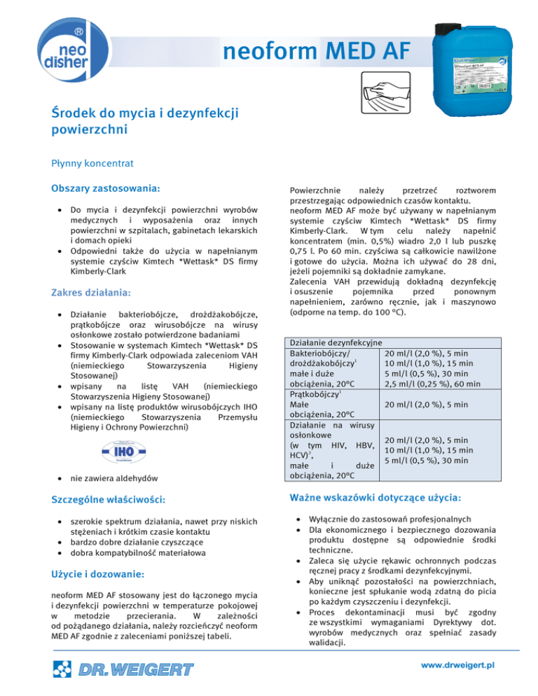 neoform MED AF Środek do mycia i dezynfekcji powierzchni Płynny koncentrat Obszary zastosowania: • Do mycia i dezynfekcji powierzchni wyrobów medycznych i wyposażenia oraz innych powierzchni w szpitalach, gabinetach lekarskich i domach opieki • Odpowiedni także do użycia w napełnianym systemie czyściw Kimtech *Wettask* DS firmy Kimberly-Clark Zakres działania: • Działanie bakteriobójcze, drożdżakobójcze, prątkobójcze oraz wirusobójcze na wirusy osłonkowe zostało potwierdzone badaniami • Stosowanie w systemach Kimtech *Wettask* DS firmy Kimberly-Clark odpowiada zaleceniom VAH (niemieckiego Stowarzyszenia Higieny Stosowanej) • wpisany na listę VAH (niemieckiego Stowarzyszenia Higieny Stosowanej) • wpisany na listę produktów wirusobójczych IHO (niemieckiego Stowarzyszenia Przemysłu Higieny i Ochrony Powierzchni) • nie zawiera aldehydów Szczególne właściwości: • szerokie spektrum działania, nawet przy niskich stężeniach i krótkim czasie kontaktu • bardzo dobre działanie czyszczące • dobra kompatybilność materiałowa Użycie i dozowanie: neoform MED AF stosowany jest do łączonego mycia i dezynfekcji powierzchni w temperaturze pokojowej w metodzie przecierania. W zależności od pożądanego działania, należy rozcieńczyć neoform MED AF zgodnie z zaleceniami poniższej tabeli. Powierzchnie należy przetrzeć roztworem przestrzegając odpowiednich czasów kontaktu. neoform MED AF może być używany w napełnianym systemie czyściw Kimtech *Wettask* DS firmy Kimberly-Clark. W tym celu należy napełnić koncentratem (min. 0,5%) wiadro 2,0 l lub puszkę 0,75 l. Po 60 min. czyściwa są całkowicie nawilżone i gotowe do użycia. Można ich używać do 28 dni, jeżeli pojemniki są dokładnie zamykane. Zalecenia VAH przewidują dokładną dezynfekcję i osuszenie pojemnika przed ponownym napełnieniem, zarówno ręcznie, jak i maszynowo (odporne na temp. do 100 °C). Działanie dezynfekcyjne Bakteriobójczy/ 20 ml/l (2,0 %), 5 min 1 drożdżakobójczy 10 ml/l (1,0 %), 15 min małe i duże 5 ml/l (0,5 %), 30 min obciążenia, 20°C 2,5 ml/l (0,25 %), 60 min 1 Prątkobójczy Małe 20 ml/l (2,0 %), 5 min obciążenia, 20°C Działanie na wirusy osłonkowe 20 ml/l (2,0 %), 5 min (w tym HIV, HBV, 10 ml/l (1,0 %), 15 min 2 HCV) , 5 ml/l (0,5 %), 30 min małe i duże obciążenia, 20°C Ważne wskazówki dotyczące użycia: • Wyłącznie do zastosowań profesjonalnych • Dla ekonomicznego i bezpiecznego dozowania produktu dostępne są odpowiednie środki techniczne. • Zaleca się użycie rękawic ochronnych podczas ręcznej pracy z środkami dezynfekcyjnymi. • Aby uniknąć pozostałości na powierzchniach, konieczne jest spłukanie wodą zdatną do picia po każdym czyszczeniu i dezynfekcji. • Proces dekontaminacji musi być zgodny ze wszystkimi wymaganiami Dyrektywy dot. wyrobów medycznych oraz spełniać zasady walidacji. www.drweigert.pl neoform MED AF • Nie mieszać z innymi produktami. dezynfekcyjne należy • Środki stosować w bezpieczny sposób. Przed użyciem należy zawsze zapoznać się z etykietą produktu. Raporty / opinie: Wpisany na listę VAH (niemieckiego Stowarzyszenia Higieny Stosowanej). Skuteczność dezynfekcyjna została potwierdzona odpowiednimi badaniami. Raporty z badań dostępne są na życzenie. Kompatybilność oraz wytrzymałość systemu Kimtech *Wettask* DS Kimberly-Clark zgodnie z zaleceniami VAH, potwierdzone certyfikatem. Dane techniczne: Wartość pH Lepkość Gęstość Rodzaje zagrożeń i zasady prawidłowego postępowania: Klasyfikacja i oznakowanie koncentratu według Dyrektywy 1999/45/WE odnoszącej się do preparatów niebezpiecznych: Oznaczenie zagrożenia: C – produkt żrący, N – produkt niebezpieczny dla środowiska, zawiera: chlorek didecylodimetyloamoniowy,, chlorowodorek poliheksametylenu biguanidu Rodzaje zagroż zagroż e ń : R 22 R 34 R 43 R 51/53 ok. 6 (koncentrat, 20 °C) < 10 mPa s 1,0 g/cm3 (20 °C) Skład: Prawidł postę Prawidł owe postę powanie niebezpieczną niebezpieczn ą: S 23 Zawartość składników według Rozporządzenia WE 648/2004 w sprawie detergentów: 5-15% niejonowe środki powierzchniowo czynne, substancje zapachowe Substancje aktywne w 100g: 17,5g chlorek didecylodimetyloamoniowy, 4,0g poliheksanidyna S 26 S 27 S 28 Oznakowanie CE: S 36/37/39 neoform MED AF spełnia wymagania dotyczące wyrobów medycznych zgodnie z Dyrektywą 93/42/EWG, załącznik I. S 45 Magazynowanie: Przechowywać w szczelnie zamkniętych pojemnikach w temperaturach od 0 do 25 °C. Przy prawidłowym magazynowaniu okres trwałości wynosi 4 lata od daty produkcji. Data ważności podana jest na etykiecie za symbolem . _________________________________________________________________ 1 zgodnie z wytycznymi DGHM (Niemieckiego Towarzystwa Higieny i Mikrobiologii) 2 zgodnie z wytycznymi RKI/DVV (Instytutu Roberta Kocha / Niemieckiego Stowarzyszenia Zwalczania Chorób Wirusowych) Działa szkodliwie po połknięciu. Powoduje oparzenia. Może powodować uczulenie w kontakcie ze skórą. Działa toksycznie na organizmy wodne. Może powodować długo utrzymujące się niekorzystne zmiany w środowisku wodnym. z mieszaniną mieszaniną Nie wdychać gazu /dymu /pary /rozpylonej cieczy Zanieczyszczone oczy przemyć natychmiast dużą ilością wody i zasięgnąć porady lekarza. Natychmiast zdjąć całą zanieczyszczoną odzież. Zanieczyszczoną skórę natychmiast przemyć dużą ilością Nosić odpowiednią odzież ochronną, odpowiednie rękawice ochronne, i okulary lub ochronę twarzy. W przypadku awarii lub jeżeli źle się poczujesz, niezwłocznie zasięgnij porady lekarza – jeżeli to możliwe, pokaż etykietę. Zamknięte opakowania należy usuwać jako odpady tylko po całkowitym opróżnieniu. Usuwanie resztek produktu według zaleceń zamieszczonych w karcie charakterystyki. Informacje dotyczące bezpieczeństwa i ochrony środowiska znajdują się w karcie charaktery