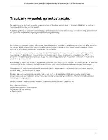 Biuletyn Informacji Publicznej Komendy Powiatowej PSP w Świebodzinie Tragiczny wypadek na autostradzie. Do tragicznego w skutkach wypadku na autostradzie A2 doszło w poniedziałek 17 listopada 2014 roku w okolicach miejscowości Żelechów (gmina Łagów). Tuż przed godziną 20. operator wojewódzkiego centrum powiadamiania ratunkowego w Gorzowie Wlkp. przekierował do dyżurnego świebodzińskiego pogotowia ratunkowego rozmowę. Mężczyzna opanowanym głosem informował, że jest świadkiem wypadku na 56 kilometrze autostrady A2 w kierunku na Poznań, w którym doszło do zderzenia dwóch samochodów osobowych. Dalej mówił o dwóch rannych osobach. Informacja ta błyskawicznie została przekazana dla strażaków. Na pomoc natychmiast ruszyły dwa zastępy świebodzińskiej jednostki ratowniczo-gaśniczej i zespół ratownictwa medycznego. Po dojeździe we wskazane miejsce okazało się, że doszło do zderzenia półciężarowego VW LT na żnińskich numerach rejestracyjnych (woj. kujawsko-pomorskie) z osobowym Peugeotem Partnerem na numerach płockich (woj. mazowieckie). Kierowcy opuścili pojazdy przed przybyciem służb ratowniczych nie odnosząc obrażeń. Wskutek wypadku, w poważnie uszkodzonym aucie, uwięziony został pasażer osobówki. Jego stroną bowiem samochód uderzył w Volkswagena. Nieprzytomnego mężczyznę uwolnili przygodni użytkownicy autostrady i przystąpili do jego reanimacji. Niestety, przybyły lekarz stwierdził zgon 51. latka. Strażacy zabezpieczyli miejsce zdarzenia, wstrzymali ruch na drodze i oświetlili teren wypadku umożliwiając przeprowadzenie, pod nadzorem prokuratora, czynności grupie policyjnych techników, których dochodzenie ustali dokładny przebieg wypadku. Jest to pierwsza, śmiertelna ofiara wypadku na świebodzińskim odcinku autostrady A2. bryg. Dariusz Paczesny zastępca komendanta powiatowego Państwowej Straży Pożarnej w Świebodzinie 1