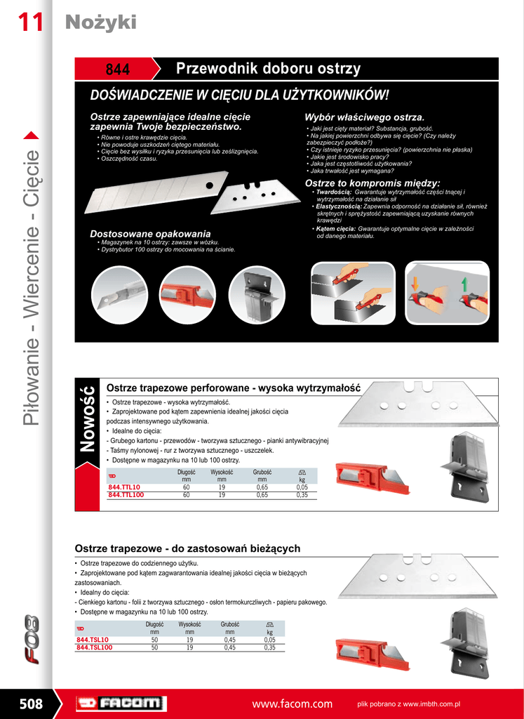 11 Nożyki Przewodnik doboru ostrzy 844 DOŚWIADCZENIE W CIĘCIU DLA UŻYTKOWNIKÓW! Wybór właściwego ostrza. • Jaki jest cięty materiał? Substancja, grubość. • Na jakiej powierzchni odbywa się cięcie? (Czy należy zabezpieczyć podłoże?) • Czy istnieje ryzyko przesunięcia? (powierzchnia nie płaska) • Jakie jest środowisko pracy? • Jaka jest częstotliwość użytkowania? • Jaka trwałość jest wymagana? • Równe i ostre krawędzie cięcia. • Nie powoduje uszkodzeń ciętego materiału. • Cięcie bez wysiłku i ryzyka przesunięcia lub ześlizgnięcia. • Oszczędność czasu. Ostrze to kompromis między: • Twardością: Gwarantuje wytrzymałość części tnącej i wytrzymałość na działanie sił • Elastycznością: Zapewnia odporność na działanie sił, również skrętnych i sprężystość zapewniającą uzyskanie równych krawędzi • Kątem cięcia: Gwarantuje optymalne cięcie w zależności od danego materiału. Dostosowane opakowania • Magazynek na 10 ostrzy: zawsze w wózku. • Dystrybutor 100 ostrzy do mocowania na ścianie. Nowość Piłowanie - Wiercenie - Cięcie Ostrze zapewniające idealne cięcie zapewnia Twoje bezpieczeństwo. Ostrze trapezowe perforowane - wysoka wytrzymałość • Ostrze trapezowe - wysoka wytrzymałość. • Zaprojektowane pod kątem zapewnienia idealnej jakości cięcia podczas intensywnego użytkowania. • Idealne do cięcia: - Grubego kartonu - przewodów - tworzywa sztucznego - pianki antywibracyjnej - Taśmy nylonowej - rur z tworzywa sztucznego - uszczelek. • Dostępne w magazynku na 10 lub 100 ostrzy. Długość F mm 60 60 844.TTL10 844.TTL100 Wysokość mm 19 19 Grubość mm 0,65 0,65 D kg 0,05 0,35 Ostrze trapezowe - do zastosowań bieżących • Ostrze trapezowe do codziennego użytku. • Zaprojektowane pod kątem zagwarantowania idealnej jakości cięcia w bieżących zastosowaniach. • Idealny do cięcia: - Cienkiego kartonu - folii z tworzywa sztucznego - osłon termokurczliwych - papieru pakowego. • Dostępne w magazynku na 10 lub 100 ostrzy. F 844.TSL10 844.TSL100 508 Długość mm 50 50 Wysokość mm 19 19 Grubość mm 0,45 0,45 D kg 0,05 0,35 www.facom.com plik pobrano z www.imbth.com.pl