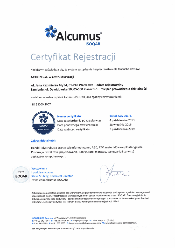 #Alcumus ISOQAR kmtK*jestracji ffimnty$il dIała cuchadostaw: bezpieczeristwa się,żesystemzarzqdzania zaświadcza Niniejszym ACTIONS.A. w restrukturyzacii uf. Jana Kazimierza46154,Ot-248Warszawa- adres reiestracyiny Zamienie,ul. Dawidowska10,o5.5o0Piaseczno- miejsceprowadzeniadzia|alności jakozgodnyz wymaganiami: przezAlcumusISOQAR zostatzatwierdzony ISO28000:2007 Numer certyfikatu: po raz pierwszy: Datazatwierdzenia Dataponownegozatwierdzenia: certyfikatu: Dataważności 14841-SCS-001P1 2oL3 4 października 2016 28 września f0I9 3 października Zakresdzialalności: AGD, RTV,materiatÓweksp|oatacyjnych. Handeli dystrybucjabranżyteleinformatycznej, testowaniaiserwisu) montażu, konfiguracjl, Produkcja(w zakresieprojektowania, zestawÓwkomputerowych. ' original , t,. . tsoQAR: .i ,.: Wystawiony i podpisany przezl Steve Stubley,Technical Director (w i m i e n i u A l c u m u s I SO Q A R ) Zatwierdzeniepozostajeaktua|nepod warunkiem,ie pzedsiębiorstwoutzymuje swÓj system zgodniez wymaganiami odpowiednichnorm.Przestzeganie wymaga tych norm będziemonitorowaneprzez lsoQAR. Da|szewyjaŚnienie dotyczącezakresu tego certyfikatui zastosowaniaodpowiednichwymaga standardÓwmożnauzyskaĆprzez kontakt z |SQQAR. Niniejszycertyfikatjest jednymz ki|kuwydanychna numerĘestracji 14841. |soQAR CEE Sp. z o.o. u|.Wąwozowa11,02-796Warszawa T: +4822 649 76 64 Ft +4822 349 95 62 E: [email protected]: www.isoqar.pl(Polska) (UK) W: www.alcumusgroup.com/isoqar T: 0161 865 3699 F:0 161 865 3685 E: [email protected] lSoQAR i musi być zwrÓcony na żądanie Ten certyfikatjest Własnością