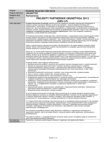Fragmenty pisane kursywą zostały dodane przez polską Narodową Agencję Program Program sektorowy Kategoria akcji Akcja Cele i opis akcji Uczenie się przez całe życie GRUNDTVIG Partnerstwa PROJEKTY PARTNERSKIE GRUNDTVIGA 2013 (GRU-LP) Projekty Partnerskie Grundtviga stanowią ramy dla współpracy pomiędzy organizacjami działającymi w obszarze szeroko rozumianej edukacji (uczenia się) dorosłych – zarówno edukacji formalnej jak i pozaformalnej i nieformalnej. W odróżnieniu od projektów wielostronnych Grundtviga realizowanych w ramach tzw. akcji scentralizowanych, które są projektami na większą skalę i są zorientowane na produkt lub konkretny rezultat, Projekty Partnerskie Grundtviga są zorientowane na proces i mają na celu rozszerzenie współpracy europejskiej pomiędzy mniejszymi organizacjami, które chcą uwzględnić współpracę europejską w swojej działalności edukacyjnej. W Projektach Partnerskich Grundtviga kadra i dorośli słuchacze z przynajmniej trzech uczestniczących krajów pracują wspólnie nad jednym lub więcej obszarami tematycznymi, które stanowią przedmiot wspólnego zainteresowania współpracujących organizacji. Taka wymiana doświadczeń, praktyk i metod przyczynia się do podniesienia świadomości zróżnicowania kulturowego, społecznego i gospodarczego Europy oraz do lepszego zrozumienia obszarów wspólnego zainteresowania w dziedzinie uczenia się dorosłych. Jedna z uczestniczących organizacji musi pełnić rolę koordynatora. Na etapie składania wniosków należy określić, którzy z partnerów gotowi są pełnić rolę koordynatora w przypadku, gdy pierwotny koordynator zostanie odrzucony w procesie selekcji. Zaleca się, by uczestniczące organizacje dokonywały monitorowania i ewaluacji swojej międzynarodowej współpracy oraz by starały się połączyć działania projektu z inicjatywami realizowanymi przez społeczność lokalną. Zachęca się je również do współpracy z organizacjami i władzami na poziomie krajowym, w celu pozyskania wsparcia dla koncepcji i działań projektu oraz w celu upowszechnienia projektu. To z kolei pozwoli na zwiększenie wartości wymiany ponadnarodowej, promowanie rozpowszechniania dobrych praktyk i tym samym zapewnienie szerszego wykorzystania wypracowanych rezultatów. Przykłady działań, jakie mogą być dofinansowane: Spotkania partnerów projektu i seminaria dla wszystkich instytucji zaangażowanych w projekt partnerski Wyjazdy do organizacji partnerskich kadry i dorosłych słuchaczy uczestniczących w projekcie Wymiana doświadczeń i dobrych praktyk, z wykorzystaniem odpowiednich środków, a szczególnie z wykorzystaniem technologii informacyjno-komunikacyjnych (np. strony internetowe, e-mail, videokonferencje) Wykonanie przedmiotów technicznych, rysunków i prac artystycznych dot. tematyki projektu Prace w terenie, analizy i badania dot. tematyki projektu, itp. Organizowanie przedstawień (np. sztuk teatralnych, musicali, itd.) Przygotowanie językowe osób zaangażowanych w realizację projektu w celu zapewnienia, że posiadają one niezbędne kompetencje w zakresie języka(-ów) roboczego(-ych) projektu Współpraca z innymi projektami dotycząca podobnych obszarów tematycznych (szczególnie z projektami partnerskimi, projektami scentralizowanymi i sieciami Grundtviga) wymiana doświadczeń z instytucjami w regionie, itp., z uwzględnieniem wyjazdów na wydarzenia organizowane w ramach sieci Autoewaluacja Organizowanie wystaw, opracowywanie, publikowanie i rozpowszechnianie materiałów i dokumentacji dotyczących działań prowadzonych w ramach współpracy Rozpowszechnianie doświadczeń i efektów projektu W tych Projektach Partnerskich Grundtviga, które koncentrują się na udziale dorosłych słuchaczy należy aktywnie angażować słuchaczy we wszystkie działania projektowe i zachęcać ich do wyjazdów zagranicznych w możliwie najszerszym zakresie. Projekty w kategorii, która obejmuje największą liczbę wyjazdów, tj. przynajmniej 24, muszą angażować w wyjazdy przynajmniej 16 różnych dorosłych słuchaczy. Te Projekty Partnerskie Grundtviga, które koncentrują się na zarządzaniu edukacją dorosłych i/lub metodach nauczania powinny zapewniać nauczycielom, szkoleniowcom i innym przedstawicielom kadry zarządzającej edukacją dorosłych możliwości wymiany doświadczeń i informacji, wspólnego opracowywania metod i rozwiązań, spełniających ich potrzeby oraz testowania i wprowadzania w życie nowych rozwiązań organizacyjnych i pedagogicznych. We wszystkich przypadkach projekty mogą obejmować współpracę z organizacjami działającymi w społeczności lokalnej, takimi jak władze lokalne, instytucje systemu opieki społecznej, stowarzyszenia i przedsiębiorstwa. Kto może być beneficjentem Tam gdzie to możliwe, w przypadku dorosłych słuchaczy należy zwrócić szczególną uwagę na uczestnictwo osób z grup defaworyzowanych społecznie. Pracownicy i słuchacze uczestniczących instytucji i organizacji oraz społeczność lokalna. Strona 1 z 4 Kto może składać wniosek PRIORYTETY JAK SKŁADAĆ WNIOSEK Wszelkiego rodzaju instytucje i organizacje działające w ramach formalnej, pozaformalnej lub nieformalnej edukacji dorosłych. Uprawnione do składania wniosków w Polsce są instytucje zgodnie z wykazem: Uprawnione są poniżej wymienione organizacje publiczne oraz niepubliczne, posiadające bądź nieposiadające osobowości prawnej, czyli również osoby fizyczne prowadzące działalność gospodarczą oraz spółki cywilne. 1. Gimnazjum dla Dorosłych 2. Liceum dla Dorosłych 3. Uniwersytety Trzeciego Wieku 4. Uniwersytety Ludowe 5. Uniwersytety Otwarte 6. Stowarzyszenia, fundacje i inne organizacje prowadzące działalność edukacyjną na rzecz osób dorosłych wymagających szczególnego wsparcia (np. niepełnosprawni, rodziny dysfunkcyjne, mieszkańcy terenów wiejskich, ubodzy, migranci, osoby bez średniego wykształce