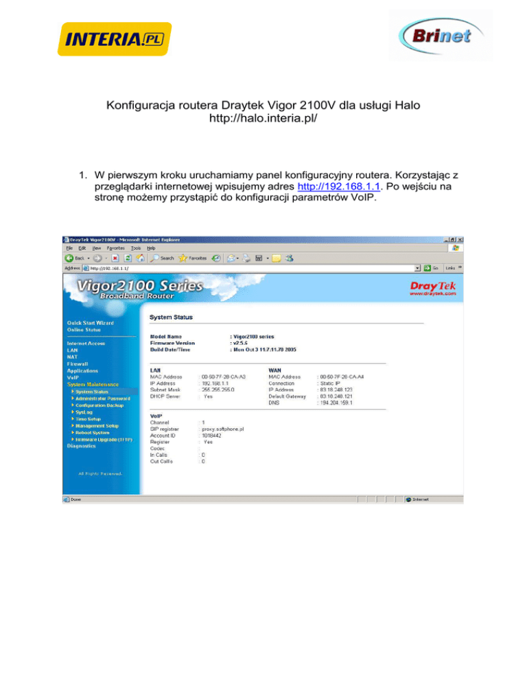 Konfiguracja routera Draytek Vigor 2100V d la u słu g i H a lo http://halo.interia.pl/ 1. W p ie rw szym kro ku u ru ch a m ia m y p a n e l ko n fig u ra cyjn y ro u te ra . K o rzysta ją c z p rze g lą d a rki in te rn e to w e j w p isu je m y a d re s http://192.168.1.1. P o w e jściu n a stro n ę m o że m y p rzystą p ić d o ko n fig u ra cji p a ra m e tró w V o IP . 2. N a stę p n ie w yb ie ra m y za kła d kę VoIP. W o kie n ku p o ja w i się 5 ka te g o rii: D ia l Plan, SIP Related Function, Codec/RTP/DTMF, Voice Call Status,QoS. Aby nasz system dzia ła ł p ra w id ło w o w ysta rczy sko n fig u ro w a ć trzy p o zycje : S IP Related Function, Codec/RTP/DTMF i QoS. 3. P rze ch o d zą c d o ka te g o rii S IP R e la te d F u n ctio n s d e fin iu je m y p a ra m e try, któ re o trzym a liśm y o d n a sze g o u słu g o d a w cy. a) pole SIP port -> wp isu je m y w a rto ść 5060 b) pole Registar -> wpisujemy proxy.softphone.pl c) pole Proxy – > wpisujemy proxy.softphone.pl d) pole Domain/Realm – > wpisujemy proxy.softphone.pl e) pole Stun Server -> odznaczamy jako aktywne i wpisujemy stun.softphone.pl f) pole Use Registrar -> odznaczamy jako aktywne g) pole Display Name -> wpisujemy nr Halo otrzymany mailem, któ ry b ę d zie w yśw ie tla n y o d b io rcy p o ła cze n ia h) pole Account Name -> wpisujemy nr Halo otrzymany mailem i) pole Authorization User-> w p isu je m y ja k w yże j nr Halo otrzymany mailem Uwa g a : n r H a lo , któ ry w p isyw a liśm y w p p kt. g ) i) o ra z h ) o trzym u je m y m a ile m p o d o ko n a n iu re je stra cji n a stro n a ch In te rii. W a żn e ! N ie je st to te n sa m lo g in i hasło , któ rym lo g u je m y się d o n a sze g o ko n ta n p . w ce lu je g o d o ła d o w a n ia . j) pole Password -> wpisujemy h a sło H a lo o trzym a n e m a ile m k) pole Expiry Time -> p ro p o n u je m y w yb ra ć w a rto ść 30 minut Z a p isu je m y i za tw ie rd za m y w szystkie zm ia n y klika ją c p rzycisk O K . 4. N a stę p n ie w yb ie ra m y za kła d kę C o d e c/R T P /D T M F , g d zie m o że m y zd e fin io w a ć p a ra m e try m a ją ce w p ływ n a ja ko ść tra n sm isji syg n a łu m o w y. S u g e ru je m y p o zo sta w ić p rze d sta w io n e p o n iże j w a rto ści d o m yśln e . Je śli d ysp o n u ja P a ń stw o łą cze m o w yso kie j p rze p ływ n o ści „w g ó rę ” (a n g . u p lin k) m o żn a w p o lu D e fa u lt C o d e c u sta w ić ko d e ki G .7 1 1 A lu b G .7 1 1 M U . 5. W o sta tn im kro ku ko n fig u ra cji p rze ch o d zim y d o za kła d ki Q o S . W tym m ie jscu w p isu je m y p a sm o ja kim d ysp o n u je n a sze łą cze „w kie ru n ku w g ó re ” (w K b p s). D la p rzykła d u p o sia d a ją c u słu g ę In te rn e t D S L 1 0 2 4 /2 5 6 p o w in n iśm y w p o lu U p stre a m S p e e d w p isa ć w a rto ść 2 56. F u n kcję u a ktyw n im y g d y o d h a czym y p o le E n a b le th e Q o S C o n tro l i za tw ie rd zim y zmiany przyciskiem OK. 6. T a k sko n fig u ro w a n e u rzą d ze n ie je st ju ż g o to w e d o re a lizo w a n ia p o łą cze ń V o IP p rzy w yko rzysta n iu u słu g ii H a lo . A b y u p e w n ić się czy je ste śm y za re je stro w a n i u o p e rta o ra u słu g i w ch o d zim y n a za kła d kę V o ice C a ll S ta tu s. L ite rka (R ) p rzy p o rcie 1 o zn a cza , że n a sze p o łą cze n ie je st sko n fig u ro w a n e p ra w id ło w o , a u rzą d ze n ie je st g o to w e d o o d b ie ra n ia i w yko n yw a n ia p o łą cze ń VoIP.