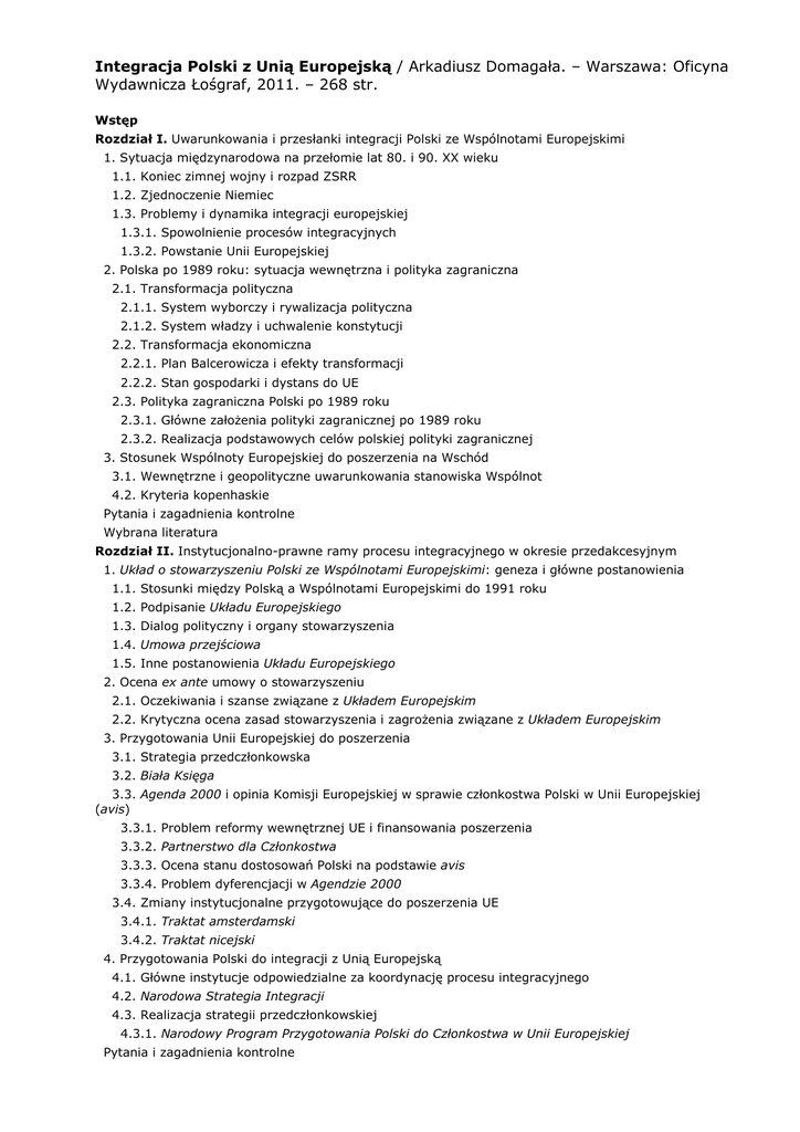 Integracja Polski z Unią Europejską / Arkadiusz Domagała. – Warszawa: Oficyna Wydawnicza Łośgraf, 2011. – 268 str. Wstęp Rozdział I. Uwarunkowania i przesłanki integracji Polski ze Wspólnotami Europejskimi 1. Sytuacja międzynarodowa na przełomie lat 80. i 90. XX wieku 1.1. Koniec zimnej wojny i rozpad ZSRR 1.2. Zjednoczenie Niemiec 1.3. Problemy i dynamika integracji europejskiej 1.3.1. Spowolnienie procesów integracyjnych 1.3.2. Powstanie Unii Europejskiej 2. Polska po 1989 roku: sytuacja wewnętrzna i polityka zagraniczna 2.1. Transformacja polityczna 2.1.1. System wyborczy i rywalizacja polityczna 2.1.2. System władzy i uchwalenie konstytucji 2.2. Transformacja ekonomiczna 2.2.1. Plan Balcerowicza i efekty transformacji 2.2.2. Stan gospodarki i dystans do UE 2.3. Polityka zagraniczna Polski po 1989 roku 2.3.1. Główne założenia polityki zagranicznej po 1989 roku 2.3.2. Realizacja podstawowych celów polskiej polityki zagranicznej 3. Stosunek Wspólnoty Europejskiej do poszerzenia na Wschód 3.1. Wewnętrzne i geopolityczne uwarunkowania stanowiska Wspólnot 4.2. Kryteria kopenhaskie Pytania i zagadnienia kontrolne Wybrana literatura Rozdział II. Instytucjonalno-prawne ramy procesu integracyjnego w okresie przedakcesyjnym 1. Układ o stowarzyszeniu Polski ze Wspólnotami Europejskimi: geneza i główne postanowienia 1.1. Stosunki między Polską a Wspólnotami Europejskimi do 1991 roku 1.2. Podpisanie Układu Europejskiego 1.3. Dialog polityczny i organy stowarzyszenia 1.4. Umowa przejściowa 1.5. Inne postanowienia Układu Europejskiego 2. Ocena ex ante umowy o stowarzyszeniu 2.1. Oczekiwania i szanse związane z Układem Europejskim 2.2. Krytyczna ocena zasad stowarzyszenia i zagrożenia związane z Układem Europejskim 3. Przygotowania Unii Europejskiej do poszerzenia 3.1. Strategia przedczłonkowska 3.2. Biała Księga 3.3. Agenda 2000 i opinia Komisji Europejskiej w sprawie członkostwa Polski w Unii Europejskiej (avis) 3.3.1. Problem reformy wewnętrznej UE i finansowania poszerzenia 3.3.2. Partnerstwo dla Członkostwa 3.3.3. Ocena stanu dostosowań Polski na podstawie avis 3.3.4. Problem dyferencjacji w Agendzie 2000 3.4. Zmiany instytucjonalne przygotowujące do poszerzenia UE 3.4.1. Traktat amsterdamski 3.4.2. Traktat nicejski 4. Przygotowania Polski do integracji z Unią Europejską 4.1. Główne instytucje odpowiedzialne za koordynację procesu integracyjnego 4.2. Narodowa Strategia Integracji 4.3. Realizacja strategii przedczłonkowskiej 4.3.1. Narodowy Program Przygotowania Polski do Członkostwa w Unii Europejskiej Pytania i zagadnienia kontrolne Wybrana literatura Rozdział III. Dynamika i wybrane problemy procesu integracyjnego 1. Stosunki ekonomiczne Polski z Unią Europejską 1.1. Relacje handlowe i efekty umowy przejściowej 1.2. Rola i znaczenie Układu Europejskiego dla polskiej gospodarki 1.3. Przepływ kapitału między Unią Europejską a Polską 2. Harmonizacja prawa polskiego z acquis communautaire 2.1. Implementacja prawa unijnegom - uwagi wstępne 2.2. Układ Europejski a harmonizacja prawa 2.3. Procedury dostosowywania prawa unijnego w Polsce 2.4. Postępy w zakresie harmonizacji prawa 3. Opinia publiczna a integracja Polski z UE 3.1. Wizerunek UE i poparcie dla procesu akcesyjnego 3.2. Partie polityczne i ich elektorat a integracja Polski z UE 3.3. Konsekwencje integracji z UE w oczach opinii publicznej 3.4. Polityka informacyjna rządu 4. Antycypacja korzyści i kosztów jako determinanta procesu integracyjnego 4.1. Polityczne efekty integracji z UE 4.2. Makroekonomiczne i mikroekonomiczne konsekwencje integracji 4.3. Rolnictwo 4.3.1. Problemy dostosowawcze - diagnoza 4.3.2. Wspólna Polityka Rolna a polskie rolnictwo - koszty i korzyści 5. Pomoc przedakcesyjna i jej znaczenie dla integracji Polski z UE 5.1. PHARE 5.2. SAPARD 5.3. ISPA Pytania i zagadnienia kontrolne Wybrana literatura Rozdział IV. Przebieg i wyniki negocjacji akcesyjnych 1. Wybrane formalnoprawne i polityczne aspekty negocjacji akcesyjnych 1.1. Droga do rozpoczęcia negocjacji i procedura akcesji 1.2. Zasady negocjacji akcesyjnych 1.3. Struktura procesu negocjacyjnego 1.3.1. Screening 1.3.2. Negocjacje właściwe 1.4. Podmioty negocjacji akcesyjnych i ich rola 1.4.1. Organizacja struktury negocjacyjnej Polski 1.4.2. Organizacja struktury negocjacyjnej Unii Europejskiej 2. Przebieg negocjacji akcesyjnych Polski z Unią Europejską 2.1. Stanowiska negocjacyjne Polski 2.1.1. Jednolity rynek 2.1.2. Polityka regionalna 2.1.3. Rolnictwo 2.1.4. Środowisko 2.1.5. Polityka konkurencji 2.1.6. Transport 2.1.7. Podatki 2.1.8. Finanse i budżet 2.1.9. Inne obszary negocjacyjne 2.2. Dynamika negocjacji akcesyjnych 2.2.1. Zakończenie negocjacji w Kopenhadze 2.3. Wyniki i ocena negocjacji akcesyjnych 3.1. Rezultaty rozmów na temat przystąpienia Polski do UE 3.1.1. Jednolity rynek 3.1.2. Polityka regionalna 3.1.3. Rolnictwo 3.1.4. Środowisko 3.1.5. Polityka konkurencji 3.1.6. Transport 3.1.7. Podatki 3.1.8. Finanse i budżet 3.1.9. Inne obszary negocjacyjne 3.2. Ocena negocjacji akcesyjnych Pytania i zagadnienia kontrolne Wybrana literatura Rozdział V. Polska w Unii Europejskiej 1. Przystąpienie Polski do Unii Europejskiej 1.1. Traktat akcesyjny i warunki członkostwa 1.2. Referendum akcesyjne i ratyfikacja Traktatu akcesyjnego 1.3. Okres obserwatorski (30 kwietnia 2003 - 1 maja 2004 roku) 1.4. Miejsce i rola Polski w systemie instytucjonalnym UE 2. Skutki integracji Polski z Unią Europejską 2.1. Średniookresowe efekty w sferze gospodarczej 2.1.1. Sytuacja makroekonomiczna po 2004 roku - wybrane aspekty 2.1.2. Konsekwencje integracji dla rolnictwa 2.1.3. Finansowe konsekwencje poszerzenia - transfery na rzecz Polski 2.2. Średniookresowe efekty integracji w sferze społecznej 2.2.1. Opinia publiczna wobec integracji europejskiej po akcesji 3. Prawne aspekty integracji z Unią Europejską 3.1. Suwerenność Polski po 1 maja 2004 roku 3.2. Proces ustawodawczy a uczestnictwo