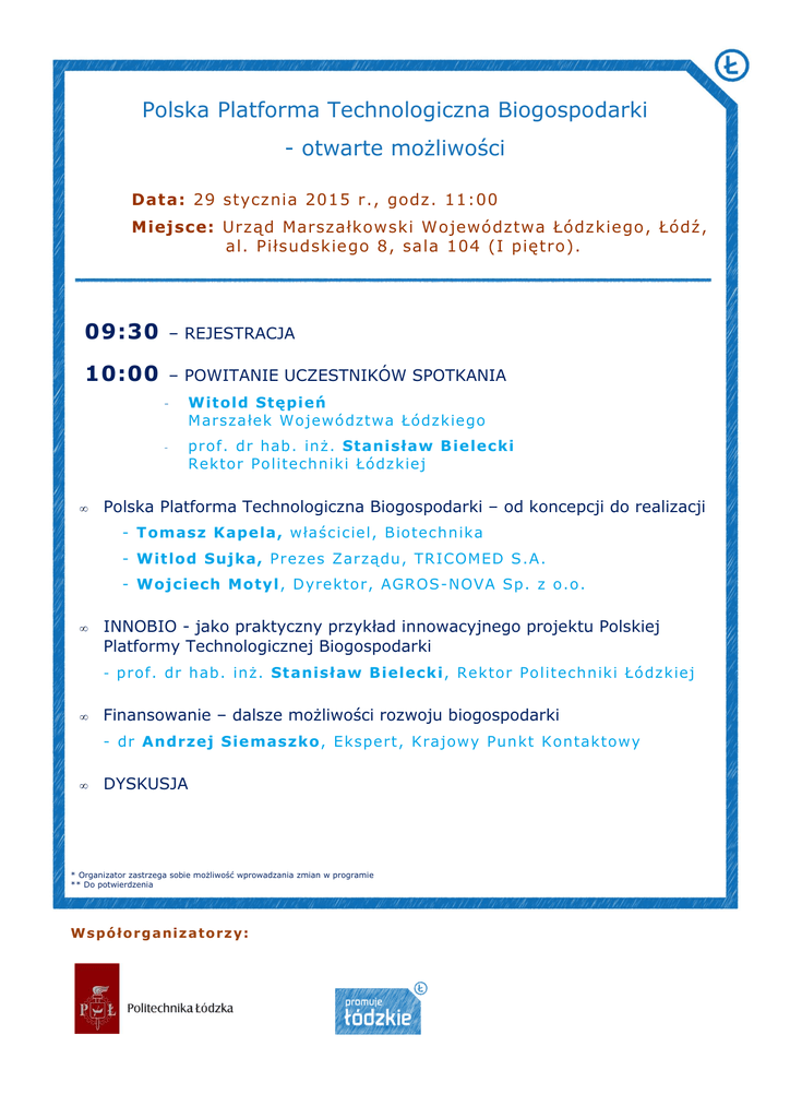 Polska Platforma Technologiczna Biogospodarki - otwarte możliwości Data: 29 stycznia 2015 r., godz. 11:00 Miejsce: Urząd Marszałkowski Województwa Łódzkiego, Łódź, al. Piłsudskiego 8, sala 104 (I piętro). 09:30 – REJESTRACJA 10:00 – POWITANIE UCZESTNIKÓW SPOTKANIA • - Witold Stępień Marsza łek Województwa Łódzkie go - prof. dr hab. inż. Stanis ław Bielecki Rektor Politechniki Łódzkiej Polska Platforma Technologiczna Biogospodarki – od koncepcji do realizacji - Tomasz Kapela, właścicie l, Biotechnika - Witlod Sujka, Prezes Zarządu, TRICOMED S.A. - Wojciech Motyl, Dyre ktor, AGROS-NOVA Sp. z o.o. • INNOBIO - jako praktyczny przykład innowacyjnego projektu Polskiej Platformy Technologicznej Biogospodarki - prof. dr hab. inż. Stanisław Bielecki, Rektor Politechniki Łódzkiej • Finansowanie – dalsze możliwości rozwoju biogospodarki - dr Andrzej Siemaszko, Ekspe rt, Krajowy Punkt Kontaktowy • DYSKUSJA * Organizator zastrzega sobie możliwość wprowadzania zmian w programie ** Do potwierdzenia W s pó ło r g a niz a to rz y: