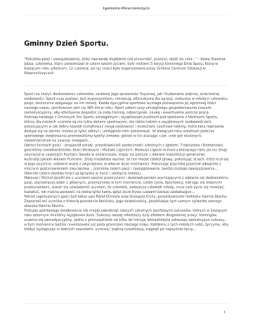 Igołomia-Wawrzeńczyce Gminny Dzień Sportu. "Potrzeba pasji i zaangażowania, żeby naprawdę dogłębnie coś zrozumieć, przeżyć, dojść do celu..." - słowa Stevena Jobsa, człowieka, który potwierdzał je całym swoim życiem, były mottem 5 edycji Gminnego Dnia Spotu, która w bieżącym roku szkolnym, 12 czerwca, po raz trzeci była organizowana przez Gminne Centrum Edukacji w Wawrzeńczycach. Sport ma służyć doskonaleniu człowieka, zarówno jego sprawności fizycznej, jak i budowaniu pięknej, szlachetnej osobowości. Sport uczy postaw, jest wypoczynkiem, rekreacją, alternatywą dla agresji, rozbudza w młodym człowieku pasje, skutecznie wpływając na ich rozwój. Każda dyscyplina sportowa wymaga poświęcenia jej ogromnej ilości naszego czasu, sportowcem jest się 365 dni w roku. Sport zatem uczy umiejętnego gospodarowania czasem, samodyscypliny, aby efektywnie pogodzić ze sobą trening, odpoczynek, naukę i ewentualnie jeszcze pracę. Podczas każdego z Gminnych Dni Sportu szczególnym i wyjątkowym punktem jest spotkanie z Mistrzami Sportu, którzy dla naszych uczniów są nie tylko idolami sportowymi, ale także ludźmi o wyjątkowych osobowościach, pokazującymi w jak dobry sposób kształtować swoją osobowość i doskonalić sportowe talenty, które taka naprawdę dostaje się za darmo, trzeba je tylko odkryć i umiejętnie nimi pokierować. W bieżącym roku szkolnym podczas sportowego świętowania promowaliśmy sporty zimowe, gdzieś w tle ukazując czar, urok gór otulonych, niejednokrotnie na zawsze, śniegiem... Oprócz licznych gości - przyjaciół szkoły, przedstawicieli społeczności szkolnych z Igołomi, Tropiszowa i Dobranowic, gościliśmy snowbordzistów, braci Mateusza i Michała Ligockich. Mateusz Ligocki w marcu bieżącego roku po raz drugi zwyciężył w zawodach Pucharu Świata w snowcrossie, stając na podium z liderem klasyfikacji generalnej Australijczykiem Alexem Pullinem. Złoty medalista wyznał, że ten medal zdobył głową, pokonując strach, który krył się w jego psychice, odbierał wiarę z zwycięstwo, w własne duże możliwości. Pokonując psychikę pojechał odważnie z mocnym postanowieniem zwycięstwa... potrzeba zatem pasji i zaangażowania, bardzo dużego zaangażowania... Obecnie celem obydwu braci są igrzyska w Soczi i zdobycie medalu. Mateusz i Michał dzielili się z uczniami swoimi przeżyciami i doświadczeniem wynikającymi z oddania się doskonaleniu pasji, stanowiącej jeden z głównych, przynajmniej w tym momencie, celów życia. Sportowcy, kierując się własnymi przekonaniami, starali się uświadomić uczniom, że człowiek, zwłaszcza człowiek młody, musi całe życie się rozwijać, kształcić, nie można postawić na jedną tylko kartę, gdyż życie bywa czasami bardzo zaskakujące... Wśród zaproszonych gości byli także pan Rafał Chmiela oraz Grzegorz Cichy, przedstawiciele fanklubu Kamila Stocha. Zapoznali oni uczniów z historią powstania fanklubu, jego działalnością, przybliżając tym samym sylwetkę samego skoczka Kamila Stocha. Podczas sportowego świętowania nie mogło zabraknąć naszych szkolnych sportowych sukcesów, których w bieżącym roku szkolnym mieliśmy wyjątkowo dużo. Sukcesy naszej młodzieży były efektem długoletniej pracy, treningów, uczenia się samodyscypliny. Jedna z gimnazjalistek od kilku lat trenuje lekkoatletykę odnosząc zaskakujące sukcesy, w tym momencie będzie rywalizowała już poza granicami naszego kraju. Każdemu z tych młodych ludzi, życzymy, aby kiedyś występując w dobrych zawodach, uczciwą i piękną rywalizacją, sięgnęli po najwyższe laury... 1