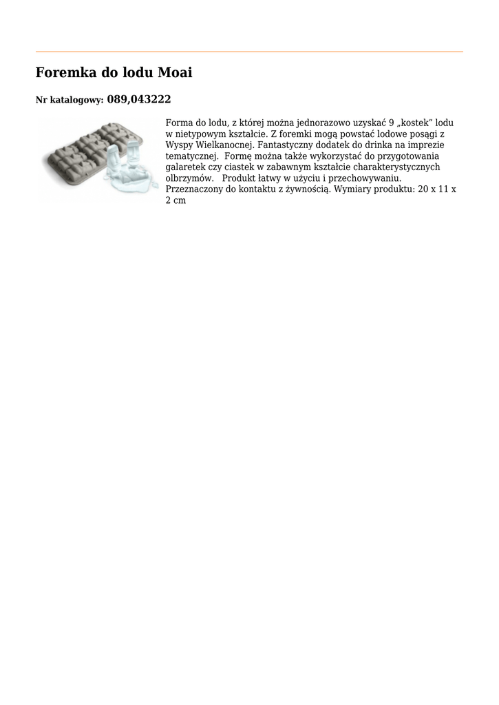 Foremka do lodu Moai Nr katalogowy: 089,043222 Forma do lodu, z której można jednorazowo uzyskać 9 „kostek” lodu w nietypowym kształcie. Z foremki mogą powstać lodowe posągi z Wyspy Wielkanocnej. Fantastyczny dodatek do drinka na imprezie tematycznej. Formę można także wykorzystać do przygotowania galaretek czy ciastek w zabawnym kształcie charakterystycznych olbrzymów. Produkt łatwy w użyciu i przechowywaniu. Przeznaczony do kontaktu z żywnością. Wymiary produktu: 20 x 11 x 2 cm