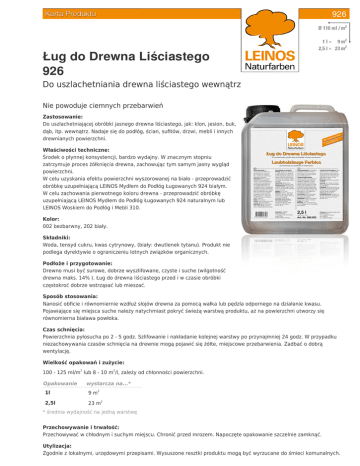 926 Ług do Drewna Liściastego 926 Do uszlachetniania drewna liściastego wewnątrz Nie powoduje ciemnych przebarwień Zastosowanie: Do uszlachetniającej obróbki jasnego drewna liściastego, jak: klon, jesion, buk, dąb, itp. wewnątrz. Nadaje się do podłóg, ścian, sufitów, drzwi, mebli i innych drewnianych powierzchni. Właściwości techniczne: Środek o płynnej konsystencji, bardzo wydajny. W znacznym stopniu zatrzymuje proces żółknięcia drewna, zachowując tym samym jasny wygląd powierzchni. W celu uzyskania efektu powierzchni wyszorowanej na biało - przeprowadzić obróbkę uzupełniającą LEINOS Mydłem do Podłóg Ługowanych 924 białym. W celu zachowania pierwotnego koloru drewna - przeprowadzić obróbkę uzupełniającą LEINOS Mydłem do Podłóg Ługowanych 924 naturalnym lub LEINOS Woskiem do Podłóg i Mebli 310. Kolor: 002 bezbarwny, 202 biały. Składniki: Woda, tensyd cukru, kwas cytrynowy, (biały: dwutlenek tytanu). Produkt nie podlega dyrektywie o ograniczeniu lotnych związków organicznych. Podłoże i przygotowanie: Drewno musi być surowe, dobrze wyszlifowane, czyste i suche (wilgotność drewna maks. 14% ). Ług do drewna liściastego przed i w czasie obróbki częstokroć dobrze wstrząsać lub mieszać. Sposó b stosowania: Nanosić obficie i równomiernie wzdłuż słojów drewna za pomocą wałka lub pędzla odpornego na działanie kwasu. Pojawiające się miejsca suche należy natychmiast pokryć świeżą warstwą produktu, aż na powierzchni utworzy się równomierna biaława powłoka. Czas schnięcia: Powierzchnia pyłosucha po 2 - 5 godz. Szlifowanie i nakładanie kolejnej warstwy po przynajmniej 24 godz. W przypadku niezachowywania czasów schnięcia na drewnie mogą pojawić się żółte, miejscowe przebarwienia. Zadbać o dobrą wentylację. Wielkość opakowań i zużycie: 100 - 125 ml/m2 lub 8 - 10 m2/l, zależy od chłonności powierzchni. Opakowanie wystarcza na...* 1l 9 m2 2,5l 23 m2 * średnia wydajność na jedną warstwę Przechowywanie i trwałość: Przechowywać w chłodnym i suchym miejscu. Chronić przed mrozem. Napoczęte opakowanie szczelnie zamknąć. Utylizacja: Zgodnie z lokalnymi, urzędowymi przepisami. Wysuszone resztki produktu mogą być wyrzucane do śmieci komunalnych. Europejski kod odpadu EWC: 07 06 01. Środki rozcieńczające i czyszczące: Natychmiast po zakończeniu pracy czyszczenie wodą. GISCODE: GE 10 Zwroty wskazujące rodzaj zagrożenia: Działa drażniąco na oczy. GHS07 Uwaga Zwroty wskazujące środki ostrożności: Stosować rękawice ochronne/odzież ochronną/ochronę oczu/ochronę twarzy. W PRZYPADKU KONTAKTU ZE SKÓRĄ: umyć dużą ilością wody. W przypadku wystąpienia podrażnienia skóry: Zasięgnąć porady/zgłosić się pod opiekę lekarza. Zanieczyszczoną odzież zdjąć i wyprać przed ponownym użyciem. W PRZYPADKU DOSTANIA SIĘ DO OCZU: Ostrożnie płukać wodą przez kilka minut. Wyjąć soczewki kontaktowe, jeżeli są i można je łatwo usunąć. Nadal płukać. W przypadku utrzymywania się działania drażniącego na oczy: Zasięgnąć porady/zgłosić się pod opiekę lekarza. Chronić przed dziećmi. Unikać uwolnienia do środowiska. Zawartość/pojemnik usuwać zgodnie z lokalnymi przepisami. Aby osiągnąć optymalne wyniki należy przestrzegać zaleceń Kart Produktów wszystkich stosowanych produktów. Informacje opierają się na aktualnym stanie naszej wiedzy i doświadczeń. Nie stanowią jednak zapewnienia o właściwościach produktu i nie mają skutku prawnego umowy. Wraz z ukazaniem się tej Karty Produktu wszystkie poprzednie informacje tracą swoją ważność. Stan: 08.03.2017 Dystrybutor: AMBIENTE • Tomasz Szczepański • ul. Reymonta 12 • 48-370 Paczków tel./faks: +48(0)77/43175 23 • [email protected] • www.LEINOS.pl Producent: LEINOS • Reincke Naturfarben GmbH • Rudolf-Diesel-Straße 4 • 21614 Buxtehude, Germany Tel. +49 (0) 41 61 - 99 45 40 • www.LEINOS.de • [email protected]