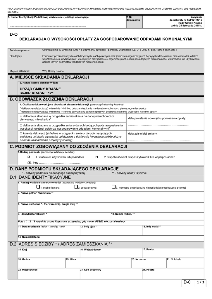 POLA JASNE WYPEŁNIA PODMIOT SKLADAJĄCY DEKLARACJĘ. WYPEŁNIAĆ NA MASZYNIE, KOMPUTEROWO LUB RĘCZNIE, DUŻYMI, DRUKOWANYMI LITERAMI, CZARNYM LUB NIEBIESKIM KOLOREM. 1. Numer Identyfikacji Podatkowej właściciela – jeżeli go obowiązuje 2. Nr dokumentu Załącznik do uchwały nr XVI/121/2015 Rady Gminy Krasne z dnia 25 listopada 2015 r. ………………………………………………………………………………………………………………… D-O DEKLARACJA O WYSOKOŚCI OPŁATY ZA GOSPODAROWANIE ODPADAMI KOMUNALNYMI Podstawa prawna: Ustawa z dnia 13 września 1996 r. o utrzymaniu czystości i porządku w gminach (Dz. U. z 2013 r., poz. 1399 z późn. zm.); Składający: Formularz przeznaczony dla osób fizycznych, osób prawnych oraz jednostek organizacyjnych będących właścicielami nieruchomości, a także współwłaścicieli, użytkowników wieczystych oraz jednostek organizacyjnych i osób posiadających nieruchomości w zarządzie lub użytkowaniu, a także innych podmiotów władających nieruchomością; Miejsce składania: Wójt Gminy Krasne A. MIEJSCE SKŁADANIA DEKLARACJI 3. Nazwa i adres siedziby Wójta: URZĄD GMINY KRASNE 36-007 KRASNE 121 B. OBOWIĄZEK ZŁOŻENIA DEKLARACJI 4. Okoliczności powodujące obowiązek złożenia deklaracji (zaznaczyć właściwy kwadrat): 1 2 deklarację należy złożyć w terminie 14 dni od dnia zamieszkania na danej nieruchomości pierwszego mieszkańca . deklarację należy złożyć w terminie 14 dni od daty zmiany danych będących podstawą ustalenia wysokości należnej opłaty. deklaracja składana w przypadku zamieszkania na danej nieruchomości 1 pierwszego mieszkańca data powstania obowiązku ponoszenia opłaty: deklaracja składana w przypadku zmiany danych będących podstawą ustalenia 2 wysokości należnej opłaty za gospodarowanie odpadami komunalnymi …………….………………………………………… korekta deklaracji (składana w przypadku zmiany danych niebędących podstawą ustalenia wysokości opłaty;wraz z deklaracją korygującą należy złożyć pisemne uzasadnienie przyczyny korekty) data zaistniałej zmiany: ………………………………………………………… C. PODMIOT ZOBOWIĄZANY DO ZŁOŻENIA DEKLARACJI 5.Rodzaj podmiotu (zaznaczyć właściwy kwadrat): 1. właściciel, użytkownik lub posiadacz 2. współwłaściciel, współużytkownik lub współposiadacz 3. inny …………………………………….. D. DANE PODMIOTU SKŁADAJĄCEGO DEKLARACJĘ * - dotyczy podmiotu niebędącego osobą fizyczną ** - dotyczy osoby fizycznej D.1. DANE IDENTYFIKACYJNE 6. Rodzaj właściciela nieruchomości (zaznaczyć właściwy kwadrat): 1. osoba fizyczna 2. osoba prawna 3. jednostka organizacyjna nieposiadająca osobowości prawnej 7. Nazwa pełna * / Nazwisko ** 8. Nazwa skrócona * / Pierwsze imię, drugie imię ** 9. Identyfikator REGON * 10. Numer PESEL ** Pola 11, 12, 13 wypełnia osoba fizyczna w przypadku, gdy numer PESEL nie został nadany. 11. Data urodzenia (dzień - miesiąc - rok) 12. Imię ojca ** 13. Imię matki ** 14. Numertelefonu D.2. ADRES SIEDZIBY * / ADRES ZAMIESZKANIA ** 15. Kraj 18. Gmina 22. Miejscowość 16. Województwo 19. Ulica 17. Powiat 20. Nr domu 23. Kod pocztowy 21. Nr lokalu 24. Poczta D-0 1/3 POLA JASNE WYPEŁNIA PODMIOT SKLADAJĄCY DEKLARACJĘ. WYPEŁNIAĆ NA MASZYNIE, KOMPUTEROWO LUB RĘCZNIE, DUŻYMI, DRUKOWANYMI LITERAMI, CZARNYM LUB NIEBIESKIM KOLOREM. E. DANE NIERUCHOMOŚCI, NA KTÓREJ POWSTAJĄ ODPADY KOMUNALNE E.1. POŁOŻENIE NIERUCHOMOŚCI 25. Położenie nieruchomości (adres) E.2. TYTUŁ PRAWNY (zaznaczyć właściwy kwadrat): 26. Rodzaj własności 1. własność 2. współwłasność 28. Rodzaj posiadania zależnego (np. najem, dzierżawa) 1. posiadanie 2. współposiadanie 27. Rodzaj użytkowania wieczystego 1. użytkowanie 2. współużytkowanie 29. Inny ………………………………………. E.3. IDENTYFIKATORY GEODEZYJNE DZIAŁEK, BUDYNKÓW, LOKALI (wykazuje się jeżeli zostały nadane) 30. Numer ewidencyjny działki 31. Numer budynku 32. Numer lokalu F. RODZAJ ODBIERANYCH ODPADÓW I OPŁATA ZA GOSPODAROWANIE ODPADAMI KOMUNALNYMI 33. Oświadczam, że na terenie nieruchomości wskazanej w części E niniejszej deklaracji zamieszkuje: ……………………… osób (podać liczbę) Odpady komunalne na terenie nieruchomości wskazanej w części E gromadzone są w sposób: (zaznaczyć właściwy kwadrat): selektywny nieselektywny Wysokość miesięcznej opłaty za gospodarowanie odpadami komunalnymi stanowi iloczyn liczby osób zamieszkujących nieruchomość, o której mowa w części E niniejszej deklaracji oraz stawki opłaty ustalonej Uchwałą Rady Gminy Krasne Miesięczna opłata za gospodarowanie odpadami komunalnymi wynosi: ……………………………….…… (liczba osób zamieszkujących) X ………….………… = ……………………..……………………………... zł (stawka opłaty w zł) (miesięczna opłata w zł) G. INFORMACJA O ZAŁĄCZNIKACH (do niniejszej deklaracji dołączono) 34. Liczba i nazwy załączników H. OŚWIADCZENIE I PODPIS WŁASCICIELA/ OSOBY REPREZENTUJĄCEJ WŁAŚCICIELA 35. Imię 36. Nazwisko 37. Data wypełnienia deklaracji (dzień - miesiąc - rok) 38. Podpis (pieczęć) właściciela lub osoby władającej nieruchomością/ osoby reprezentującej (należy dołączyć pełnomocnictwo lub inny dokument, z którego wynika uprawnienie do reprezentowania właściciela nieruchomości) D-0 2/3 POLA JASNE WYPEŁNIA PODMIOT SKLADAJĄCY DEKLARACJĘ. WYPEŁNIAĆ NA MASZYNIE, KOMPUTEROWO LUB RĘCZNIE, DUŻYMI, DRUKOWANYMI LITERAMI, CZARNYM LUB NIEBIESKIM KOLOREM. I. ADNOTACJE WÓJTA 39. Uwagi organu 40. Data (dzień - miesiąc - rok) 41. Podpis przyjmującego formularz Pouczenie 1. Niniejsza deklaracja stanowi podstawę do wystawienia tytułu wykonawczego, zgodnie z przepisami ustawy z dnia 17 czerwca 1966 r. o postępowaniu egzekucyjnym w administ