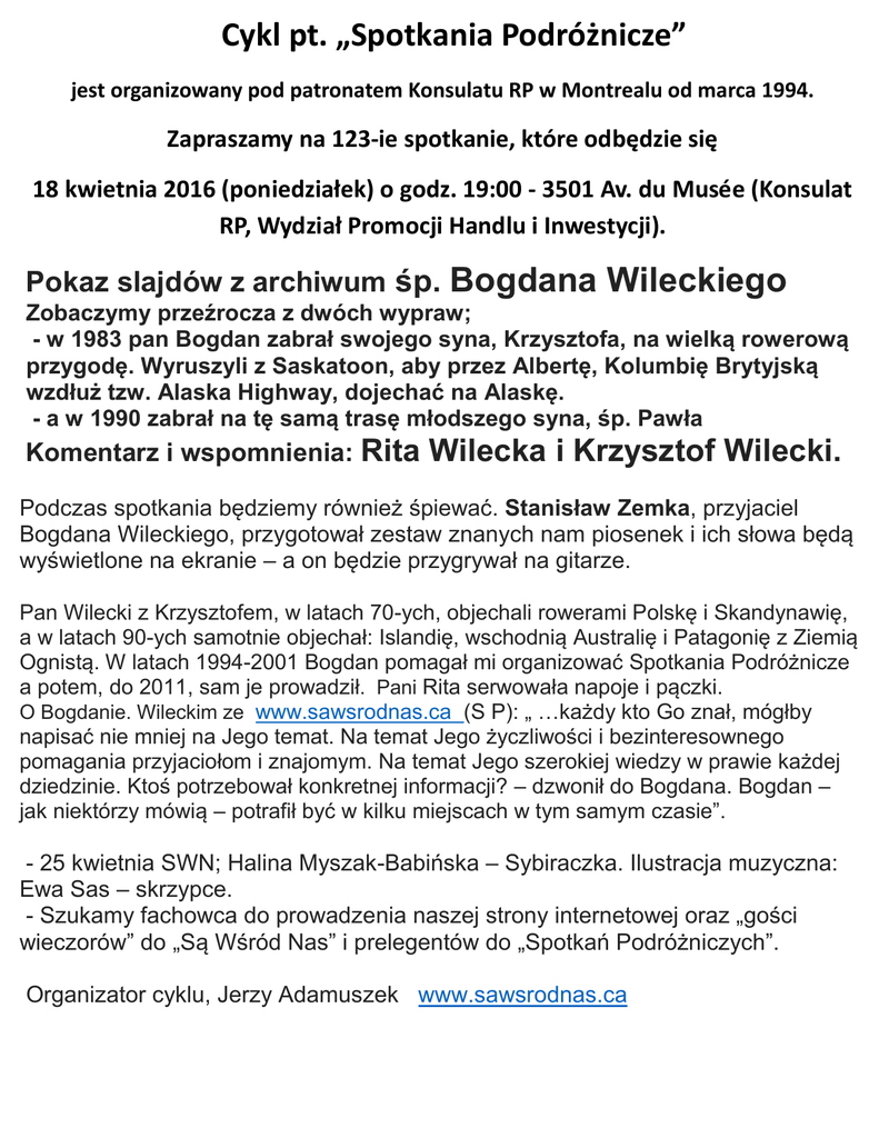 Cykl pt. „Spotkania Podróżnicze” jest organizowany pod patronatem Konsulatu RP w Montrealu od marca 1994. Zapraszamy na 123-ie spotkanie, które odbędzie się 18 kwietnia 2016 (poniedziałek) o godz. 19:00 - 3501 Av. du Musée (Konsulat RP, Wydział Promocji Handlu i Inwestycji). Pokaz slajdów z archiwum śp. Bogdana Wileckiego Zobaczymy przeźrocza z dwóch wypraw; - w 1983 pan Bogdan zabrał swojego syna, Krzysztofa, na wielką rowerową przygodę. Wyruszyli z Saskatoon, aby przez Albertę, Kolumbię Brytyjską wzdłuż tzw. Alaska Highway, dojechać na Alaskę. - a w 1990 zabrał na tę samą trasę młodszego syna, śp. Pawła Komentarz i wspomnienia: Rita Wilecka i Krzysztof Wilecki. Podczas spotkania będziemy również śpiewać. Stanisław Zemka, przyjaciel Bogdana Wileckiego, przygotował zestaw znanych nam piosenek i ich słowa będą wyświetlone na ekranie – a on będzie przygrywał na gitarze. Pan Wilecki z Krzysztofem, w latach 70-ych, objechali rowerami Polskę i Skandynawię, a w latach 90-ych samotnie objechał: Islandię, wschodnią Australię i Patagonię z Ziemią Ognistą. W latach 1994-2001 Bogdan pomagał mi organizować Spotkania Podróżnicze a potem, do 2011, sam je prowadził. Pani Rita serwowała napoje i pączki. O Bogdanie. Wileckim ze www.sawsrodnas.ca (S P): „ …każdy kto Go znał, mógłby napisać nie mniej na Jego temat. Na temat Jego życzliwości i bezinteresownego pomagania przyjaciołom i znajomym. Na temat Jego szerokiej wiedzy w prawie każdej dziedzinie. Ktoś potrzebował konkretnej informacji? – dzwonił do Bogdana. Bogdan – jak niektórzy mówią – potrafił być w kilku miejscach w tym samym czasie”. - 25 kwietnia SWN; Halina Myszak-Babińska – Sybiraczka. Ilustracja muzyczna: Ewa Sas – skrzypce. - Szukamy fachowca do prowadzenia naszej strony internetowej oraz „gości wieczorów” do „Są Wśród Nas” i prelegentów do „Spotkań Podróżniczych”. Organizator cyklu, Jerzy Adamuszek www.sawsrodnas.ca