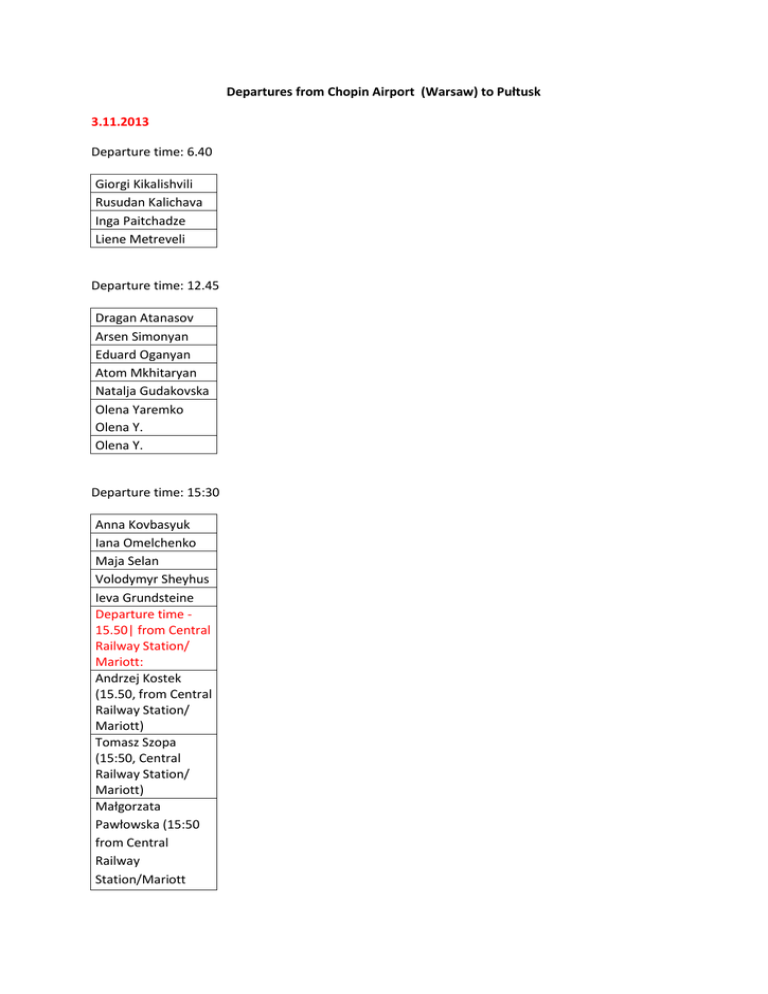Departures from Chopin Airport (Warsaw) to Pułtusk 3.11.2013 Departure time: 6.40 Giorgi Kikalishvili Rusudan Kalichava Inga Paitchadze Liene Metreveli Departure time: 12.45 Dragan Atanasov Arsen Simonyan Eduard Oganyan Atom Mkhitaryan Natalja Gudakovska Olena Yaremko Olena Y. Olena Y. Departure time: 15:30 Anna Kovbasyuk Iana Omelchenko Maja Selan Volodymyr Sheyhus Ieva Grundsteine Departure time 15.50| from Central Railway Station/ Mariott: Andrzej Kostek (15.50, from Central Railway Station/ Mariott) Tomasz Szopa (15:50, Central Railway Station/ Mariott) Małgorzata Pawłowska (15:50 from Central Railway Station/Mariott parking) Anna Dymitra Slawczewa (15:50 from Central Railway Station/Mariott parking) Departure time: 22:30 (from Fryderyk Chopin Airport) Fouad Achiba Laszlo Milutinovits Andrey Sergeev Alenka Oblak Marta Kurek From Central Railway Station/ Mariott : 23:10 Alexey Gorin 4.11.2013 From Central Railway station, departure time 13:45 Olga Belskaya From Fryderyk Chopin Airport Departure time: 14:15 Mehmet Cakir Departure time: 21:30 Eric Langbraten Max Pijevskii Per Erling TILSET LARSEN Thorunn HAGBERG Gabriella Jurisic OTTESEN 5.11.2013 Departure time: 6.40 Aleks Metreveli Departure time: 12.00 Laimonas Ragauskas Jochen Butt-Posnik Hamid Gasimov Elvin Aslanov Nelly Minasyan Artur Ghazaryan Natalia Chardymova Areg Tadevosyan Irina Nikulina David Hayrapetyan Departure time: 15:30 Volodymyr Sheygus Giorgi Bukia Gocha Kakulia Pavle Tvaliasvili Alexander Bukia Israel Peralta Anahit Minassian Oksana Bondar Iryna Bodnar Oksana Yuryk Andrij Donets Volha Paddubnaya Nataliya Pavlyuk Yaroslaw Oleinik Marisha Korzh Natalia Roelofs Guido Kaesbach Ana Yeghoyan Departure time: 20:30 Ekaterina Sherer Alina Schneider Seymur Valiyev From Warsaw West Station: Departure time: 20:40 Elena Finagina (from Warsaw West Station) Olena Shynarovska (from Warsaw West Station) Jana Štrichelová (from Warsaw West Station) 7.11.2013 Departure time: 10.00 Natalia Nikitina Departure time: 23.00 Ruzanna Ivanian