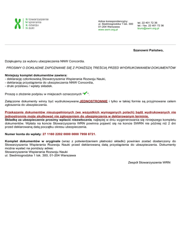 Adres korespondencyjny: ul. Siedmiogrodzka 1 lok. 300 01-204 Warszawa www.swrn.org.pl tel. 22 401 72 36 tel. / fax. 22 401 72 36 [email protected] Szanowni Państwo, Dziękujemy za wyboru ubezpieczenia NNW Concordia. PROSIMY O DOKŁADNE ZAPOZNANIE SIĘ Z PONIŻSZĄ TREŚCIĄ PRZED WYDRUKOWANIEM DOKUMENTÓW Niniejszy komplet dokumentów zawiera: - deklarację członkowską Stowarzyszenia Wspierania Rozwoju Nauki, - deklarację przystąpienia do ubezpieczenia NNW Concordia, - druki przelewu / wpłaty składek. Proszę o złożenie podpisu w miejscach oznaczonych " ". Załączone dokumenty winny być wydrukowywane JEDNOSTRONNIE i tylko w takiej formie są przyjmowane celem zgłoszenia do ubezpieczenia. Przekazanie dokumentów nieuzupełnionych (we wszystkich wymaganych polach) bądź wydrukowanych nie jednostronnie może skutkować nie zgłoszeniem do ubezpieczenia w deklarowanym terminie. Składkę za ubezpieczenie prosimy wpłacić niezwłocznie, najlepiej w dniu wygenerowania się niniejszego kompletu dokumentów. Wpłata na koncie Stowarzyszenia WRN powinna pojawić się na koncie SWRN nie później niż 2 dni przed deklarowaną datą początku okresu ubezpieczenia. Numer konta do wpłaty: 27 1160 2202 0000 0000 7958 8721. Komplet dokumentów w oryginale (wraz z potwierdzeniem płatności składki) powinien zostać dostarczony do Stowarzyszenia Wspierania Rozwoju Nauki przed deklarowaną datą przystąpienia do ubezpieczenia. Dokumenty można wysłać na poniższy adres: Stowarzyszenie Wspierania Rozwoju Nauki ul. Siedmiogrodzka 1 lok. 300, 01-204 Warszawa Zespół Stowarzyszenia WRN Deklaracja zgody na przystąpienie do umowy grupowego ubezpieczenia następstw nieszczęśliwych wypadków (NNW) CONCORDIA Nazwa Ubezpieczającego STOWARZYSZENIE WSPIERANIA ROZWOJU NAUKI, ul. Giełdowa 4A lok. 82, 01-211 Warszawa Dane Ubezpieczonego Nazwisko i imię PESEL Adres korespondencyjny: Ulica i nr domu / nr mieszkania kod pocztowy / Miejscowość Telefon Wykonywany zawód Osoba Uposażona Imię i Nazwisko Data urodzenia Adres zamieszkania Zakres ubezpieczenia zgodny z OWU stosowane do umów ubezpieczenia grupowego i indywidualnego następstw nieszczęśliwych wypadków zatwierdzone uchwałą Zarządu Concordia Polska Towarzystwo Ubezpieczeń Wzajemnych z dnia 24 luty 2016 r. Śmierć Ubezpieczonego w następstwie nieszczęśliwego wypadku % świadczenia Zakres terytorialny Wysokość Klauzula nr. / wiek skumulowanych ochorny świadczenia w PLN 150.000 zł Świat 1. jeżeli śmierć nastąpiła w następstwie postrzelenia w trakcie strzelaniny pomiędzy napastnikami i policją, 2. jeżeli śmierć nastąpiła w następstwie pogryzienia przez psa 3. jeżeli śmierć w następstwie tego samego nieszczęśliwego wypadku poniosło oboje rodziców (prawnych opiekunów), których wszystkie dzieci są od nich finansowo zależne i są poniżej 18 roku życia Śmierć Ubezpieczonego w następstwie nieszczęśliwego wypadku w ruchu komunikacyjnym w przypadku śmierci w trakcie jazdy komunikacją publiczną w przypadku zapinania pasów w samochodzie z poduszkami powietrznymi kl. nr. 1 Polska wiek-bez ograniczeń 400.000 zł Świat kl. nr. 2 Polska wiek-bez ograniczeń 80.000 zł Świat kl. nr. 12 wiek-bez ograniczeń Świat w przypadku uciążliwości leczenia (pobyt w szpitalu, nie stwierdzono uszczerbku) Trwała i całkowita niezdolność Ubezpieczonego do pracy w następstwie nieszczęśliwego wypadku Pobyt Ubezpieczonego w szpitalu w następstwie nieszczęśliwego wypadku (w. standardowy): - pobyt w szpitalu 1% SU (dieta dzienna) - 70 zł / dzień, - pobyt na OIOM 100% diety dziennej - 70 zł / dzień 800 zł 60.000 zł w przypadku niezdolności do samodzielnej egzystencji Trwały uszczerbek na zdrowiu Ubezpieczonego w następstwie zawału serca lub udaru mózgu (1% SU za 1% uszczerbku) (max SU za 100% uszczerbku) 525.000 zł 437.500 zł Trwały uszczerbek na zdrowiu Ubezpieczonego w następstwie nieszczęśliwego wypadku (1% SU za 1% uszczerbku) w przypadku uciążliwości leczenia (pobyt w szpitalu, nie stwierdzono uszczerbku) 180.000 zł Świat Polska i kraje UE Czasowa niezdolność Ubezpieczonego do pracy w następstwie nieszczęśliwego wypadku Świat Operacje chirurgiczne Ubezpieczonego w następstwie nieszczęśliwego wypadku (100%, 45% lub 15% w zależności od stopnia trudności) Świat Koszty leczenia Ubezpieczonego i pakiet świadczeń pielęgnacyjnych w wyniku NW Polska Pomoc medyczna w nagłych przypadkach (wariant standardowy) Polska kl. nr. 15 wiek-do 65 r.ż kl. nr 16 wiek-do 67 r.ż kl. nr. 19 wiek-do 65 r.ż kl. nr. 27 wiek-do 67 r. ż 80.000 zł 800 zł 150.000 zł 7.000 zł 5.000 zł kl. nr. 32 3.000 zł wiek-do 65 r.ż kl. nr. 45 wiek-bez ograniczeń kl. nr. 40 wiek-do 71 r.ż 20.000 zł zgodnie z OWU 72 zł Składka miesięczna (w tym składka członkowska do SWRN - 10 zł) Oświadczenia Oświadczam, że przed wyrażeniem zgody na przystąpienie do ubezpieczenia zostały mi dostarczone przez Stowarzyszenie WRN właściwe warunki ubezpieczenia na trwałym nośniku, za jaki uważa się plik pdf, płytę CD lub format drukowany. ___________________ data ___________________________ własnoręczny czytelny podpis 1. Oświadczam, iż zapoznałem/am się z treścią OWU stosowanych do umów ubezpieczenia grupowego i indywidualnego następstw nieszczęśliwych wypadków zatwierdzone uchwałą Zarządu Concordia Polska Towarzystwo Ubezpieczeń Wzajemnych z dnia 24 luty 2016 r. 2. Oświadczam, że nie uprawiam dyscyplin sportowych polegających na uczestniczeniu w treningach, zawodach, wyścigach, występach, imprezach sportowych, obozach kondycyjnych i szkoleniowych a także nie jestem członkiem żadnego klubu, związku, ani żadnej organizacji sportowej oraz nie uprawiam sportu zawodowo. 3. Oświadczam, że jestem zainteresowany/a przystąpieniem od dnia ......../dzień.........../miesiac............../rok do ubezpieczenia NNW proponowanego przez CONCORDIA Polska. Niniejszym zobowiązuję s