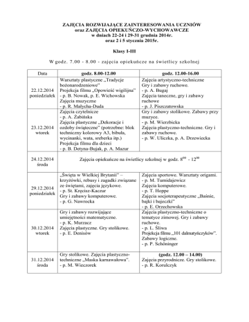ZAJĘCIA ROZWIJAJĄCE ZAINTERESOWANIA UCZNIÓW oraz ZAJĘCIA OPIEKUŃCZO-WYCHOWAWCZE w dniach 22-24 i 29-31 grudnia 2014r. oraz 2 i 5 stycznia 2015r. Klasy I-III W godz. 7.00 - 8.00 - zajęcia opiekuńcze na świetlicy szkolnej Data godz. 8.00-12.00 Warsztaty plastyczne „Tradycje bożonarodzeniowe” 22.12.2014 Projekcja filmu „Opowieść wigilijna” poniedziałek - p. B. Nowak, p. E. Wichowska Zajęcia muzyczne - p. R. Małycha-Duda Zajęcia czytelnicze - p. A. Żabińska Zajęcia plastyczne „Dekoracje i 23.12.2014 ozdoby świąteczne” (potrzebne: blok wtorek techniczny kolorowy A3, bibuła, wycinanki, wata, sreberka itp.) Projekcja filmu dla dzieci - p. B. Detyna-Bujak, p. A. Mazur 24.12.2014 środa godz. 12.00-16.00 Zajęcia artystyczno-techniczne Gry i zabawy ruchowe. - p. A. Bugaj Zajęcia taneczne, gry i zabawy ruchowe - p. J. Piszczatowska Gry i zabawy stolikowe. Zabawy przy muzyce. - p. M. Wierzbicka Zajęcia plastyczno-techniczne. Gry i zabawy ruchowe. - p. W. Uliczka, p. A. Drzewiecka Zajęcia opiekuńcze na świetlicy szkolnej w godz. 800 - 1200 „Święta w Wielkiej Brytanii” – krzyżówki, rebusy i zagadki związane ze świętami, zajęcia językowe. 29.12.2014 - p. St. Kręcisz-Kaczur poniedziałek Gry i zabawy komputerowe. - p. G. Nawrocka 30.12.2014 wtorek Gry i zabawy rozwijające umiejętności matematyczne. - p. K. Murzacz Zajęcia plastyczne. Gry stolikowe. - p. E. Denisów 31.12.2014 środa Gry stolikowe. Zajęcia plastycznotechniczne „Maska karnawałowa”. - p. M. Wieczorek Zajęcia sportowe. Warsztaty origami. - p. M. Tumidajewicz Zajęcia komputerowe. - p. T. Hoppe Zajęcia socjoterapeutyczne „Baśnie, bajki i bajeczki” - p. E. Orzechowska Zajęcia plastyczno-techniczne o tematyce zimowej. Gry i zabawy ruchowe. - p. L. Śliwa Projekcja filmu „101 dalmatyńczyków”. Zabawy logiczne. - p. P. Schőninger (godz. 12.00 – 14.00) Zajęcia przyrodnicze. Gry stolikowe. - p. R. Korulczyk 2 Klasy IV-VI Data 8.00 - 12.00 „Opowieści z Narnii” – projekcja filmu, gry i zabawy tematycznie związane z filmem - p. D. Gwóźdź Film historyczny „Życie jest piękne”, rozwiązywanie testów o tematyce 22.12.2014 historycznej - p. K. Kmak-Mocha poniedziałek Zajęcia plastyczne. Ozdoby i stroiki świąteczne (materiały własne) - p. N. Szwan-Zarzycka Zajęcia sportowe (potrzebny strój sportowy) - p. M. Mazur „Wielcy kompozytorzy” prezentacja multimedialna. Zajęcia muzyczne. - p. A. Golczak 23.12.2014 Zajęcia przyrodnicze „Zima w przyrodzie”- p. M. Ludwiczuk wtorek Zajęcia językowe „Językowe rozmaitości”- p. A. Gratzke Zajęcia sportowe (potrzebny strój sportowy) - p. A. Chmielewski 24.12.2014 środa Zajęcia opiekuńcze na świetlicy szkolnej w godz. 800 - 1200 Zajęcia językowe. Interaktywne gry i zabawy językowe - p. T. Woźniak 29.12.2014 Wyrównywanie szans edukacyjnych. Zajęcia matematyczne – rachunek poniedziałek pisemny - p. A. Kaczmarczyk Zajęcia językowe „Obyczaje i zwyczaje świąteczne w krajach 30.12.2014 anglojęzycznych” - p. A. Karska-Glica wtorek Zajęcia historyczne „Zaginione cywilizacje”- p. E. Bober Gry Scrable, Literaki - p. A. Perkowska 31.12.2014 Uczta kinomana „Księga dżungli”. Gry stolikowe. środa - p. B. Szczudłowska 2 i 5.01.2015 piątek poniedziałek godz. 7.00 - 16.30 zajęcia opiekuńczo-wychowawcze - świetlica szkolna