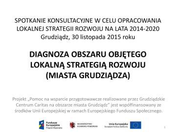 SPOTKANIE KONSULTACYJNE W CELU OPRACOWANIA LOKALNEJ STRATEGII ROZWOJU NA LATA 2014-2020 Grudziądz, 30 listopada 2015 roku DIAGNOZA OBSZARU OBJĘTEGO LOKALNĄ STRATEGIĄ ROZWOJU (MIASTA GRUDZIĄDZA) Projekt „Pomoc na wsparcie przygotowawcze realizowane przez Grudziądzkie Centrum Caritas na obszarze miasta Grudziądz” jest współfinansowany ze środków Unii Europejskiej w ramach Europejskiego Funduszu Społecznego. 1 RLKS Rozwój lokalny kierowany przez społeczność to nowy instrument terytorialny, wprowadzony przez Komisję Europejską do realizacji w perspektywie finansowej na lata 2014-2020, bazujący na podstawowych założeniach: • społeczność lokalna przygotowuje Lokalną Strategię Rozwoju, w której określa m.in. cele oraz zasady działania, w tym kryteria wyboru projektów służących osiągnięciu tych celów, • LSR realizowana jest przez Lokalną Grupę Działania (LGD) - partnerstwo złożone z przedstawicieli trzech sektorów. 2 Lokalna Grupa Działania (LGD) Sektor publiczny (4 podmioty) Mieszkańcy (36 osób) Sektor społeczny (16 podmiotów) i gospodarczy (16 podmiotów) 3 Misja LGD Misją Stowarzyszenia Lokalna Grupa Działania „Grudziądzki Spichlerz” jest wpływanie na rozwój społeczno – gospodarczy Grudziądza, ze szczególnym uwzględnieniem potrzeb osób i rodzin zagrożonych wykluczeniem społecznym 4 Cel LGD Celem Stowarzyszenia Lokalna Grupa Działania „Grudziądzki Spichlerz” jest pozyskiwanie i rozdział środków finansowych i materialnych z przeznaczeniem na rozwój społeczno gospodarczy Grudziądza, ze szczególnym uwzględnieniem potrzeb osób i rodzin zagrożonych ubóstwem lub wykluczeniem społecznym. 5 Władze LGD „Grudziądzki Spichlerz” Zarząd: • • • • • Ks. Marek Borzyszkowski – Prezes Zarządu, Sebastian Soberski – Wiceprezes Zarządu, Anna Drozdowska – Sekretarz, Krystyna Nowak – Skarbnik, Marek Sikora – Członek Zarządu. 6 Władze LGD „Grudziądzki Spichlerz” • • • • • • • • • Rada: Jacek Wrzos – Przewodniczący Rady, Marek Lewiński – Wiceprzewodniczący Rady, Sekretarz – Hanna Szymańska, Piotr Figurski, Aleksandra Nowak, Wioletta Pacuszka, Rafał Parol, Artur Prosotowicz, Adam Sieczkowski. 7 Biuro LGD „Grudziądzki Spichlerz” czynne: poniedziałek, środa – godz. 14.00 – 18.00; piątek – godz. 09.00 – 13.00 Adres: Al. 23 Stycznia 18, Telefon: 605 173 605, adres e-mail: [email protected] www.lgd.grudziadz.pl 8 SPOTKANIE KONSULTACYJNE W CELU OPRACOWANIA LOKALNEJ STRATEGII ROZWOJU NA LATA 2014-2020 Grudziądz, 30 listopada 2015 roku DZIĘKUJĘ ZA UWAGĘ! Projekt „Pomoc na wsparcie przygotowawcze realizowane przez Grudziądzkie Centrum Caritas na obszarze miasta Grudziądz” jest współfinansowany ze środków Unii Europejskiej w ramach Europejskiego Funduszu Społecznego. 9