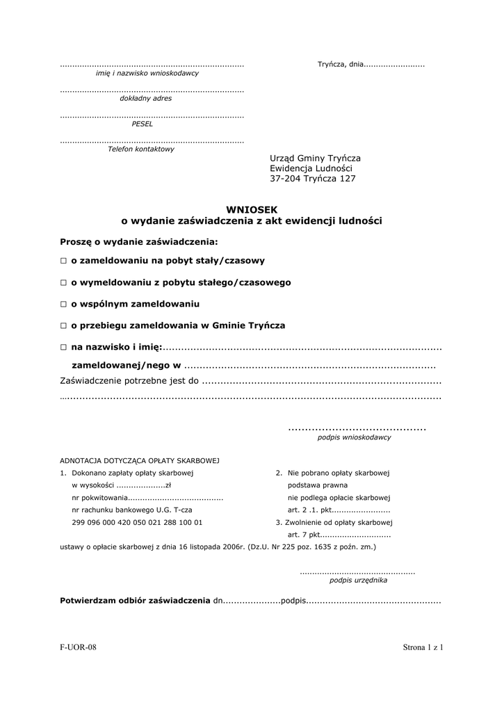 ........................................................................... imię i nazwisko wnioskodawcy Tryńcza, dnia......................... ........................................................................... dokładny adres ........................................................................... PESEL ........................................................................... Telefon kontaktowy Urząd Gminy Tryńcza Ewidencja Ludności 37-204 Tryńcza 127 WNIOSEK o wydanie zaświadczenia z akt ewidencji ludności Proszę o wydanie zaświadczenia: □ o zameldowaniu na pobyt stały/czasowy □ o wymeldowaniu z pobytu stałego/czasowego □ o wspólnym zameldowaniu □ o przebiegu zameldowania w Gminie Tryńcza □ na nazwisko i imię:........................................................................................... zameldowanej/nego w .................................................................................. Zaświadczenie potrzebne jest do .............................................................................. ….......................................................................................................................... ......................................... podpis wnioskodawcy ADNOTACJA DOTYCZĄCA OPŁATY SKARBOWEJ 1. Dokonano zapłaty opłaty skarbowej 2. Nie pobrano opłaty skarbowej w wysokości ....................zł podstawa prawna nr pokwitowania....................................... nie podlega opłacie skarbowej nr rachunku bankowego U.G. T-cza art. 2 .1. pkt........................ 299 096 000 420 050 021 288 100 01 3. Zwolnienie od opłaty skarbowej art. 7 pkt............................. ustawy o opłacie skarbowej z dnia 16 listopada 2006r. (Dz.U. Nr 225 poz. 1635 z poźn. zm.) ............................................... podpis urzędnika Potwierdzam odbiór zaświadczenia dn.....................podpis................................................. F-UOR-08 Strona 1 z 1