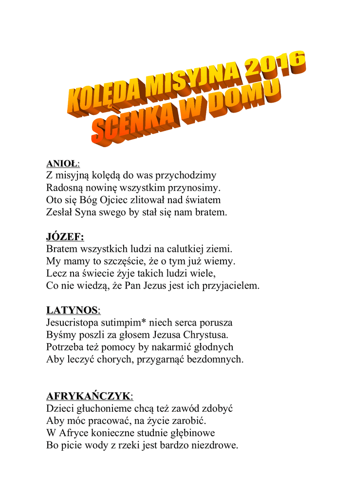 ANIOŁ: Z misyjną kolędą do was przychodzimy Radosną nowinę wszystkim przynosimy. Oto się Bóg Ojciec zlitował nad światem Zesłał Syna swego by stał się nam bratem. JÓZEF: Bratem wszystkich ludzi na calutkiej ziemi. My mamy to szczęście, że o tym już wiemy. Lecz na świecie żyje takich ludzi wiele, Co nie wiedzą, że Pan Jezus jest ich przyjacielem. LATYNOS: Jesucristopa sutimpim* niech serca porusza Byśmy poszli za głosem Jezusa Chrystusa. Potrzeba też pomocy by nakarmić głodnych Aby leczyć chorych, przygarnąć bezdomnych. AFRYKAŃCZYK: Dzieci głuchonieme chcą też zawód zdobyć Aby móc pracować, na życie zarobić. W Afryce konieczne studnie głębinowe Bo picie wody z rzeki jest bardzo niezdrowe. MARYJA: Wszystkie ważne sprawy w moje ręce złóżcie I na łaski mego Syna serca swe otwórzcie. Wspomagajcie się jak bracia i w każdej potrzebie Módlcie się do Boga Ojca, który mieszka w niebie. WSZYSCY: Za przyjęcie i ofiarę pięknie dziękujemy! By wam Jezus błogosławił modlić się będziemy. Tą pamiątką małą od nas dziś przypominamy, Że każdy ochrzczony także jest posłany. *„W imię Chrystusa” w języku Keczua (Perú) Uwaga! Poprawne wypowiadanie hasła Jesucristopa sutimpim jest następujące: Chezukristopa (accent na literę o) sutimpim(accent na pierwsze im)
