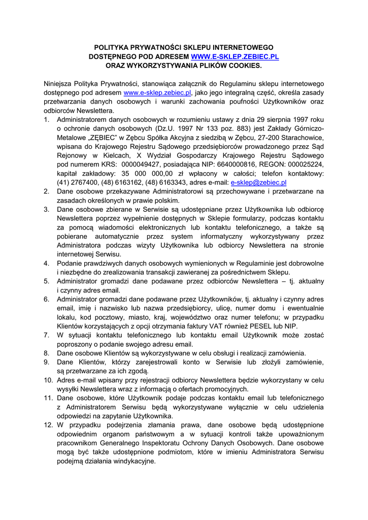 POLITYKA PRYWATNOŚCI SKLEPU INTERNETOWEGO DOSTĘPNEGO POD ADRESEM WWW.E-SKLEP.ZEBIEC.PL ORAZ WYKORZYSTYWANIA PLIKÓW COOKIES. Niniejsza Polityka Prywatności, stanowiąca załącznik do Regulaminu sklepu internetowego dostępnego pod adresem www.e-sklep.zebiec.pl, jako jego integralną część, określa zasady przetwarzania danych osobowych i warunki zachowania poufności Użytkowników oraz odbiorców Newslettera. 1. Administratorem danych osobowych w rozumieniu ustawy z dnia 29 sierpnia 1997 roku o ochronie danych osobowych (Dz.U. 1997 Nr 133 poz. 883) jest Zakłady GórniczoMetalowe „ZĘBIEC” w Zębcu Spółka Akcyjna z siedzibą w Zębcu, 27-200 Starachowice, wpisana do Krajowego Rejestru Sądowego przedsiębiorców prowadzonego przez Sąd Rejonowy w Kielcach, X Wydział Gospodarczy Krajowego Rejestru Sądowego pod numerem KRS: 0000049427, posiadająca NIP: 6640000816, REGON: 000025224, kapitał zakładowy: 35 000 000,00 zł wpłacony w całości; telefon kontaktowy: (41) 2767400, (48) 6163162, (48) 6163343, adres e-mail: [email protected] 2. Dane osobowe przekazywane Administratorowi są przechowywane i przetwarzane na zasadach określonych w prawie polskim. 3. Dane osobowe zbierane w Serwisie są udostępniane przez Użytkownika lub odbiorcę Newslettera poprzez wypełnienie dostępnych w Sklepie formularzy, podczas kontaktu za pomocą wiadomości elektronicznych lub kontaktu telefonicznego, a także są pobierane automatycznie przez system informatyczny wykorzystywany przez Administratora podczas wizyty Użytkownika lub odbiorcy Newslettera na stronie internetowej Serwisu. 4. Podanie prawdziwych danych osobowych wymienionych w Regulaminie jest dobrowolne i niezbędne do zrealizowania transakcji zawieranej za pośrednictwem Sklepu. 5. Administrator gromadzi dane podawane przez odbiorców Newslettera – tj. aktualny i czynny adres email. 6. Administrator gromadzi dane podawane przez Użytkowników, tj. aktualny i czynny adres email, imię i nazwisko lub nazwa przedsiębiorcy, ulicę, numer domu i ewentualnie lokalu, kod pocztowy, miasto, kraj, województwo oraz numer telefonu; w przypadku Klientów korzystających z opcji otrzymania faktury VAT również PESEL lub NIP. 7. W sytuacji kontaktu telefonicznego lub kontaktu email Użytkownik może zostać poproszony o podanie swojego adresu email. 8. Dane osobowe Klientów są wykorzystywane w celu obsługi i realizacji zamówienia. 9. Dane Klientów, którzy zarejestrowali konto w Serwisie lub złożyli zamówienie, są przetwarzane za ich zgodą. 10. Adres e-mail wpisany przy rejestracji odbiorcy Newslettera będzie wykorzystany w celu wysyłki Newslettera wraz z informacją o ofertach promocyjnych. 11. Dane osobowe, które Użytkownik podaje podczas kontaktu email lub telefonicznego z Administratorem Serwisu będą wykorzystywane wyłącznie w celu udzielenia odpowiedzi na zapytanie Użytkownika. 12. W przypadku podejrzenia złamania prawa, dane osobowe będą udostępnione odpowiednim organom państwowym a w sytuacji kontroli także upoważnionym pracownikom Generalnego Inspektoratu Ochrony Danych Osobowych. Dane osobowe mogą być także udostępnione podmiotom, które w imieniu Administratora Serwisu podejmą działania windykacyjne. 13. Administrator Serwisu pod żadnym pozorem nie odsprzedaje i nie udostępnia danych osobowych podmiotom trzecim poza sytuacjami opisanymi powyżej. 14. Administrator Serwisu będzie się kontaktował z Użytkownikami przede wszystkim za pośrednictwem poczty elektronicznej lub ewentualnie telefonicznie lub listownie w sprawach związanych z realizacją zamówień zawieranych za pośrednictwem Serwisu. 15. Każdy Użytkownik ma prawo zmienić lub zaktualizować swoje dane osobowe, samodzielnie dokonując zmiany w profilu Użytkownika dostępnym online po zalogowaniu do konta w Serwisie lub przesyłając dyspozycję do Administratora Sklepu e-mailem na adres: [email protected]. 16. Administrator stosuje najnowsze technologie i specjalne procedury ochrony danych osobowych. Dane osobowe są przechowywane w bazie danych, w której zastosowano środki techniczne i organizacyjne zapewniające ochronę przetwarzanych danych zgodne z wymaganiami określonymi przez powszechnie obowiązujące przepisy prawa dotyczące ochrony danych osobowych, w tym rozporządzenie Ministra Spraw Wewnętrznych i Administracji z dnia 29 kwietnia 2004 r. w sprawie dokumentacji przetwarzania danych osobowych oraz warunków technicznych i organizacyjnych, jakim powinny odpowiadać urządzenia i systemy informatyczne służące do przetwarzania danych osobowych (Dz. U. Nr 100, poz. 1024). Administrator Serwisu zarejestrował zidentyfikowany zbiór danych osobowych w rejestrze Głównego Inspektora Ochrony Danych Osobowych. 17. Do danych osobowych przetwarzanych w systemie Administratora systemu mają dostęp wyłącznie osoby posiadające pisemne upoważnienie do przetwarzania danych osobowych w systemie Administratora. 18. Niniejszy dokument nie może stanowić podstawy do jakichkolwiek roszczeń wobec Administratora Serwisu, o ile roszczenia te nie będą wynikały z obowiązujących na terenie Rzeczypospolitej Polskiej przepisów prawa. 19. W Serwisie znajdują się odnośniki i przekierowania do innych stron www, Administrator Serwisu nie ponosi odpowiedzialności za zasady zachowania prywatności, które obowiązują na tych stronach. 20. Podmiotem zbierającym dane jest Administrator Serwisu. 21. Podczas wizyty w Serwisie system Administratora automatycznie pobiera tzw. pliki cookies, tj.: publiczny adres IP komputera, z którego nadeszło zapytanie nazwę stacji klienta, nazwa Użytkownika podawana w procesie autoryzacji, czas nadejścia zapytania, pierwszy wiersz żądania http, kod odpowiedzi http, liczbę wysłanych przez serwer bajtów, adres URL strony poprzednio odwiedzanej przez Użytkownika - w przypadku gdy przejście do strony Serwisu nastąpiło przez link, informacje o przeglądarce Użytkownika, informacj