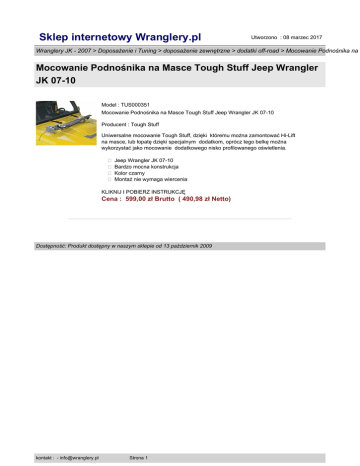 Sklep internetowy Wranglery.pl Utworzono : 08 marzec 2017 Wranglery JK - 2007 > Doposażenie i Tuning > doposażenie zewnętrzne > dodatki off-road > Mocowanie Podnośnika na Mocowanie Podnośnika na Masce Tough Stuff Jeep Wrangler JK 07-10 Model : TUS000351 Mocowanie Podnośnika na Masce Tough Stuff Jeep Wrangler JK 07-10 Producent : Tough Stuff Uniwersalne mocowanie Tough Stuff, dzięki któremu można zamontować Hi-Lift na masce, lub łopatę dzięki specjalnym dodatkom, oprócz tego belkę można wykorzystać jako mocowanie dodatkowego nisko profilowanego oświetlenia. � Jeep Wrangler JK 07-10 � Bardzo mocna konstrukcja � Kolor czarny � Montaż nie wymaga wiercenia KLIKNIJ I POBIERZ INSTRUKCJĘ Cena : 599,00 zł Brutto ( 490,98 zł Netto) Dostępność: Produkt dostępny w naszym sklepie od 13 październik 2009 kontakt : - [email protected] Strona 1