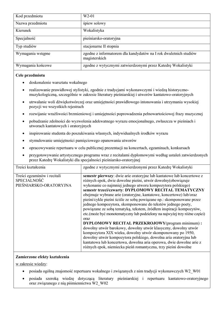 Kod przedmiotu W2-01 Nazwa przedmiotu śpiew solowy Kierunek Wokalistyka Specjalność pieśniarsko-oratoryjna Typ studiów stacjonarne II stopnia Wymagania wstępne zgodne z informatorem dla kandydatów na I rok dwuletnich studiów magisterskich Wymagania końcowe zgodne z wytycznymi zatwierdzonymi przez Katedrę Wokalistyki Cele przedmiotu doskonalenie warsztatu wokalnego realizowanie prawidłowej stylistyki, zgodnie z tradycjami wykonawczymi i wiedzą historycznomuzykologiczną, szczególnie w zakresie literatury pieśniarskiej i utworów kantatowo-oratoryjnych utrwalanie woli dźwiękotwórczej oraz umiejętności prawidłowego intonowania i utrzymania wysokiej pozycji we wszystkich rejestrach rozwijanie wrażliwości brzmieniowej i umiejętności poprowadzenia pełnowartościowej frazy muzycznej pobudzanie zdolności do wyzwolenia adekwatnego wyrazu emocjonalnego, zwłaszcza w pieśniach i utworach kantatowych i oratoryjnych inspirowanie studenta do poszukiwania własnych, indywidualnych środków wyrazu stymulowanie umiejętności pamięciowego opanowania utworów opracowywanie repertuaru w celu publicznej prezentacji na koncertach, egzaminach, konkursach przygotowywanie artystycznego programu wraz z recitalami dyplomowymi według ustaleń zatwierdzonych przez Katedrę Wokalistyki dla specjalności pieśniarsko-oratoryjnej Treści kształcenia zgodne z wytycznymi zatwierdzonymi przez Katedrę Wokalistyki Treści egzaminów i recitali SPECJALNOŚĆ PIEŚNIARSKO-ORATORYJNA semestr pierwszy: dwie arie oratoryjne lub kantatowe lub koncertowe z różnych epok, dwie dowolne pieśni, utwór dowolny(obowiązuje wykonanie co najmniej jednego utworu kompozytora polskiego) semestr trzeci/czwarty: DYPLOMOWY RECITAL TEMATYCZNY obejmuje wybrane arie (oratoryjne, kantatowe, koncertowe) lub/oraz pieśni/cykle pieśni ściśle ze sobą powiązane np.: skomponowane przez jednego kompozytora, skomponowane do tekstów jednego poety, powiązane ze sobą tematyką, tekstem, źródłem inspiracji kompozytów, etc.(może być monotematyczny lub podzielony na najwyżej trzy różne części) oraz DYPLOMOWY RECITAL PRZEKROJOWY(program minimum) : dowolny utwór barokowy, dowolny utwór klasyczny, dowolny utwór kompozytora XIX wieku, dowolny utwór skomponowany po 1950, dowolny utwór kompozytora polskiego, dowolna aria oratoryjna lub kantatowa lub koncertowa, dowolna aria operowa, dwie dowolne arie z różnych epok, niemiecka pieśń romantyczna, trzy pieśni dowolne Zamierzone efekty kształcenia w zakresie wiedzy: posiada ogólną znajomość repertuaru wokalnego i związanych z nim tradycji wykonawczych W2_W01 posiada szeroką wiedzę dotyczącą literatury pieśniarskiej i repertuaru kantatowo-oratoryjnego oraz związanego z nią piśmiennictwa W2_W02 posiada szczegółową wiedzę dotyczącą sposobów zastosowania elementów dzieła muzycznego i muzycznych wzorów formalnych do wyrażania własnych koncepcji artystycznych, zwłaszcza w obrębie repertuaru pieśniarskiego, kantatowego, oratoryjnego W2_W03 posiada wiedzę dotyczącą swobodnego korzystania z różnorodnych mediów (książki, nagrania, materiały nutowe, Internet, nagrania archiwalne itp.) oraz umiejętność samodzielnego poszerzania i rozwijania wiedzy dotyczącej swej specjalności W2_W05 posiada głębokie zrozumienie wzajemnych relacji pomiędzy teoretycznymi i praktycznymi elementami studiów, potrafi integrować nabytą wiedzę ze szczególnym uwzględnieniem muzyki kantatowo-oratoryjnej oraz pieśni W2_W07 posiada gruntowną wiedzę dotyczącą anatomii, fizjologii, higieny aparatu głosowego oraz oddechu również w aspekcie praktycznego jej zastosowania w działaniach koncertowych (estradowych) W2_W08 posiada znajomość i zrozumienie wzorców leżących u podstaw improwizacji W2_W09 w zakresie umiejętności: posiada wysoko rozwiniętą osobowość artystyczną umożliwiającą tworzenie, realizowanie i wyrażanie własnych koncepcji artystycznych także poprzez samodzielna interpretację i wykonywanie utworów muzycznych zgodnie z wymaganiami stylistycznymi W2_U01 wykazuje się umiejętnością świadomego zastosowania wiedzy dotyczącej elementów dzieła muzycznego i obowiązujących wzorców formalnych W2_U02 na bazie doświadczeń związanych z studiami I stopnia wykazuje się umiejętnością budowania, pogłębiania i interpretowania obszernego repertuaru, zwłaszcza w zakresie pieśni i dzieł kantatowo-oratoryjnych, z możliwością specjalizowania się w wybranym obszarze W2_U03 w zakresie realizowanego repertuaru zależnego od rodzaju głosu posiada umiejętność odczytania zapisu muzyki współczesnej W2_U04 kontynuując i rozwijając umiejętności nabyte na studiach I stopnia, poprzez indywidualne studia utrzymać i poszerza swoje zdolności do tworzenia, realizowania i wyrażania własnych koncepcji artystycznych W2_U07 wykazuje umiejętność doskonalenia warsztatu technicznego oraz szybkiego odczytania i opanowania pamięciowego utworów, poprzez opanowanie efektywnych technik ćwiczenia ze świadomym zastosowaniem różnych typów pamięci muzycznej W2_U08 posiada umiejętność dogłębnego rozumienia i kontrolowania struktur rytmicznych, metrorytmicznych, aspektów dotyczących frazowania, artykulacji itp. opracowywanych utworów W2_09 posiada umiejętność swobodnego kształtowania muzyki w sposób umożliwiający odejście od zapisanego tekstu nutowego w ramach określonych przez wykonywany repertuar W2_U11 na bazie doświadczeń uzyskanych na studiach I stopnia wykazuje się umiejętnością świadomego stosowania technik pozwalających panować nad objawami stresu W2_U13 w zakresie kompetencji społecznych: potrafi realizować własne koncepcje i działania artystyczne w oparciu o zróżnicowaną stylistykę, wynikającą z integralnego wykorzystania wyobraźni, ekspresji i intuicji W2_K01 jest w pełni kompetentnym i samodzielnym artystą, zdolnym do świadomego integrowania zdobytej wiedzy w obręb