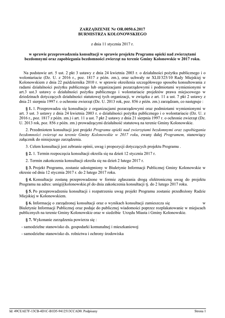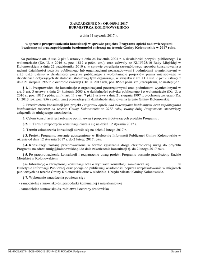 ZARZĄDZENIE Nr OR.0050.6.2017 BURMISTRZA KOLONOWSKIEGO z dnia 11 stycznia 2017 r. w sprawie przeprowadzenia konsultacji w sprawie projektu Programu opieki nad zwierzętami bezdomnymi oraz zapobiegania bezdomności zwierząt na terenie Gminy Kolonowskie w 2017 roku. Na podstawie art. 5 ust. 2 pkt 3 ustawy z dnia 24 kwietnia 2003 r. o działalności pożytku publicznego i o wolontariacie (Dz. U. z 2016 r., poz. 1817 z późn. zm.), oraz uchwały nr XLII/325/10 Rady Miejskiej w Kolonowskiem z dnia 22 października 2010 r. w sprawie określenia szczegółowego sposobu konsultowania z radami działalności pożytku publicznego lub organizacjami pozarządowymi i podmiotami wymienionymi w art.3 ust.3 ustawy o działalności pożytku publicznego i wolontariacie projektów prawa miejscowego w dziedzinach dotyczących działalności statutowej tych organizacji, w związku z art. 11 a ust. 7 pkt 2 ustawy z dnia 21 sierpnia 1997 r. o ochronie zwierząt (Dz. U. 2013 rok, poz. 856 z późn. zm.) zarządzam, co następuje : § 1. 1. Przeprowadza się konsultacje z organizacjami pozarządowymi oraz podmiotami wymienionymi w art. 3 ust. 3 ustawy z dnia 24 kwietnia 2003 r. o działalności pożytku publicznego i o wolontariacie (Dz. U. z 2016 r., poz. 1817 z późn. zm.) i art. 11 a ust. 7 pkt 2 ustawy z dnia 21 sierpnia 1997 r. o ochronie zwierząt (Dz. U. 2013 rok, poz. 856 z późn. zm.) prowadzącymi działalność statutową na terenie Gminy Kolonowskie. 2. Przedmiotem konsultacji jest projekt Programu opieki nad zwierzętami bezdomnymi oraz zapobiegania bezdomności zwierząt na terenie Gminy Kolonowskie w 2017 roku, zwany dalej Programem, stanowiący załącznik do niniejszego zarządzenia. 3. Celem konsultacji jest zebranie opinii, uwag i propozycji dotyczących projektu Programu . § 2. 1. Termin rozpoczęcia konsultacji określa się na dzień 12 stycznia 2017 r. 2. Termin zakończenia konsultacji określa się na dzień 2 lutego 2017 r. § 3. Projekt Programu, zostanie udostępniony w Biuletynie Informacji Publicznej Gminy Kolonowskie w okresie od dnia 12 stycznia 2017 r. do 2 lutego 2017 roku. § 4. Konsultacje zostaną przeprowadzone w formie zgłaszania drogą elektroniczną uwag do projektu Programu na adres: [email protected] do dnia zakończenia konsultacji tj. do 2 lutego 2017 roku. § 5. Po przeprowadzeniu konsultacji i rozpatrzeniu uwag projekt Programu zostanie przedłożony Radzie Miejskiej w Kolonowskiem. § 6. Informację o zarządzonej konsultacji oraz o wynikach konsultacji zamieszcza się w Biuletynie Informacji Publicznej oraz podaje do publicznej wiadomości poprzez rozplakatowanie w miejscach publicznych na terenie Gminy Kolonowskie oraz w siedzibie Urzędu Miasta i Gminy Kolonowskie. § 7. Wykonanie zarządzenia powierza się : - samodzielne stanowisko ds. gospodarki komunalnej i mieszkaniowej - samodzielne stanowisko ds. rolnictwa i ochrony środowiska Id: 49CEAE7F-13CB-4D1C-B1D5-9412513CCAD0. Podpisany Strona 1 § 8. Zarządzenie wchodzi w życia z dniem podpisania. Burmistrz Kolonowskiego Norbert Koston Id: 49CEAE7F-13CB-4D1C-B1D5-9412513CCAD0. Podpisany Strona 2 Załącznik do Zarządzenia Nr OR.0050.6.2017 Program opieki nad zwierzętami bezdomnymi oraz zapobiegania bezdomności zwierząt na terenie Burmistrza Kolonowskiego Gminy Kolonowskie w 2017 roku z dnia 11 stycznia 2017 r. Rozdział 1. Postanowienia ogólne § 1. Niniejsza uchwała ma zastosowanie do wszystkich zwierząt bezdomnych w rozumieniu ustawy z dnia 21 sierpnia 1997 roku o ochronie zwierząt (Dz. U. 2013 rok, poz. 856 z późn. zm.) przebywających na terenie Gminy Kolonowskie. § 2. Ilekroć w uchwale jest mowa o: 1) Gminie – należy przez to rozumieć Gminę Kolonowskie; 2) Urzędzie – należy przez to rozumieć Urząd Miasta i Gminy w Kolonowskiem; 3) Burmistrzu – należy przez to rozumieć Burmistrza Kolonowskiego; 4) samodzielne stanowiska - należy przez to rozumieć ds. gospodarki komunalnej i mieszkaniowej i samodzielne stanowisko ds. ochrony środowiska UMiG Kolonowskie; 5) ustawie – należy przez to rozumieć ustawę z dnia 21 sierpnia 1997 roku o ochronie zwierząt (Dz. U. 2013 rok, poz.856 z późn. zm.); 6) Programie – należy przez to rozumieć Program opieki nad zwierzętami bezdomnymi oraz zapobiegania bezdomności zwierząt na terenie Gminy Kolonowskie w 2017 roku. § 3. Koordynatorem niniejszego Programu jest Burmistrz, natomiast realizatorem Programu są: 1) samodzielne stanowiska; 2) schroniska dla zwierząt; 3) organizacje pozarządowe, których celem statutowym jest ochrona zwierząt. Rozdział 2. Odławianie bezdomnych zwierząt i zapewnienie im miejsca w schronisku dla zwierząt § 4. Na terenie Gminy odławianie bezdomnych zwierząt będzie następować w odniesieniu do pojedynczych zgłoszeń dotyczących pozostawionych bez opieki zwierząt, w szczególności chorych lub powodujących zagrożenie dla bezpieczeństwa. § 5. 1. Zgłoszenia o zwierzętach przebywających na terenach ogólnie dostępnych w obrębie Gminy, co do których istnieje przypuszczenie, że są bezdomne, przyjmować będą samodzielne stanowiska, które podejmą działania zmierzające do ustalenia właściciela bądź opiekuna zwierząt. 2. Interwencje w nagłych przypadkach dotyczących zwierząt należy zgłaszać pod numerem tel. 77 461 11 40 w. 30, a po godzinach urzędowania organów Gminy należy do Komisariatu Policji w Zawadzkiem pod nr tel. 77 4616 477. 3. W przypadku nieustalenia właściciela bądź opiekuna zwierzęcia, o którym mowa w ust.1, samodzielne stanowiska podejmują działania zmierzające do odłowienia zwierzęcia i umieszczenia w schronisku dla zwierząt. § 6. 1. Odłów bezdomnych zwierząt prowadzi na podstawie umowy zawartej z Gminą firma Gabi z siedzibą w Żędowicach przy ul. Dworcowej 24. 2. Odłowione zwierzęta zostaną przewiezione i umieszczone w schronisku dla zwierząt, prowadzonym przez Fundację S.O.S. dla Zwierząt z siedzibą w Chorzowie, przy ul. Anto