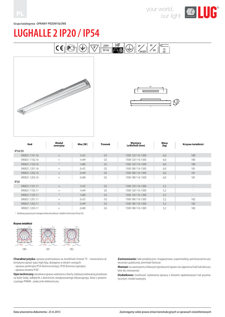 PL Grupa katalogowa: OPRAWY PRZEMYSŁOWE LUGHALLE 2 IP20 / IP54 D1 W H L Kod Moduł awaryjny Moc [W] Trzonek Wymiary LxWxHxD [mm] Masa [kg] Krzywe światłości + + 1×35 1×49 1×80 2×35 2×49 2×80 G5 G5 G5 G5 G5 G5 1500 120 116 1300 1500 120 116 1300 1500 120 116 1300 1500 180 116 1300 1500 180 116 1300 1500 180 116 1300 6,0 6,0 6,0 6,0 6,0 6,0 180 180 180 181 181 181 1×35 1×49 1×80 2×35 2×49 2×80 G5 G5 G5 G5 G5 G5 1500 120 116 1300 1500 120 116 1300 1500 120 116 1300 1500 180 116 1300 1500 180 116 1300 1500 180 116 1300 5,2 5,2 5,2 5,2 5,2 5,2 182 182 182 IP54/20 090021.1101.16 090021.1102.16 090021.1103.16 090021.1201.16 090021.1202.16 090021.1203.16 IP20 090021.1101.11 090021.1102.11 090021.1103.11 090021.1201.11 090021.1202.11 090021.1203.11 1) + + + + + 1) + + + Kombinacje powyższych rozwiązań należy konsultować z działem technicznym firmy LUG 1) Krzywa światłości BZ1 BZ2 =80% 105° 180° 75° 80 60° 90° 90° 75° 75° 60° 60° 90° 45° =90% 90° 90° 75° 45° 45° 240 30° 15° [cd/klm ] C90-C270 60° 60° 160 45° 30° 0° 45° 240 320 30° 15° I(0°)=214cd/klm C0-C180 75° 80 320 30° 180 75° 60° 320 0° 105° 160 240 15° I(0°)=300cd/klm C0-C180 180° 80 160 45° BZ2 =92% 105° 105° 90° 15° [cd/klm ] C90-C270 181 30° 30° 15° I(0°)=304cd/klm C0-C180 400 0° 15° [cd/klm ] C90-C270 182 Charakterystyka: oprawa przemysłowa na świetlówki liniowe T5 - nowoczesna alternatywa opraw typu high-bay, dostępna w dwóch wersjach: - oprawa zamknięta IP54 (komora lampy), IP20 (komora osprzętu) - oprawa otwarta IP20 Opis techniczny: obudowa oprawy wykonana z blachy stalowej malowanej proszkowo na kolor biały, odbłyśnik z aluminium anodyzowanego błyszczącego, klosz z przezroczystego PMMA , statecznik elektroniczny Data utworzenia dokumentu: 25-6-2013 Zastosowanie: hale produkcyjne i magazynowe, supermarkety, pomieszczenia użyteczności publicznej, terminale lotnicze Montaż: na zawieszeniu linkowym (producent opraw nie zapewnia linek lub łańcuszków do zwieszenia) Dodatkowo: możliwość wykonania oprawy z kloszem opalizowanym lub pryzmatycznym, moduł awaryjny Zastrzegamy sobie prawo zmian konstrukcyjnych w oprawach oświetleniowych PL Grupa katalogowa: OPRAWY PRZEMYSŁOWE LUGHALLE 2 IP20 / IP54 Nowy kod / Dotychczasowy kod 090021.1101.15 LE.010 090021.1201.15 LE.015 090021.1101.11 LE.020 090021.1201.11 LE.025 090021.1102.15 LE.011 090021.1202.15 LE.016 090021.1102.11 LE.021 090021.1202.11 LE.026 090021.1103.15 LE.012 090021.1203.15 LE.017 090021.1103.11 LE.022 090021.1203.11 LE.027 Data utworzenia dokumentu: 25-6-2013 Zastrzegamy sobie prawo zmian konstrukcyjnych w oprawach oświetleniowych