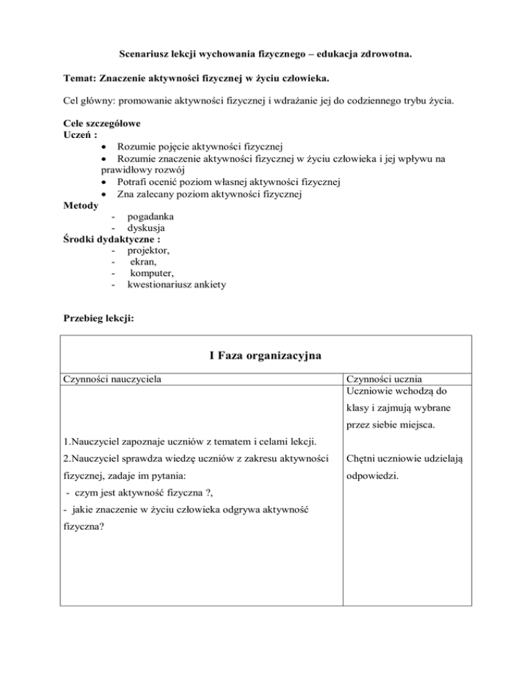 Scenariusz lekcji wychowania fizycznego – edukacja zdrowotna. Temat: Znaczenie aktywności fizycznej w życiu człowieka. Cel główny: promowanie aktywności fizycznej i wdrażanie jej do codziennego trybu życia. Cele szczegółowe Uczeń : Rozumie pojęcie aktywności fizycznej Rozumie znaczenie aktywności fizycznej w życiu człowieka i jej wpływu na prawidłowy rozwój Potrafi ocenić poziom własnej aktywności fizycznej Zna zalecany poziom aktywności fizycznej Metody - pogadanka - dyskusja Środki dydaktyczne : - projektor, - ekran, - komputer, - kwestionariusz ankiety Przebieg lekcji: I Faza organizacyjna Czynności nauczyciela Czynności ucznia Uczniowie wchodzą do klasy i zajmują wybrane przez siebie miejsca. 1.Nauczyciel zapoznaje uczniów z tematem i celami lekcji. 2.Nauczyciel sprawdza wiedzę uczniów z zakresu aktywności Chętni uczniowie udzielają fizycznej, zadaje im pytania: odpowiedzi. - czym jest aktywność fizyczna ?, - jakie znaczenie w życiu człowieka odgrywa aktywność fizyczna? II Faza realizacji 1. Rozdanie przez wyznaczonych uczniów kwestionariusza Uczniowie zaznaczają ankiety przygotowanego przez nauczyciela, zawierającego właściwą odpowiedź. następujące pytanie: 1. W ostatnich 7 dniach w ilu dniach przeznaczyłeś/łaś na aktywność fizyczną ( w tym lekcje wf ) łącznie, co najmniej 60 minut dziennie ? 0 dni 1 2 3 4 5 6 7 dni ? Nauczyciel przedstawia prezentację multimedialną dotyczącą Uczniowie po zapoznaniu się z treściami zawartymi w aktywności fizycznej. Zał. 1. prezentacji porównują odpowiedzi ze swoich ankiet z zalecanym poziomem aktywności fizycznej.( WHO, Międzynarodowy Kwestionariusz Badań dotyczących Zachowań Zdrowotnych Młodzieży Szkolnej). III Faza podsumowująca 1. Autorefleksja na temat aktywności fizycznej jako czynnika zaspokajającego potrzeby rozwojowe. 2. Zakończenie lekcji, zachęcenie uczniów do aktywnego stylu życia. LITERATURA: 1. . Cabak A., Woynarowska B. :Aktywność fizyczna młodzieży w wieku 11-15 lat w Polsce i w innych krajach w 2002 roku. Wychowanie Fizyczne i Sport 2004 2. Kozłowski S. 1987 Znaczenie aktywności ruchowej w rozwoju fizycznym człowieka. 3. Procharska, J.J., Sallis, J.F., Long B., 2001 4. Kozłowski S., Nazar K., Wprowadzenie do fizjologii klinicznej. PZWL. Warszawa 1984. 5. .Caspersen i wsp., Physical activity and physical fitness: definitions and distinctions for health – related research. Public Health Reports 1985.