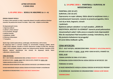 LETNIE WYCIECZKI Z GOKiS 2016 1. 05 LIPIEC 2016 r. BOGILU W JABŁONNEJ (kl. O – III) KRAINA ZABAWY BOGILU To miejsce, które pozwala na relaks i wspaniałą zabawę! oraz gdzie spełniamy dziecięce marzenia. Na powierzchni niemal 5 ha każdy – duży i mały - znajdzie coś dla siebie. Do dyspozycji gości mamy: 1. Ogromny Labirynt 2. Labirynt ,,Kraina zabawy” 3. Tor przeszkód „Dżungla” 4. Wioska Smerfów 5. Zjeżdżalnia „Delfin” 6. Kolorowa Lokomotywa 7. Trampolina Oprócz tego: stożek wspinaczkowy, cymbergaje, stoły bilardowe, stół to tenisa. Do dyspozycji dzieci w namiocie znajdują się samochodziki, hulajnogi, jeździki, domki i wiele innych zabawek. Ponadto na terenie zadaszonym znajduje się Mini Bar, oferujący ciepłe i zimne przekąski, słodycze, napoje oraz niskoprocentowe alkohole. Specjalna strefa Malucha zapewni najmłodszym moc atrakcji. Do dyspozycji domki, basen z piłeczkami, zabawki, jeździki. CENA WYCIECZKI: 2. 14 LIPIEC 2016 r. PAINTBALL I SURVIVAL W MOSZOWICACH PAINTBALL (OD 10 LAT) SURVIVAL ( DO 10 LAT) Zapraszamy na super zabawę. Gdzie ubrani w wojskowe moro, z pomalowanymi twarzami, ruszacie na przeciw przygodzie, która czai się w lesie, bagnach, ruinach i jaskiniach. Będziecie jednym odziałem i w myśl zasadzie: „JEDEN ZA WSZYSTKICH, WSZYSCY ZA JEDNEGO” stanecie przed pokonaniem niesamowitych zadań i tylko praca w zespole może doprowadzić Was do zwycięstwa! Nad wszystkim czuwają instruktorzy, ale to Wy jesteście bohaterem tej przygody! W cenie biletu kiełbaski z grilla. CENA WYCIECZKI: 50 zł – BILET WSTĘPU, UBEZBIECZENIE NNW (PROSIMY O WYLICZONĄ KWOTĘ ) WYJAZD 14.07.2016 r. O GODZ 10:30 SPOD GOKIS W KOTLI, POWRÓT OK. GODZ. 14:30 40 zł – BILET WSTĘPU, UBEZBIECZENIE NNW, AUTOBUS (PROSIMY O WYLICZONĄ KWOTĘ ) TERMIN ZAPISÓW DO DNIA: 07.07.2016 r. WYJAZD 05.07.2016 r. O GODZ 10:00 SPOD GOKIS W KOTLI, POWRÓT OK. GODZ. 17:00 WYMAGANA ZGODA RODZICÓW NA UDZAŁ DZIECKA W WYCIECZCE (DO TERMIN ZAPISÓW DO DNIA: 01.07.2016 r. WYMAGANA ZGODA RODZICÓW NA UDZAŁ DZIECKA W WYCIECZCE (DO POBRANIA W GOKiS) POBRANIA W GOKiS) W RAZIE NIEMOŻNOŚCI WZIĘCIA UDZIAŁU DZIECKA W WYCIECZCE PROSIMY O WCZEŚNIEJSZE W RAZIE NIEMOŻNOŚCI WZIĘCIA UDZIAŁU DZIECKA W WYCIECZCE PROSIMY ZGŁOSZENIE DO ORGANIZATORA! UWAGA ILOŚĆ MIEJSC OGRANICZONA! O WCZEŚNIEJSZE ZGŁOSZENIE DO ORGANIZATORA! UWAGA ILOŚĆ MIEJSC OGRANICZONA! 3. 26 LIPIEC 2016 r. REJS STATKIEM LAGUNA W GŁOGOWIE (kl. I – VI) CZAS TRWANIA REJSU - 1 h Zwiedzanie doliny środkowej odry. Wyjście do restauracji mcdonald´s. CENA WYCIECZKI: 4. 04 SIERPIEŃ 2016 r. ,,PARK LINOWY TARZAN” W LESZNIE ( kl. IV – VI) i gimnazjum Atrakcyjny, bezpieczny tor przeszkód rozpięty między drzewami zapewniający niezapomniane wrażenia, adrenalinę i wysiłek fizyczny na świerzym powietrzu. Sport ekstramalny pod nadzoren wykfalifikowanych instruktorów. 13 zł – BILET WSTĘPU, UBEZBIECZENIE NNW (PROSIMY O WYLICZONĄ CENA WYCIECZKI: KWOTĘ ) 30 zł – BILET WSTĘPU, UBEZBIECZENIE NNW , AUTOBUS WYJAZD 26.07.2016 r. O GODZ 10:00 SPOD GOKIS W KOTLI, POWRÓT OK. GODZ. 14:30 (PROSIMY O WYLICZONĄ KWOTĘ ) TERMIN ZAPISÓW DO DNIA: 22.07.2016 r. WYJAZD 04.08.2016 r. O GODZ. 9:30 SPOD GOKIS W KOTLI, WYMAGANA ZGODA RODZICÓW NA UDZAŁ DZIECKA W WYCIECZCE (DO POBRANIA W GOKiS) POWRÓT OK. GODZ.15:00 W RAZIE NIEMOŻNOŚCI WZIĘCIA UDZIAŁU DZIECKA W WYCIECZCE PROSIMY O WCZEŚNIEJSZE WYMAGANA ZGODA RODZICÓW NA UDZAŁ DZIECKA W WYCIECZCE (DO POBRANIA W GOKiS) ZGŁOSZENIE DO ORGANIZATORA! UWAGA ILOŚĆ MIEJSC OGRANICZONA! TERMIN ZAPISÓW DO DNIA: 29.07.2016 r. W RAZIE NIEMOŻNOŚCI WZIĘCIA UDZIAŁU DZIECKA W WYCIECZCE PROSIMY O WCZEŚNIEJSZE ZGŁOSZENIE DO ORGANIZATORA! UWAGA ILOŚĆ MIEJSC OGRANICZONA! 5. 18 SIERPIEŃ 2016 r. KINO CINEMA 3D W GŁOGOWIE (kl. I – VI) 7. 30 SIERPIEŃ 2016 r. CENTRUM PRZYRODNICZE I PLANETARIUM WENUS W ZIELONEJ GÓRZE (kl. I – VI) i gimnazjum CENTRUM PRZYRODNICZE CENA ok. 25 zł Więcej informacji w dalszym terminie 6. 23 SIERPIEŃ 2016 r. ,,ZAMEK KSIĄŻ” W WAŁBRZYCHU (kl. III – VI) i gimnazjum Zamek Książ jest jednym z największych zamków w Polsce i Europie i jednocześnie największym zamkiem na Dolnym Śląsku. Zbudowany na urwistym skalnym cyplu, na wysokości 395 m n.p.m., otoczony głęboką kotliną porośniętą lasem. Niegdyś nazywany był „perłą Śląska”, a także „zamkiem z bajki”. Położony na terenie Książańskiego Parku Krajobrazowego jest budowlą charakteryzującą się różnymi stylami architektury, posiadającą ponad 400 pomieszczeń. CENA WYCIECZKI: 50zł – BILET WSTĘPU, UBEZBIECZENIE NNW , AUTOBUS (PROSIMY O WYLICZONĄ KWOTĘ ) WYJAZD 23.08.2016 r. O GODZ. 9:00 SPOD GOKIS W KOTLI, POWRÓT OK. GODZ. 17:30 TERMIN ZAPISÓW DO DNIA: 19.08.2016 r. WYMAGANA ZGODA RODZICÓW NA UDZAŁ DZIECKA W WYCIECZCE (DO POBRANIA W GOKiS) W RAZIE NIEMOŻNOŚCI WZIĘCIA UDZIAŁU DZIECKA W WYCIECZCE PROSIMY O WCZEŚNIEJSZE ZGŁOSZENIE DO ORGANIZATORA! UWAGA ILOŚĆ MIEJSC OGRANICZONA! ODKRYWAMY WSZYSTKIMI ZMYSŁAMI TAJEMNICE NATURY I NAUKI W zielonogórskim Centrum znajdują się ekspozycje stałe i czasowe. Stałe, to stanowiska interaktywne, gdzie wszystkiego wręcz należy dotknąć, które odnoszą się do różnych dziedzin nauki: fizyki, biologii, nauki o człowieku i Ziemi. W poznaniu wszystkiego pomagają pracownicy Centrum, specjaliści z różnych dziedzin nauki, którzy opowiadają np. o tym jak działa ludzkie oko, zmierzą naszą przewodność elektryczną, nasz puls, objaśnią jak działa „armata” powietrzna, jaką gęstość mają różne ciecze i jak wyglądają różne tkanki pod mikroskopem. Planetarium Wenus. Planetarium, umiejscowione niemal w samym centrum Zielonej Góry, jest obiektem wyjątkowym przede wszystkim dzięki zainstalowaniu ruchomej kopuły, której masa to prawie 3 tony, średnica wynosi 10 metrów. Zielonogórskie Planetarium wyposażone jest w kopułę wykonaną w technologii NanoSeam który,