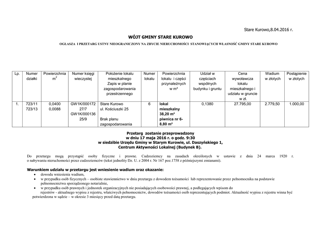 Stare Kurowo,8.04.2016 r. WÓJT GMINY STARE KUROWO OGŁASZA I PRZETARG USTNY NIEOGRANICZONY NA ZBYCIE NIERUCHOMOŚCI STANOWIĄCYCH WŁASNOŚĆ GMINY STARE KUROWO Lp. Numer działki Powierzchnia 2 m Numer księgi wieczystej 1. 723/11 723/13 0,0400 0,0088 GW1K/000172 27/7 GW1K/000136 25/9 Położenie lokalu mieszkalnego Zapis w planie zagospodarowania przestrzennego Stare Kurowo ul. Kościuszki 25 Brak planu zagospodarowania Numer lokalu 6 Powierzchnia lokalu i części przynależnych w m² lokal mieszkalny 38,20 m² piwnica nr 68,80 m² Udział w częściach wspólnych budynku i gruntu 0,1380 Cena wywoławcza lokalu mieszkalnego i udziału w gruncie w zł. 27.795,00 Wadium w złotych Postąpienie w złotych 2.779,50 1.000,00 Przetarg zostanie przeprowadzony w dniu 17 maja 2016 r. o godz. 9:30 w siedzibie Urzędu Gminy w Starym Kurowie, ul. Daszyńskiego 1, Centrum Aktywności Lokalnej (Budynek B). Do przetargu mogą przystąpić osoby fizyczne i prawne. Cudzoziemcy na zasadach określonych w ustawie o nabywaniu nieruchomości przez cudzoziemców (tekst jednolity Dz. U. z 2004 r. Nr 167 poz.1758 z późniejszymi zmianami). z dnia 24 marca 1920 r. Warunkiem udziału w przetargu jest wniesienie wadium oraz okazanie: dowodu wniesienia wadium, w przypadku osób fizycznych – osobiste stawiennictwo w dniu przetargu z dowodem tożsamości lub reprezentowanie przez pełnomocnika na podstawie pełnomocnictwa sporządzonego notarialnie, w przypadku osób prawnych i jednostek organizacyjnych nie posiadających osobowości prawnej, a podlegających wpisom do rejestrów - aktualnego wypisu z rejestru, właściwych pełnomocnictw, dowodów tożsamości osób reprezentujących podmiot. Aktualność wypisu z rejestru winna być potwierdzona w sądzie – w okresie 3 miesięcy przed datą przetargu. Wadium należy wnieść najpóźniej do dnia 12 maja 2016 .r. – włącznie. Za termin wpłaty wadium w formie przelewu uznaje się dzień obciążenia rachunku bankowego uczestnika lub datę stempla potwierdzającego dokonanie wpłaty (z zaznaczeniem, której nieruchomości dotyczy) na rachunek Urzędu Gminy w Starym Kurowie BS O/Stare Kurowo Nr 60 8362 0005 0260 0912 2000 0020 Wadium osoby wygrywającej przetarg zalicza się na poczet ceny nabycia nieruchomości. Pozostałym uczestnikom przetargu wadium zostanie zwrócone po przetargu, nie później niż przed upływem 3 dni od dnia zamknięcia przetargu. Wadium ulega przepadkowi na rzecz Gminy w razie uchylenia się osoby wygrywającej przetarg od zawarcia umowy w formie aktu notarialnego. INFORMACJE DODATKOWE 1)Cena nieruchomości gruntowej osiągnięta w przetargu, płatna jest jednorazowo przed zawarciem umowy w formie aktu notarialnego. 2)Działka nie jest objęta miejscowym planem zagospodarowania przestrzennego i nie znajduje się w obszarze obowiązkowego sporządzenia planu na podstawie studium uwarunkowań i kierunków zagospodarowania przestrzennego gminy Stare Kurowo. Działka może być zabudowana na podstawie decyzji o warunkach zabudowy. 3)Nieruchomość jest wolna od jakichkolwiek obciążeń. 4)Nabywca nieruchomości zobowiązany jest przed rozpoczęciem inwestycji dokonać wyłączenia gruntów z produkcji rolnej i uiścić stosowne opłaty. 5)Termin do złożenia wniosku przez osoby, którym przysługuje pierwszeństwo w nabyciu nieruchomości na podstawie art. 34 ust.1 pkt. 1 i pkt. 2 ustawy o gospodarce nieruchomościami upłynął dla nieruchomości opisanych w powyższej tabeli: poz.1 -7.04.2016 r. 6)Opłaty notarialne i sądowe związane z zawarciem umowy w formie aktu notarialnego oraz założeniem i wpisem do księgi wieczystej, koszty związane z okazaniem granic w całości ponosi nabywca nieruchomości. 7)Wójt Gminy stosownie do art. 41 ust. 1 ustawy z dnia 21 sierpnia 1997 r. o gospodarce nieruchomościami (t. j. Dz. U. z 2015r. poz.1774) obowiązany jest w terminie 21 dni od dnia rozstrzygnięcia przetargu, zawiadomić osobę ustaloną jako nabywca nieruchomości o miejscu i terminie zawarcia umowy w formie aktu notarialnego. 8) O miejscu i terminie zawarcia umowy w formie aktu notarialnego nabywca zostanie powiadomiony odrębnym pismem. Jeżeli osoba ustalona jako nabywca nieruchomości nie przystąpi bez usprawiedliwienia do zawarcia umowy w miejscu i terminie podanym w zawiadomieniu, Wójt Gminy może odstąpić od zawarcia umowy, a wpłacone wadium nie podlega zwrotowi. 9) Nabywca na usunięcie drzew winien uzyskać pozwolenie zgodnie z ustawą o ochronie przyrody. 10) Z dniem podpisania umowy w formie aktu notarialnego na nabywcę przechodzą wszelkie ciężary i korzyści związane z nieruchomością. 11) Cudzoziemiec nie będący obywatelem lub przedsiębiorcą państw członkowskich Europejskiego Obszaru Gospodarczego ustalony nabywcą, zobowiązany będzie do: -zawarcia umowy przedwstępnej, - uzyskania w terminie 3 miesięcy od daty podpisania umowy przedwstępnej zezwolenia Ministra Spraw Wewnętrznych i Administracji na nabycie prawa własności nieruchomości gruntowej, - zawarcia umowy przenoszącej własność nieruchomości w terminie jednego miesiąca, po uzyskaniu zezwolenia Ministra Spraw Wewnętrznych i Administracji na nabycie przedmiotowej nieruchomości. 12.Na przedmiotowej nieruchomości nie były wznawiane znaki graniczne. Nabywca we własnym zakresie i na własny koszt może wznowić znaki graniczne. Przed przystąpieniem do przetargu należy zapoznać się z warunkami przetargu: Dodatkowych informacji dotyczących nieruchomości oraz przetargów udziela Referat Infrastruktury Gospodarki Komunalnej i Rolnictwa tutejszego nr telefonu (95)7615052 wew.334 Ogłoszenie o przetargu dostępne jest również w na stronie internetowej pod adresem http://www.bip.wrota.lubuskie.pl/ugstarekurowo. Wójt Gminy zastrzega sobie prawo odwołania przetargu z ważnych przyczyn. Wójt Gminy (-) Wiesław Własak Urzędu,