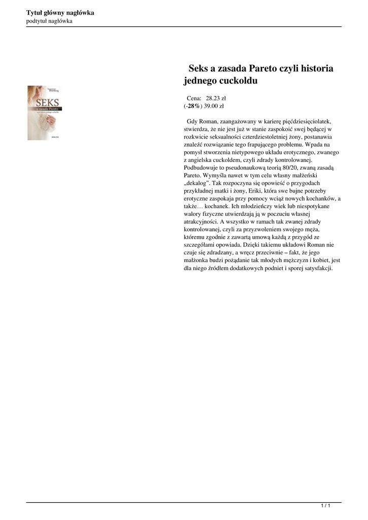Tytuł główny nagłówka podtytuł nagłówka Seks a zasada Pareto czyli historia jednego cuckoldu Cena: 28.23 zł (-28%) 39.00 zł Gdy Roman, zaangażowany w karierę pięćdziesięciolatek, stwierdza, że nie jest już w stanie zaspokoić swej będącej w rozkwicie seksualności czterdziestoletniej żony, postanawia znaleźć rozwiązanie tego frapującego problemu. Wpada na pomysł stworzenia nietypowego układu erotycznego, zwanego z angielska cuckoldem, czyli zdrady kontrolowanej. Podbudowuje to pseudonaukową teorią 80/20, zwaną zasadą Pareto. Wymyśla nawet w tym celu własny małżeński „dekalog”. Tak rozpoczyna się opowieść o przygodach przykładnej matki i żony, Eriki, która swe bujne potrzeby erotyczne zaspokaja przy pomocy wciąż nowych kochanków, a także… kochanek. Ich młodzieńczy wiek lub niespotykane walory fizyczne utwierdzają ją w poczuciu własnej atrakcyjności. A wszystko w ramach tak zwanej zdrady kontrolowanej, czyli za przyzwoleniem swojego męża, któremu zgodnie z zawartą umową każdą z przygód ze szczegółami opowiada. Dzięki takiemu układowi Roman nie czuje się zdradzany, a wręcz przeciwnie – fakt, że jego małżonka budzi pożądanie tak młodych mężczyzn i kobiet, jest dla niego źródłem dodatkowych podniet i sporej satysfakcji. 1/1 Powered by TCPDF (www.tcpdf.org)