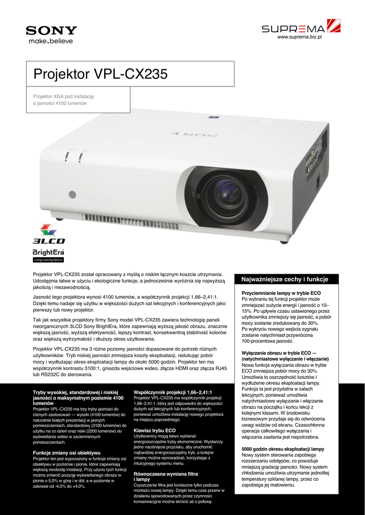 Projektor VPL-CX235 Projektor XGA pod instalację o jasności 4100 lumenów Projektor VPL-CX235 został opracowany z myślą o niskim łącznym koszcie utrzymania. Udostępnia łatwe w użyciu i ekologiczne funkcje, a jednocześnie wyróżnia się najwyższą jakością i niezawodnością. Jasność tego projektora wynosi 4100 lumenów, a współczynnik projekcji 1,66–2,41:1. Dzięki temu nadaje się użytku w większości dużych sal lekcyjnych i konferencyjnych jako pierwszy lub nowy projektor. Tak jak wszystkie projektory firmy Sony model VPL-CX235 zawiera technologię paneli nieorganicznych 3LCD Sony BrightEra, które zapewniają wyższą jakość obrazu, znacznie większą jasność, wyższą efektywność, lepszy kontrast, konsekwentną stabilność kolorów oraz większą wytrzymałość i dłuższy okres użytkowania. Projektor VPL-CX235 ma 3 różne poziomy jasności dopasowane do potrzeb różnych użytkowników. Tryb niskiej jasności zmniejsza koszty eksploatacji, redukując pobór mocy i wydłużając okres eksploatacji lampy do około 5000 godzin. Projektor ten ma współczynnik kontrastu 3100:1, gniazda wejściowe wideo, złącze HDMI oraz złącza RJ45 lub RS232C do sterowania. Tryby wysokiej, standardowej i niskiej jasności o maksymalnym poziomie 4100 lumenów Projektor VPL-CX235 ma trzy tryby jasności do różnych zastosowań — wysoki (4100 lumenów) do naturalnie białych prezentacji w jasnych pomieszczeniach, standardowy (3100 lumenów) do użytku na co dzień oraz niski (2200 lumenów) do wyświetlania wideo w zaciemnionych pomieszczeniach. Funkcje zmiany osi obiektywu Projektor ten jest wyposażony w funkcje zmiany osi obiektywu w poziomie i pionie, które zapewniają większą swobodę instalacji. Przy użyciu tych funkcji można zmienić pozycję wyświetlanego obrazu w pionie o 5,0% w górę i w dół, a w poziomie w zakresie od -4,0% do +4,0%. Współczynnik projekcji 1,66–2,41:1 Projektor VPL-CX235 ma współczynnik projekcji 1,66–2,41:1, który jest odpowiedni do większości dużych sal lekcyjnych lub konferencyjnych, ponieważ umożliwia instalację nowego projektora na miejscu poprzedniego. Klawisz trybu ECO Użytkownicy mogą łatwo wybierać energooszczędne tryby ekonomiczne. Wystarczy jedno naciśnięcie przycisku, aby uruchomić najbardziej energooszczędny tryb, a kolejne zmiany można wprowadzać, korzystając z intuicyjnego systemu menu. Równoczesna wymiana filtra i lampy Czyszczenie filtra jest konieczne tylko podczas montażu nowej lampy. Dzięki temu czas przerw w działaniu spowodowanych przez czynności konserwacyjne można skrócić aż o połowę. Najważniejsze cechy i funkcje Przyciemnianie lampy w trybie ECO Po wybraniu tej funkcji projektor może zmniejszać zużycie energii i jasność o 10– 15%. Po upływie czasu ustawionego przez użytkownika zmniejszy się jasność, a pobór mocy zostanie zredukowany do 30%. Po wykryciu nowego wejścia sygnału zostanie natychmiast przywrócona 100-procentowa jasność. Wyłączanie obrazu w trybie ECO — (natychmiastowe wyłączanie i włączanie) Nowa funkcja wyłączania obrazu w trybie ECO zmniejsza pobór mocy do 30%. Umożliwia to oszczędność kosztów i wydłużenie okresu eksploatacji lampy. Funkcja ta jest przydatna w salach lekcyjnych, ponieważ umożliwia natychmiastowe wyłączanie i włączanie obrazu na początku i końcu lekcji z kolejnymi klasami. W środowisku biznesowym przydaje się do odwrócenia uwagi widzów od ekranu. Czasochłonna operacja całkowitego wyłączania i włączania zasilania jest niepotrzebna. 5000 godzin okresu eksploatacji lampy Nowy system sterowania zapobiega rozszerzaniu odstępów, co powoduje mniejszą gradację jasności. Nowy system chłodzenia umożliwia utrzymanie jednolitej temperatury szklanej lampy, przez co zapobiega jej matowieniu. Inne funkcje Regulacja zniekształcenia trapezowego w pionie Projektor może skorygować zniekształcenia trapezowe w zakresie +/- 30% w pionie i +/-20% w poziomie. Umożliwia to optymalne ustawienie projektora. (Jest to korekcja elektroniczna, a zatem może nieco obniżyć jakość obrazu). Powiększenie cyfrowe Funkcja powiększenia cyfrowego umożliwia maksymalnie czterokrotne powiększenie na ekranie wybranego obszaru obrazu pobranego z komputera. Wiele trybów obrazu Projektor VPL-CX235 oferuje sześć trybów obrazu (dynamiczny, standardowy, gry, salon, kino i prezentacja), które umożliwiają dostosowanie obrazu w zależności od rodzaju materiału źródłowego. Technologia BrightEra 3LCD Nieorganiczne panele Sony BrightEra TFT 3LCD o rozmiarach 0,63 cala zapewniają zwiększoną odporność na działanie światła, lepszą rozdzielczość, wysoką jasność i zwiększoną niezawodność. Smart APA (automatyczna korekcja pikseli) Gdy źródłem obrazu jest komputer, funkcja APA automatycznie optymalizuje ostrość, fazę i przesunięcie. Te wartości można również dostosować ręcznie. Automatyczne wyszukiwanie sygnału wejściowego Funkcja automatycznego wyszukiwania sygnału wejściowego wykrywa, przez które wejście jest przesyłany sygnał i automatycznie przełącza projektor na to wejście. Ułatwia to skonfigurowanie projektora przed przeprowadzeniem prezentacji. Wyłączenie obrazu W przypadku konieczności wyłączenia obrazu wystarczy nacisnąć jeden przycisk na pilocie. Spowoduje to jednoczesne wyciszenie dźwięku. Dostępny jest również osobny przycisk umożliwiający tylko wyciszenie dźwięku. Przełącznik dźwięku W celu wyeliminowania konieczności zastosowania osobnego przełącznika dźwięku projektor można przełączać między dwoma źródłami dźwięku, a dźwięk można skierować przez wybrane wyjście audio do wzmacniacza w pomieszczeniu. Funkcja blokowania obrazu Funkcja blokowania obrazu umożliwia przeglądanie podczas prezentacji innych materiałów na ekranie komputera bez wiedzy widzów. Po zablokowaniu wyświetlanego obrazu można korzystać z komputer