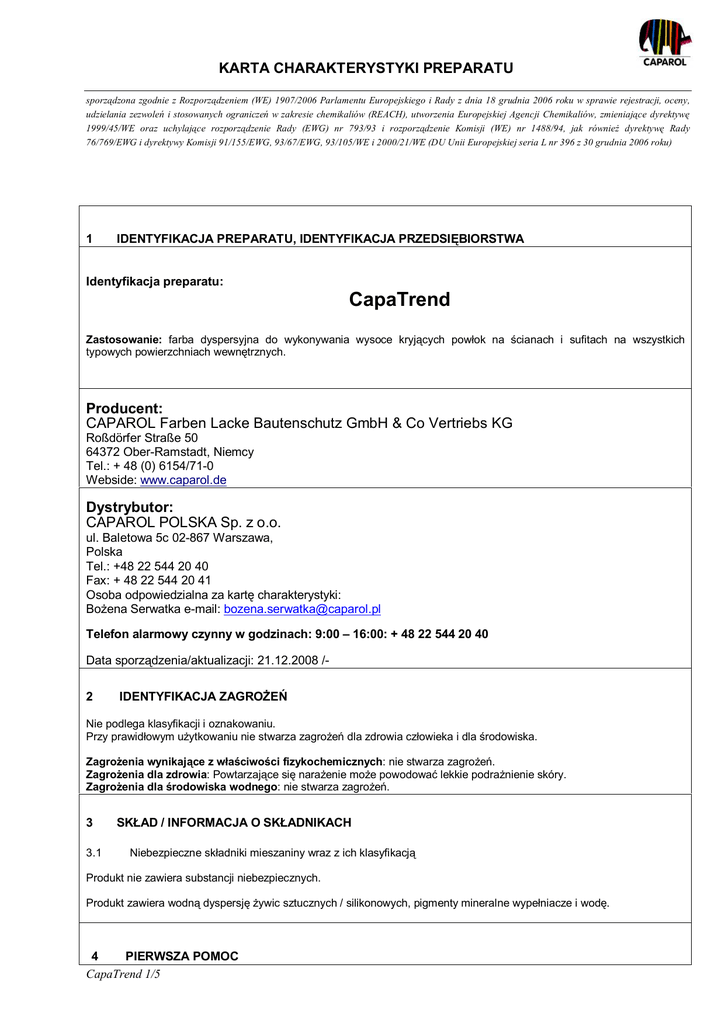 KARTA CHARAKTERYSTYKI PREPARATU sporządzona zgodnie z Rozporządzeniem (WE) 1907/2006 Parlamentu Europejskiego i Rady z dnia 18 grudnia 2006 roku w sprawie rejestracji, oceny, udzielania zezwoleń i stosowanych ograniczeń w zakresie chemikaliów (REACH), utworzenia Europejskiej Agencji Chemikaliów, zmieniające dyrektywę 1999/45/WE oraz uchylające rozporządzenie Rady (EWG) nr 793/93 i rozporządzenie Komisji (WE) nr 1488/94, jak również dyrektywę Rady 76/769/EWG i dyrektywy Komisji 91/155/EWG, 93/67/EWG, 93/105/WE i 2000/21/WE (DU Unii Europejskiej seria L nr 396 z 30 grudnia 2006 roku) 1 IDENTYFIKACJA PREPARATU, IDENTYFIKACJA PRZEDSIĘBIORSTWA Identyfikacja preparatu: CapaTrend Zastosowanie: farba dyspersyjna do wykonywania wysoce kryjących powłok na ścianach i sufitach na wszystkich typowych powierzchniach wewnętrznych. Producent: CAPAROL Farben Lacke Bautenschutz GmbH & Co Vertriebs KG Roßdörfer Straße 50 64372 Ober-Ramstadt, Niemcy Tel.: + 48 (0) 6154/71-0 Webside: www.caparol.de Dystrybutor: CAPAROL POLSKA Sp. z o.o. ul. Baletowa 5c 02-867 Warszawa, Polska Tel.: +48 22 544 20 40 Fax: + 48 22 544 20 41 Osoba odpowiedzialna za kartę charakterystyki: Bożena Serwatka e-mail: [email protected] Telefon alarmowy czynny w godzinach: 9:00 – 16:00: + 48 22 544 20 40 Data sporządzenia/aktualizacji: 21.12.2008 /2 IDENTYFIKACJA ZAGROŻEŃ Nie podlega klasyfikacji i oznakowaniu. Przy prawidłowym użytkowaniu nie stwarza zagrożeń dla zdrowia człowieka i dla środowiska. Zagrożenia wynikające z właściwości fizykochemicznych: nie stwarza zagrożeń. Zagrożenia dla zdrowia: Powtarzające się narażenie może powodować lekkie podrażnienie skóry. Zagrożenia dla środowiska wodnego: nie stwarza zagrożeń. 3 3.1 SKŁAD / INFORMACJA O SKŁADNIKACH Niebezpieczne składniki mieszaniny wraz z ich klasyfikacją Produkt nie zawiera substancji niebezpiecznych. Produkt zawiera wodną dyspersję żywic sztucznych / silikonowych, pigmenty mineralne wypełniacze i wodę. 4 PIERWSZA POMOC CapaTrend 1/5 KARTA CHARAKTERYSTYKI PREPARATU sporządzona zgodnie z Rozporządzeniem (WE) 1907/2006 Parlamentu Europejskiego i Rady z dnia 18 grudnia 2006 roku w sprawie rejestracji, oceny, udzielania zezwoleń i stosowanych ograniczeń w zakresie chemikaliów (REACH), utworzenia Europejskiej Agencji Chemikaliów, zmieniające dyrektywę 1999/45/WE oraz uchylające rozporządzenie Rady (EWG) nr 793/93 i rozporządzenie Komisji (WE) nr 1488/94, jak również dyrektywę Rady 76/769/EWG i dyrektywy Komisji 91/155/EWG, 93/67/EWG, 93/105/WE i 2000/21/WE (DU Unii Europejskiej seria L nr 396 z 30 grudnia 2006 roku) 4.1 Instrukcje postępowania w zależności od drogi narażenia Wdychanie: Kontakt z oczami: Kontakt ze skórą: Połknięcie: Ogólne zalecenia: Wskazówki dla lekarza: 5 5.1 5.2 5.3 5.4 6 6.1 6.2 6.3 7 7.1 7.2 8 Wynieść poszkodowanego z miejsca narażenia, ułożyć w wygodnej pozycji półleżącej lub siedzącej, zapewnić spokój, chronić przed utratą ciepła. Jeżeli wystąpią zaburzenia oddychania, podawać tlen do oddychania. Jeżeli objawy nie ustępują, wezwać lekarza. Natychmiast płukać dużą ilością letniej wody, najlepiej bieżącej, przez co najmniej 15 min. Usunąć szkła kontaktowe. Unikać silnego strumienia wody ze względu na ryzyko mechanicznego uszkodzenia rogówki. Jeżeli podrażnienie nie ustępuje, należy skonsultować się z lekarzem-okulistą. Obficie zmywać letnią, bieżącą wodą. Zdjąć zanieczyszczoną odzież. Jeśli podrażnienie nie ustępuje, zasięgnąć porady lekarza. Jeżeli nastąpi połknięcie, nie powodować wymiotów. Jeżeli poszkodowany jest przytomny podać do wypicia dużą ilość wody. Powinny być przestrzegane zwykłe środki ostrożności jak przy pracy z chemikaliami. Jeżeli wystąpią jakiekolwiek niepokojące objawy, wezwać lekarza. Stosować leczenie objawowe POSTĘPOWANIE W PRZYPADKU POŻARU Zalecane środki gaśnicze Piana odporna na działanie alkoholu, dwutlenek węgla, proszki gaśnicze, woda – prądy rozproszone. Pojemniki nie objęte pożarem, narażone na działanie ognia, chłodzić rozproszonym strumieniem wody. Zabronione środki gaśnicze Zwarty strumień wody. Niebezpieczne produkty rozkładu W czasie pożaru mogą powstawać tlenki węgla (CO, CO2). Specjalistyczny sprzęt przeciwpożarowy Zakładać gazoszczelną odzież ochronną i aparaty oddechowe niezależne od powietrza z otoczenia. Zbiorniki narażone na działanie ognia chłodzić wodą z bezpiecznej odległości. Wodę gaśniczą zbierać osobno, nie wylewać do kanalizacji. POSTĘPOWANIE W PRZYPADKU NIEZAMIERZONEGO UWOLNIENIA DO ŚRODOWISKA Zagrożenia dla zdrowia i środki ochrony ludzi Środki ostrożności: Zlikwidować wyciek – zamknąć dopływ cieczy, uszczelnić, uszkodzone opakowanie umieścić w opakowaniu zastępczym. Zapewnić odpowiednią wentylację. Nakładać odzież ochronną i rękawice. Nie wdychać oparów. Zagrożenia dla środowiska i środki ochrony środowiska Zabezpieczyć przed wprowadzeniem do miejskiego systemu wodno-kanalizacyjnego i cieków wodnych. Metody unieszkodliwiania, zbierania i oczyszczania środowiska Rozlany produkt zaabsorbować w chemicznie obojętny materiał wiążący (piasek, ziemia okrzemkowa), przenieść do szczelnie zamykanych pojemników. Przekazać do utylizacji. Zanieczyszczoną powierzchnię spłukać dużą ilością wody. POSTĘPOWANIE Z PREPARATEM I JEGO MAGAZYNOWANIE Postępowanie z preparatem - środki ostrożności Stosować tylko w dobrze wentylowanych pomieszczeniach. Wskazane jest podejmowanie środków ostrożności, aby podczas pracy z produktem unikać kontaktu ze skórą i oczami. Wprowadzić zakaz jedzenia, picia i palenia. Myć ręce podczas przerw i po zakończonej pracy. Zanieczyszczone ubranie natychmiast zdjąć, uprać przed ponownym założeniem. Przechowywanie Przechowywać w oryginalnych opakowaniach, w chłodnym, suchym i dobrze wentylowanym pomieszczeniu. Zabe